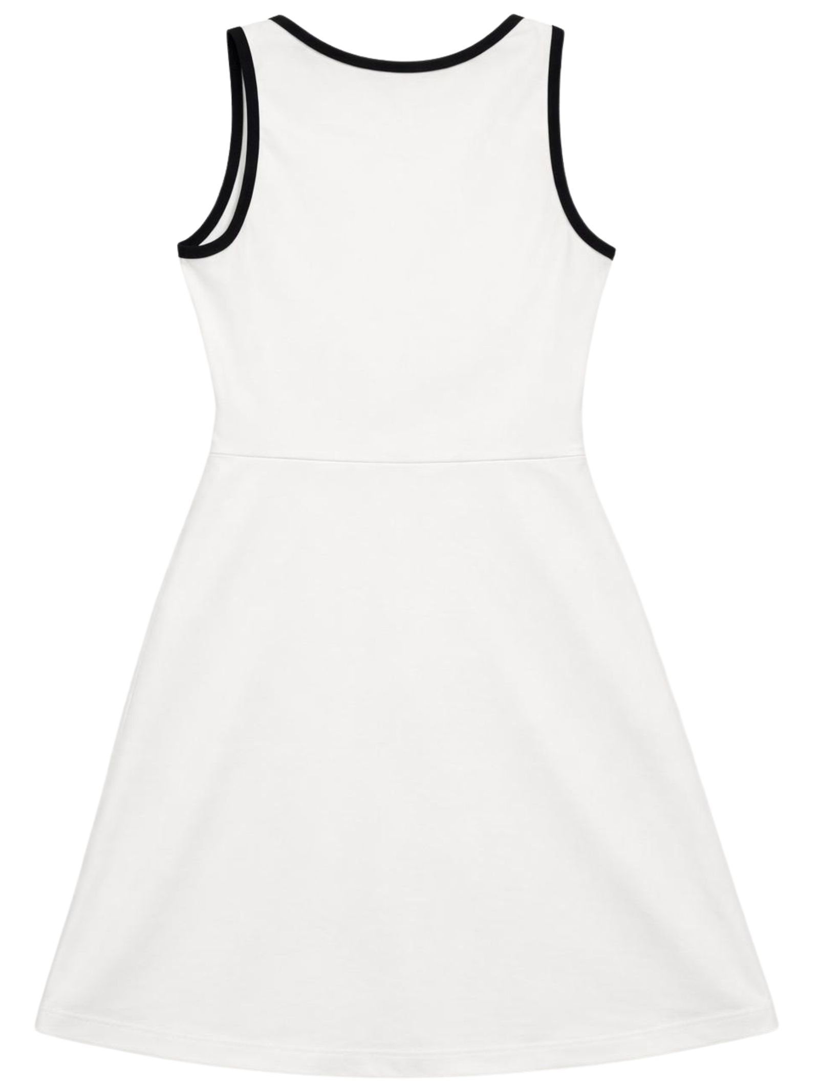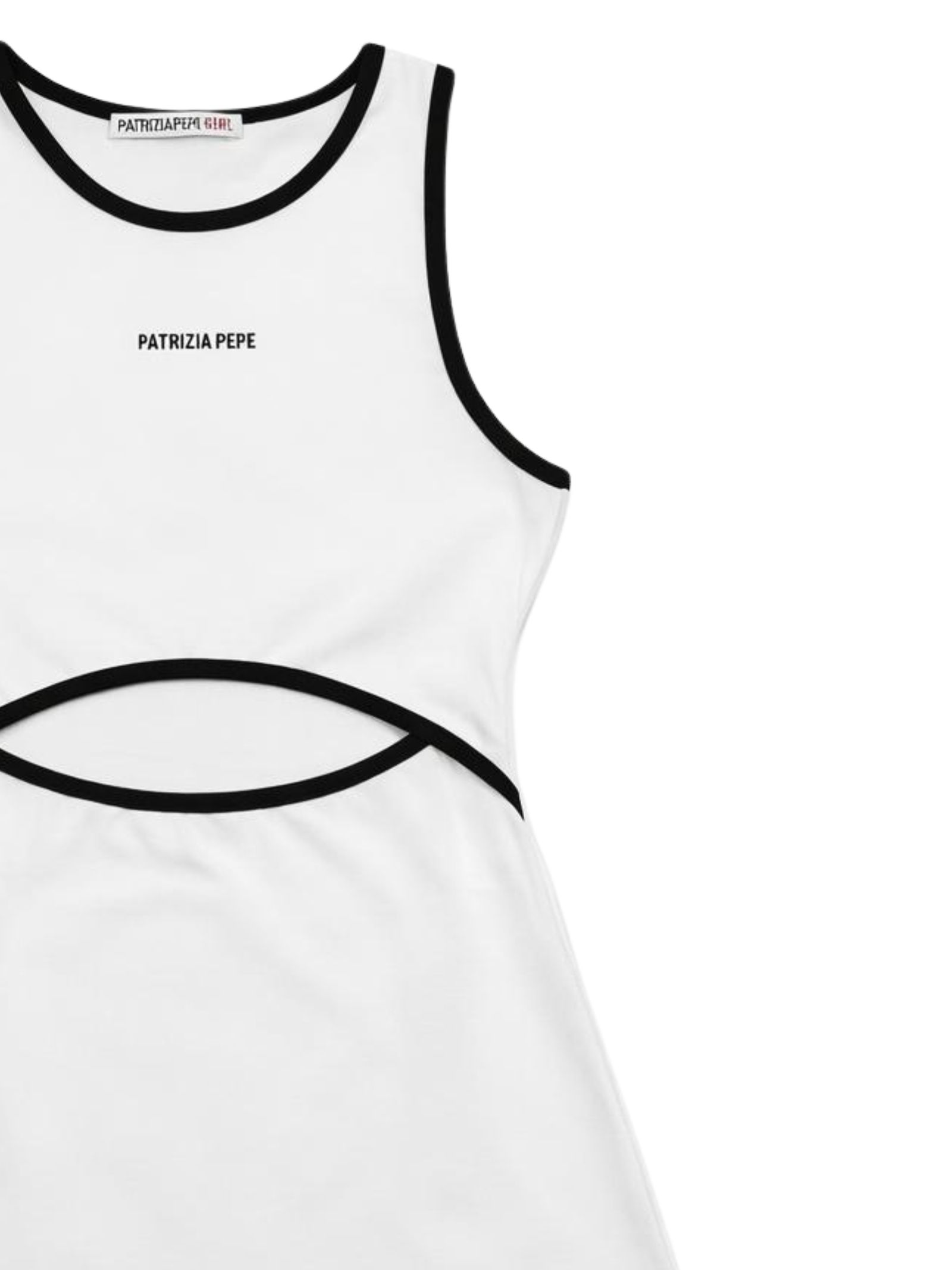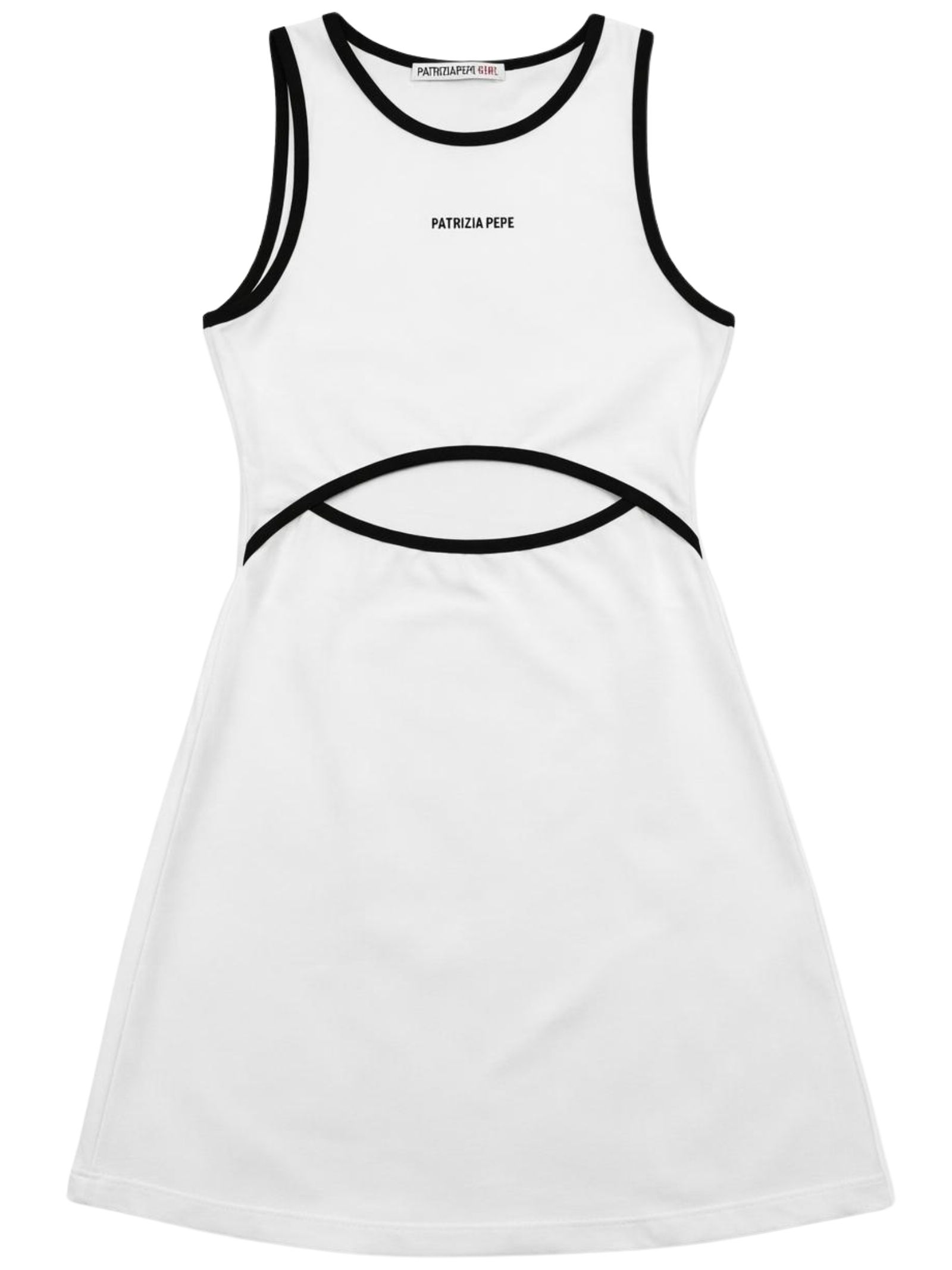 Patrizia Pepe Kids abito di colore bianco, dettagli a contrasto nero, modello girocollo, senza maniche, stampa con logo, design svasato, dettaglio cut-out sul davanti, vestibilità regolare. Composizione: 95% cotone 5% elastan. Made in Italy