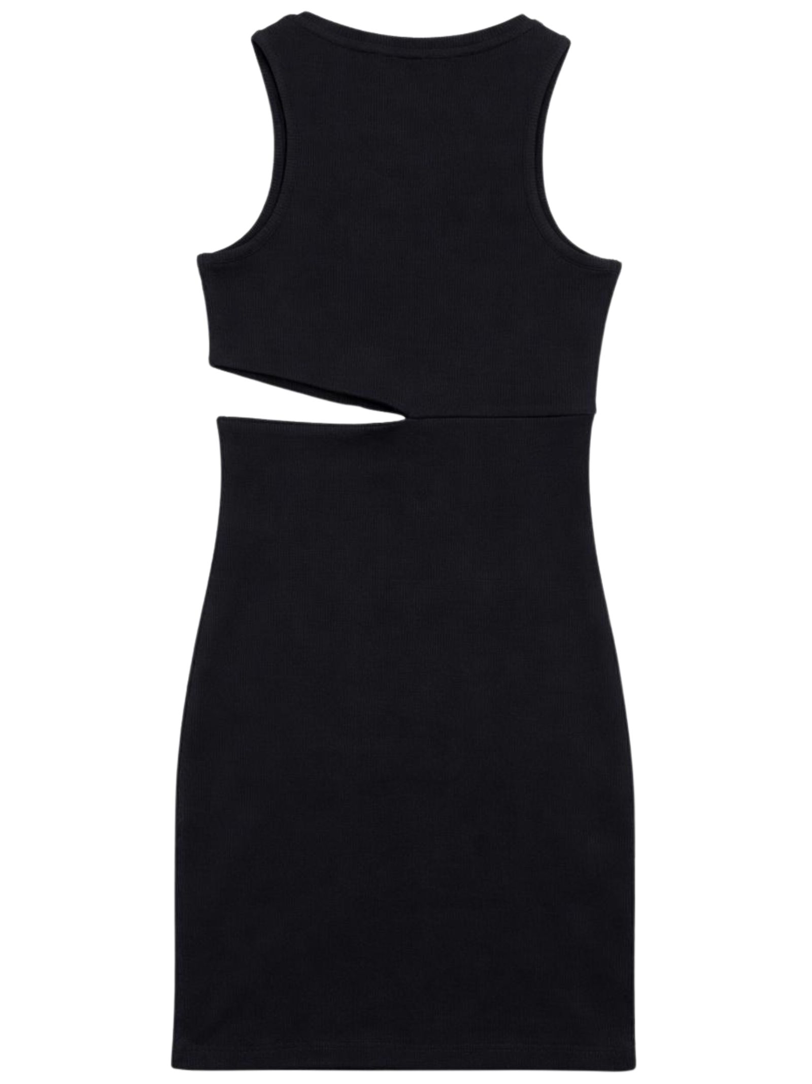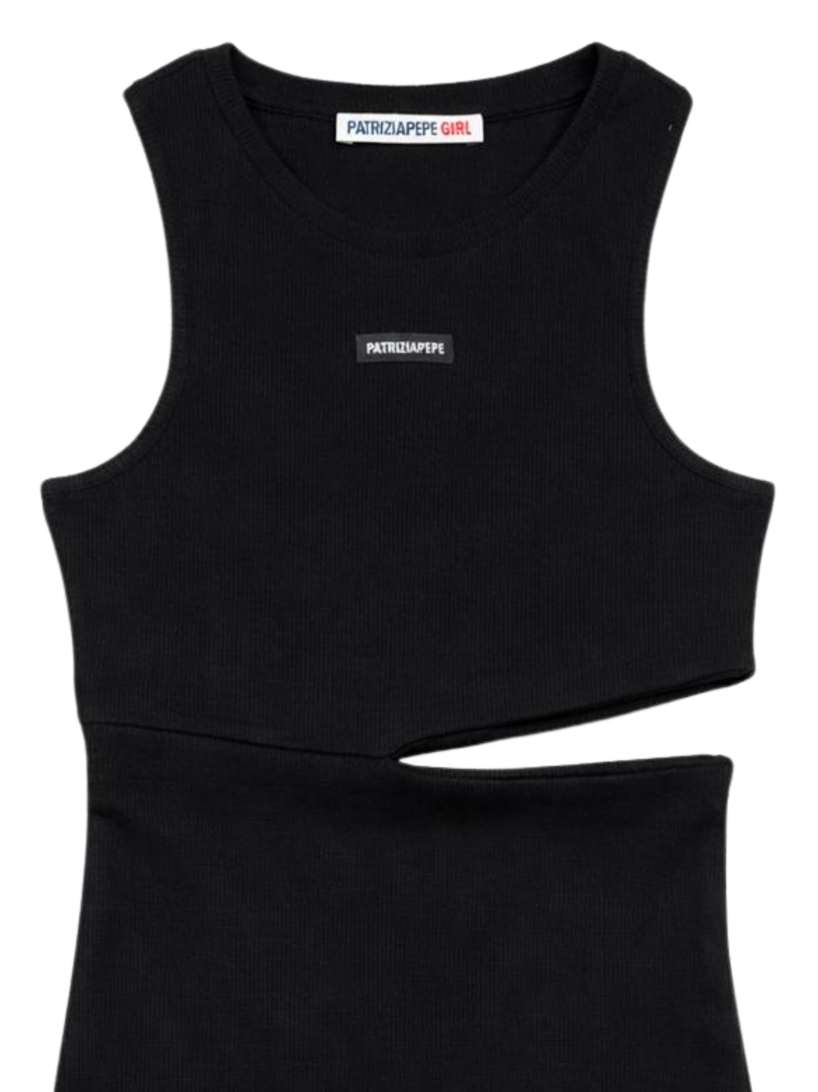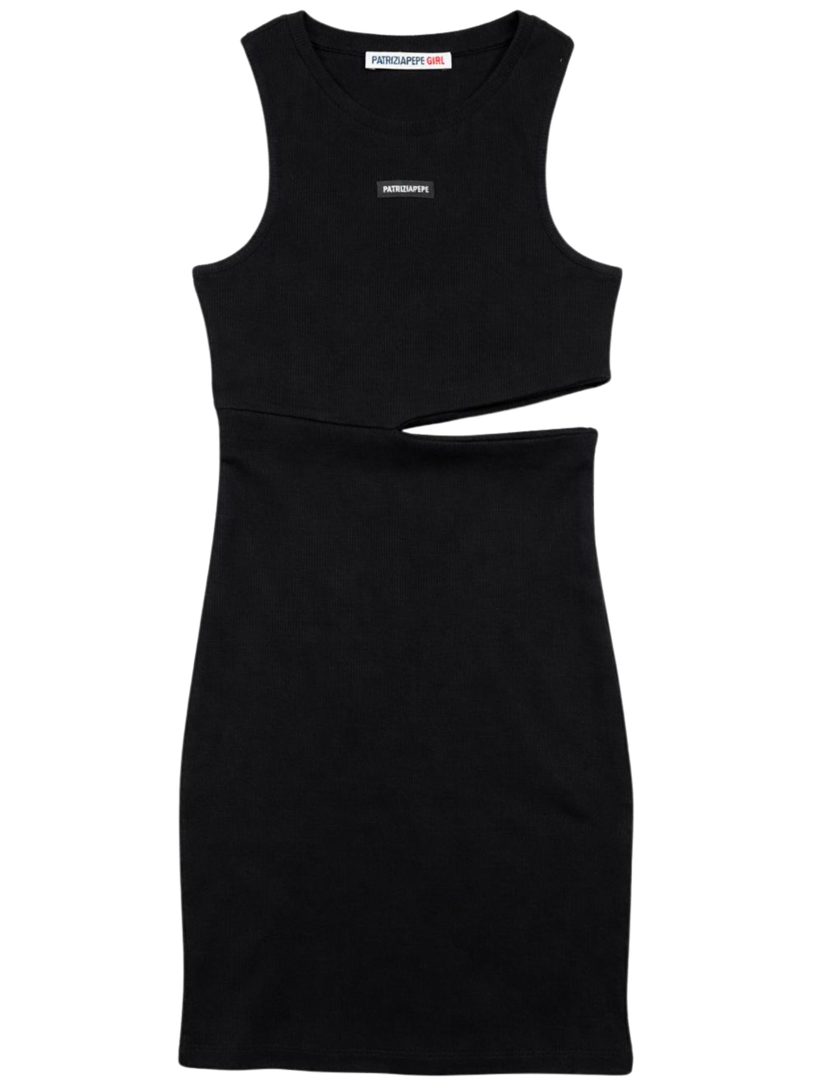 Patrizia Pepe Kids abito di colore nero, realizzato in tessuto a costine, modello girocollo, applicazione patch con logo, dettaglio cut-out su un lato, vestibilità aderente. Composizione: 92% cotone 8% elastan