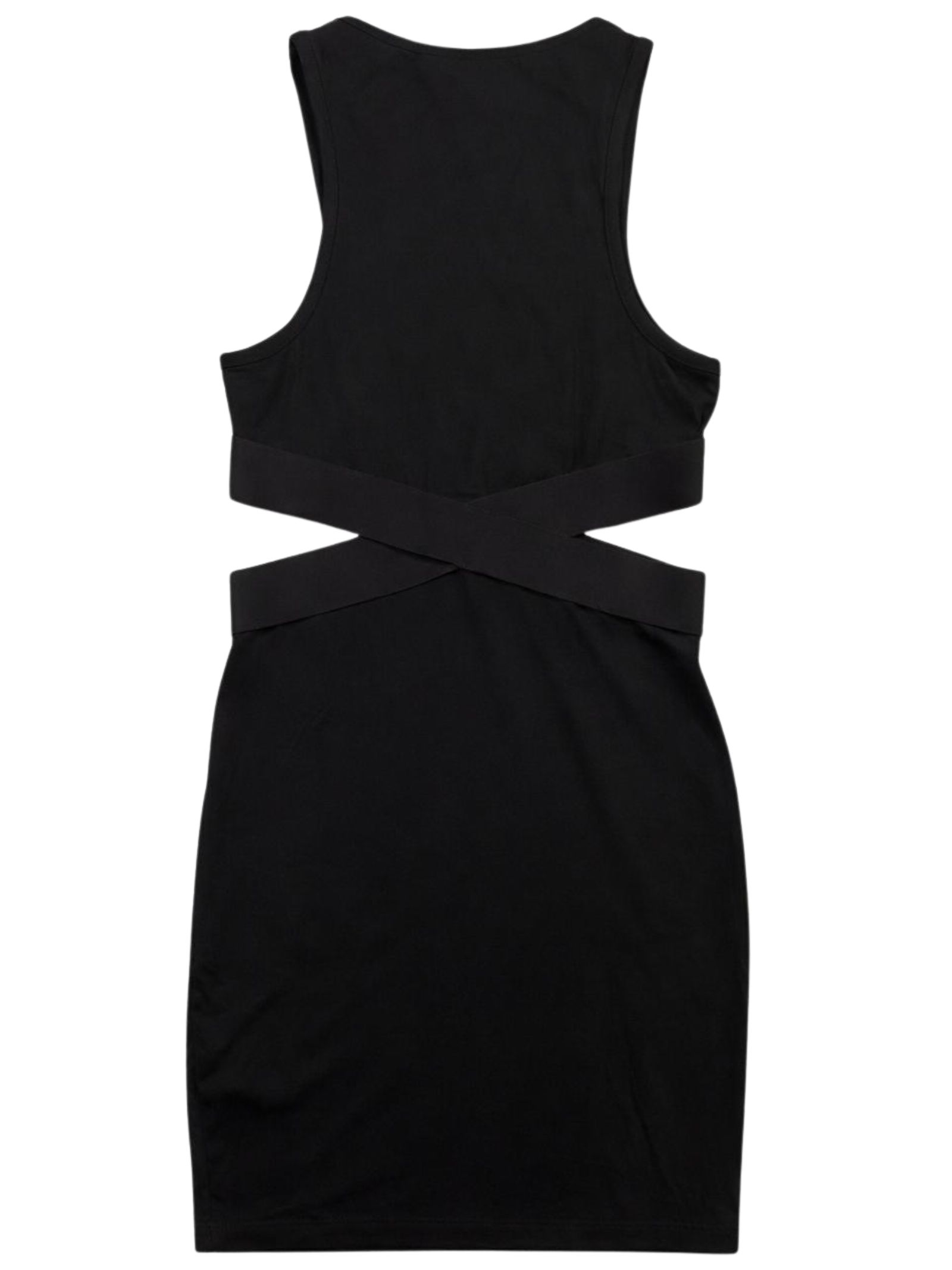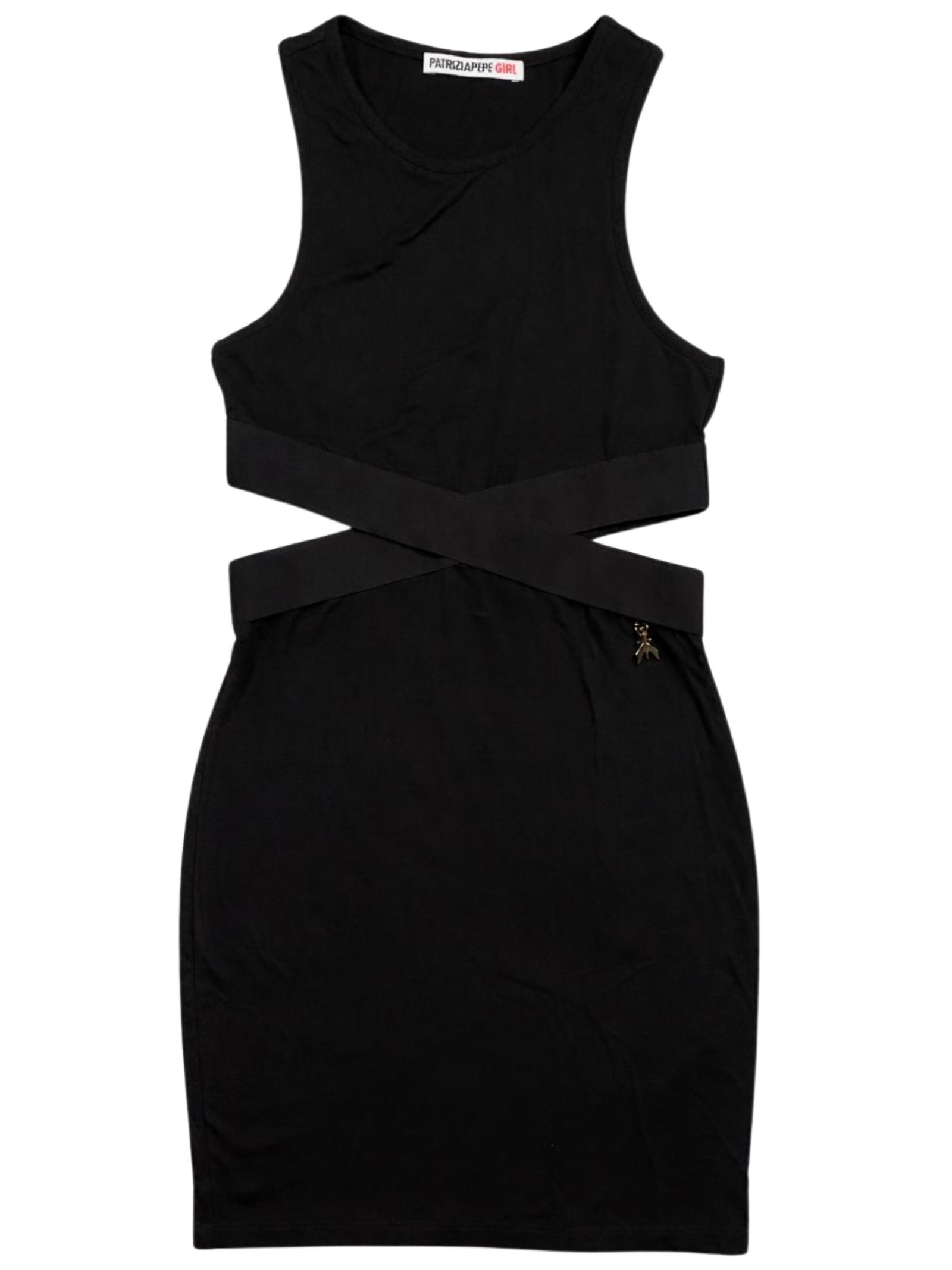 Patrizia Pepe Kids abito di colore nero, realizzato in morbida viscosa, modello girocollo, senza maniche, applicazione logo in metallo, dettaglio cut-out su entrambi i lati, vestibilità aderente. Composizione: 95% Viscosa 5% Elastan