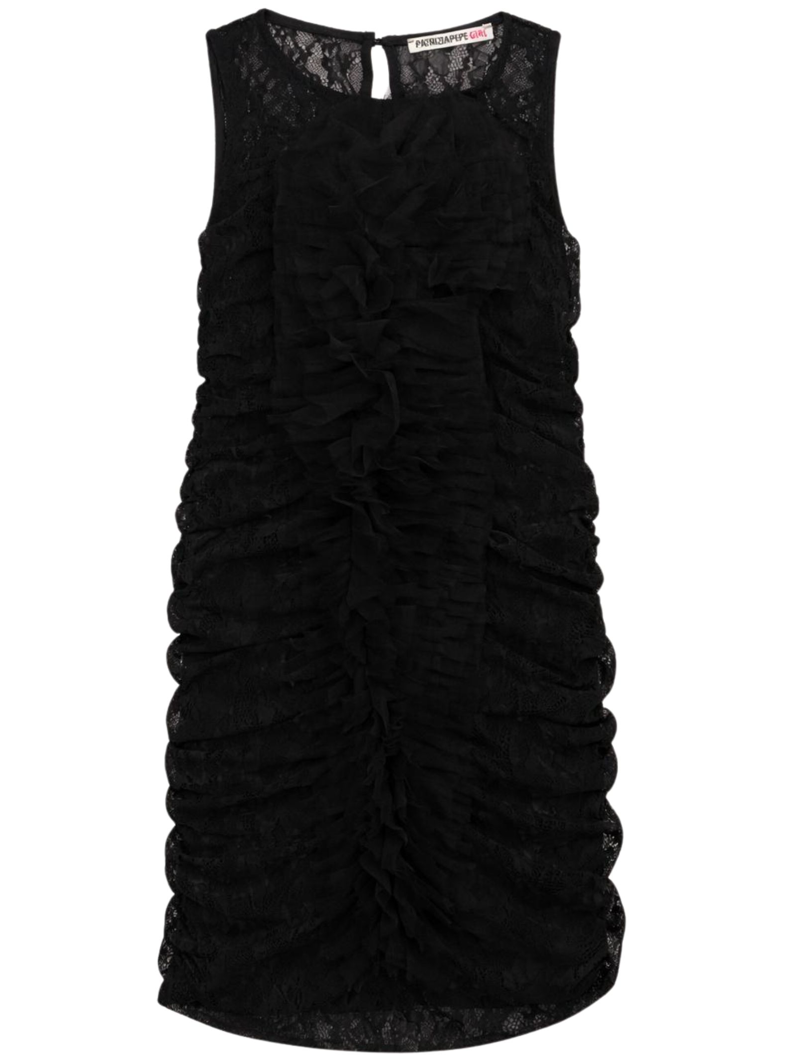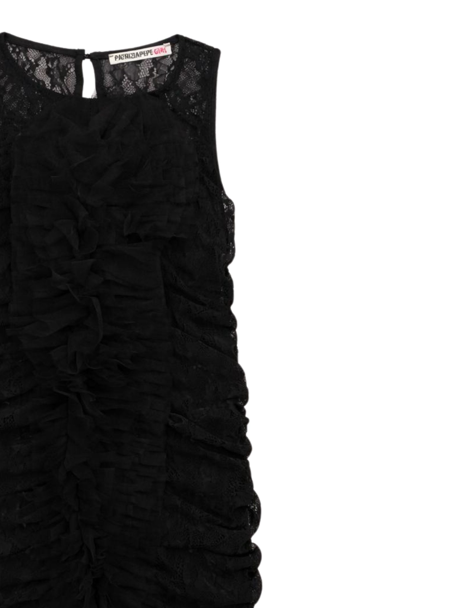 Patrizia Pepe Kids abito di colore nero, tessuto effetto merletto, modello girocollo, senza maniche, dettaglio rouches centrale, bottone sul retro, design aderente. Composizione: 100% poliestere. Made in Italy