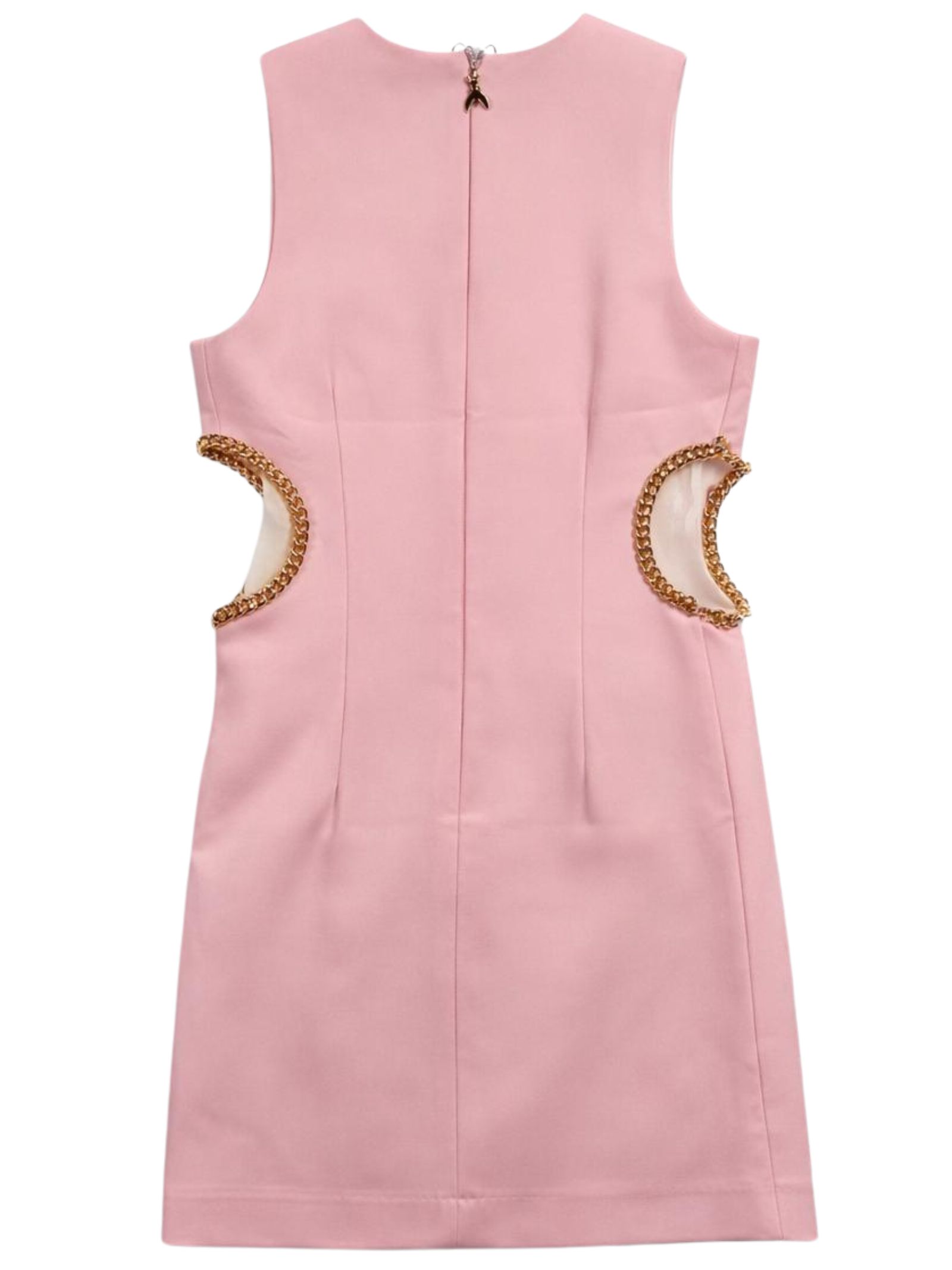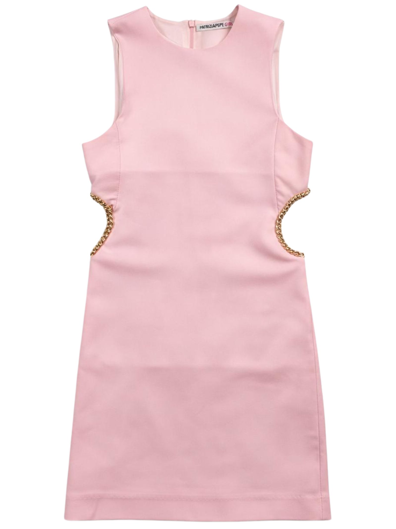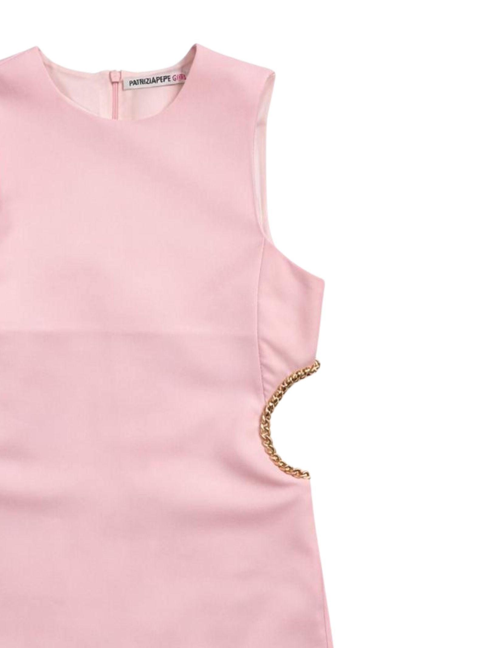 Patrizia Pepe Kids abito di colore rosa, modello smanicato, girocollo, dettaglio cut su entrambi i lati, decorazione catena oro, zip sul retro, vestibilità regolare. Composizione: 95% poliestere 5% elastan. Fodera: 100% poliestere. Made in Italy