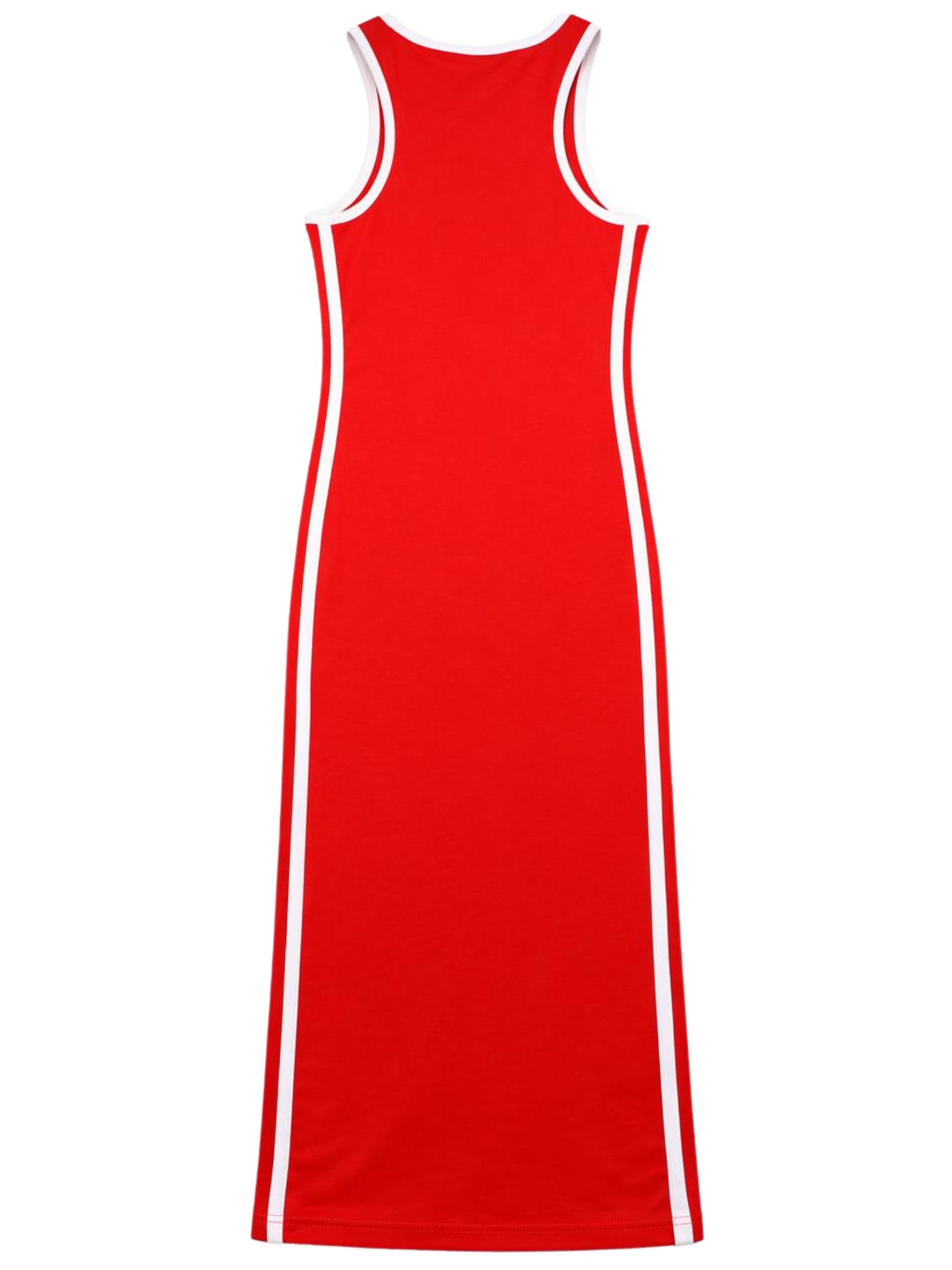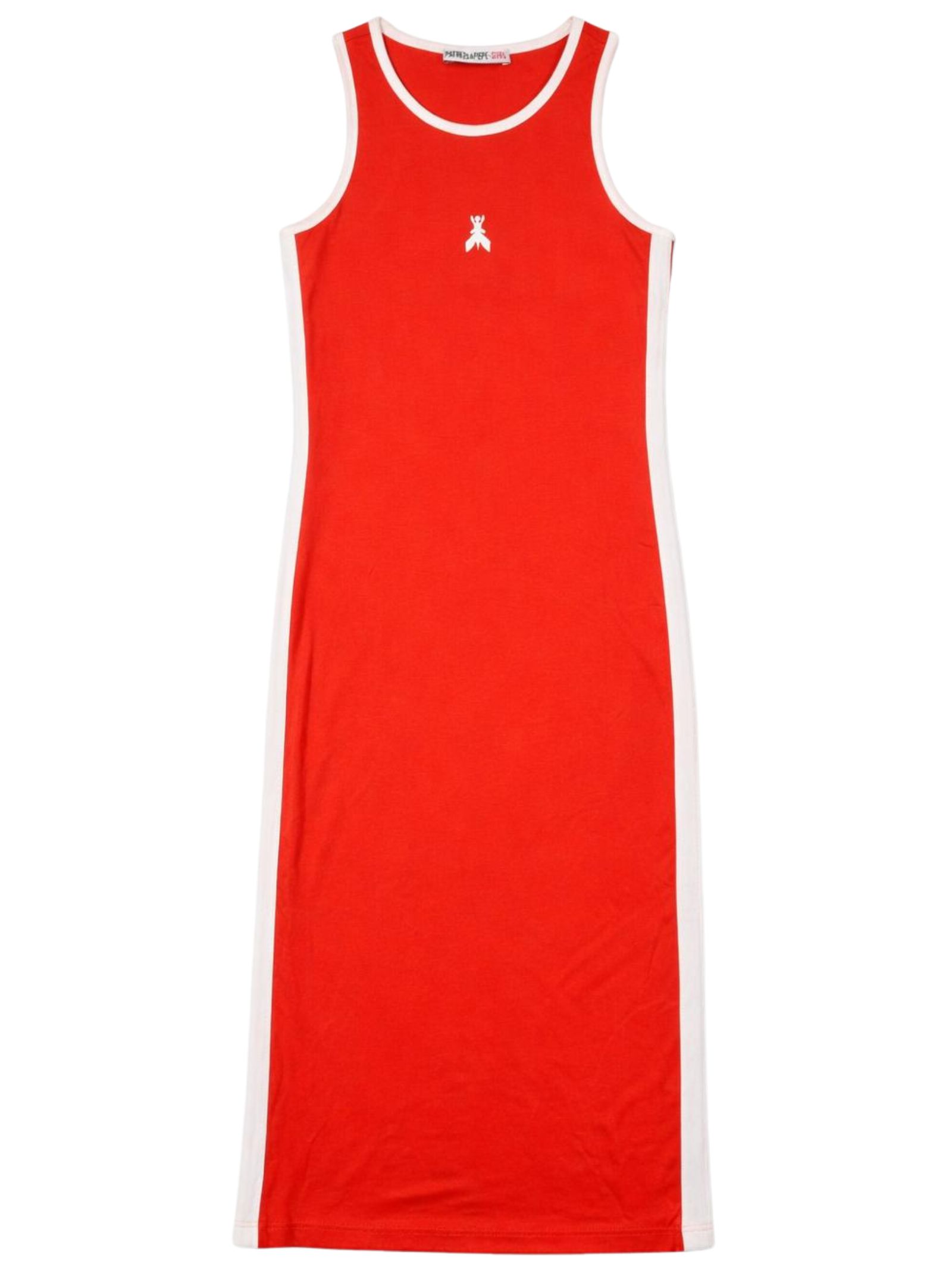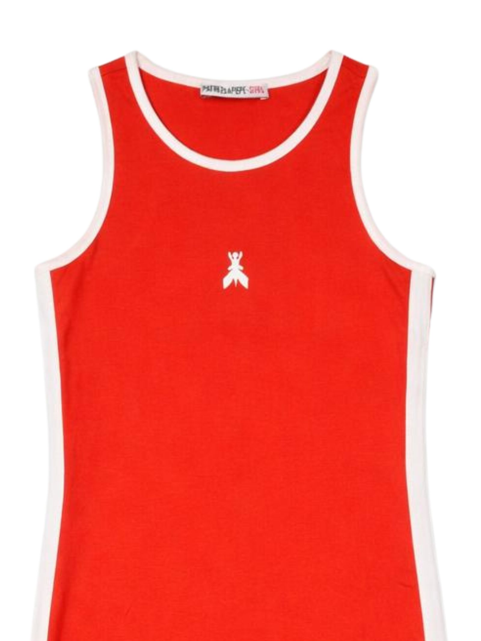 Patrizia Pepe Kids abito di colore rosso corallo, bande laterali a contrasto bianco, modello girocollo, smanicato, applicazione logo gommato, design aderente. Composizione: 95% Viscosa 5% Elastan