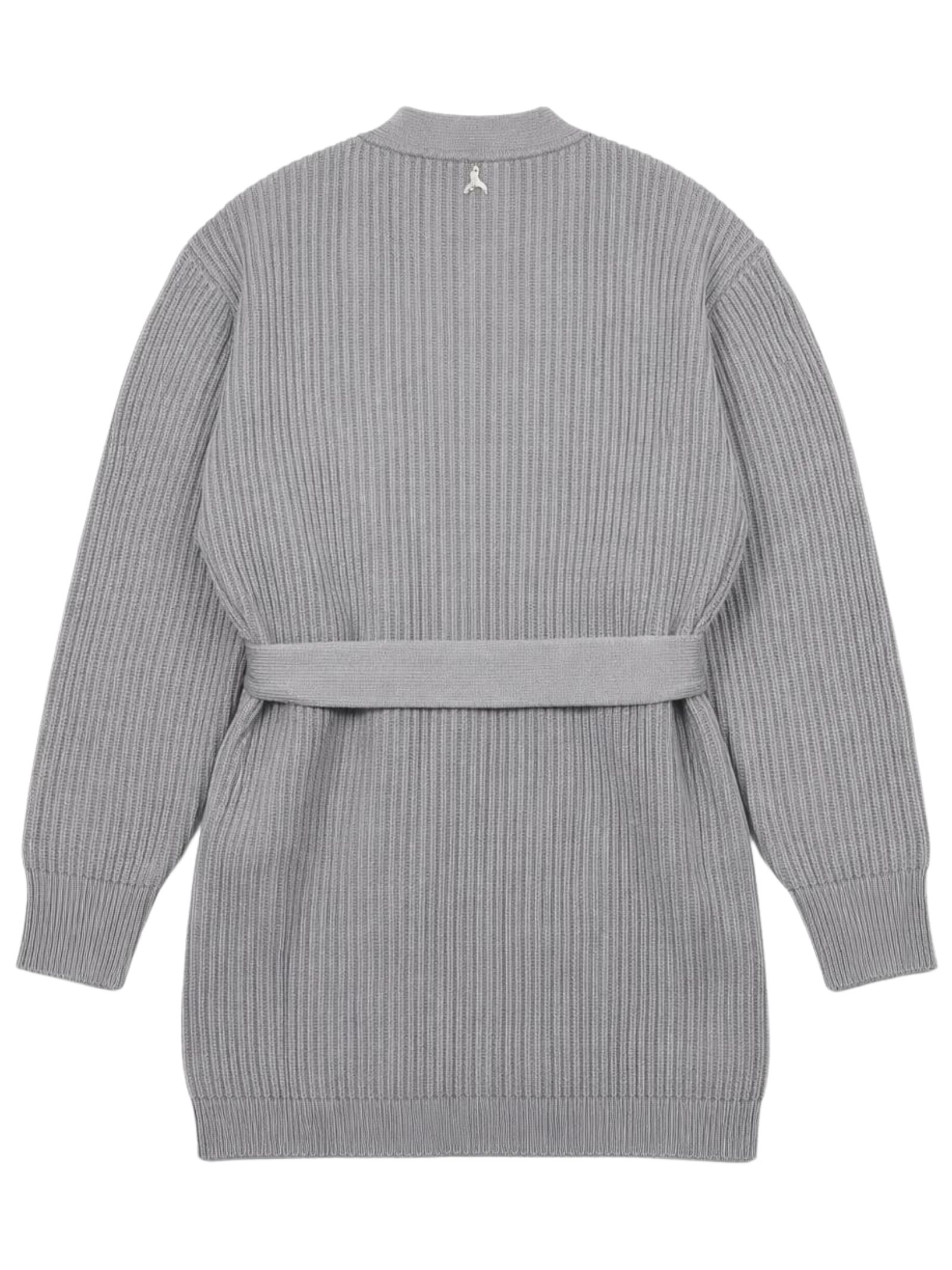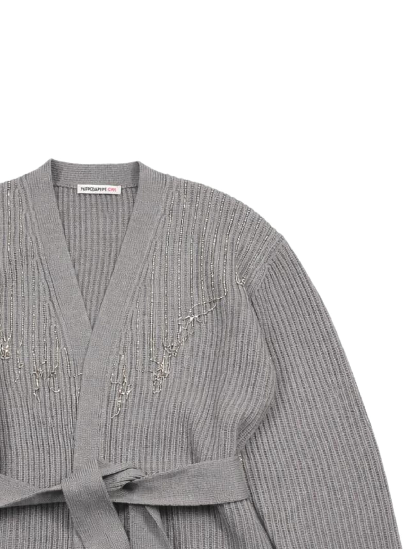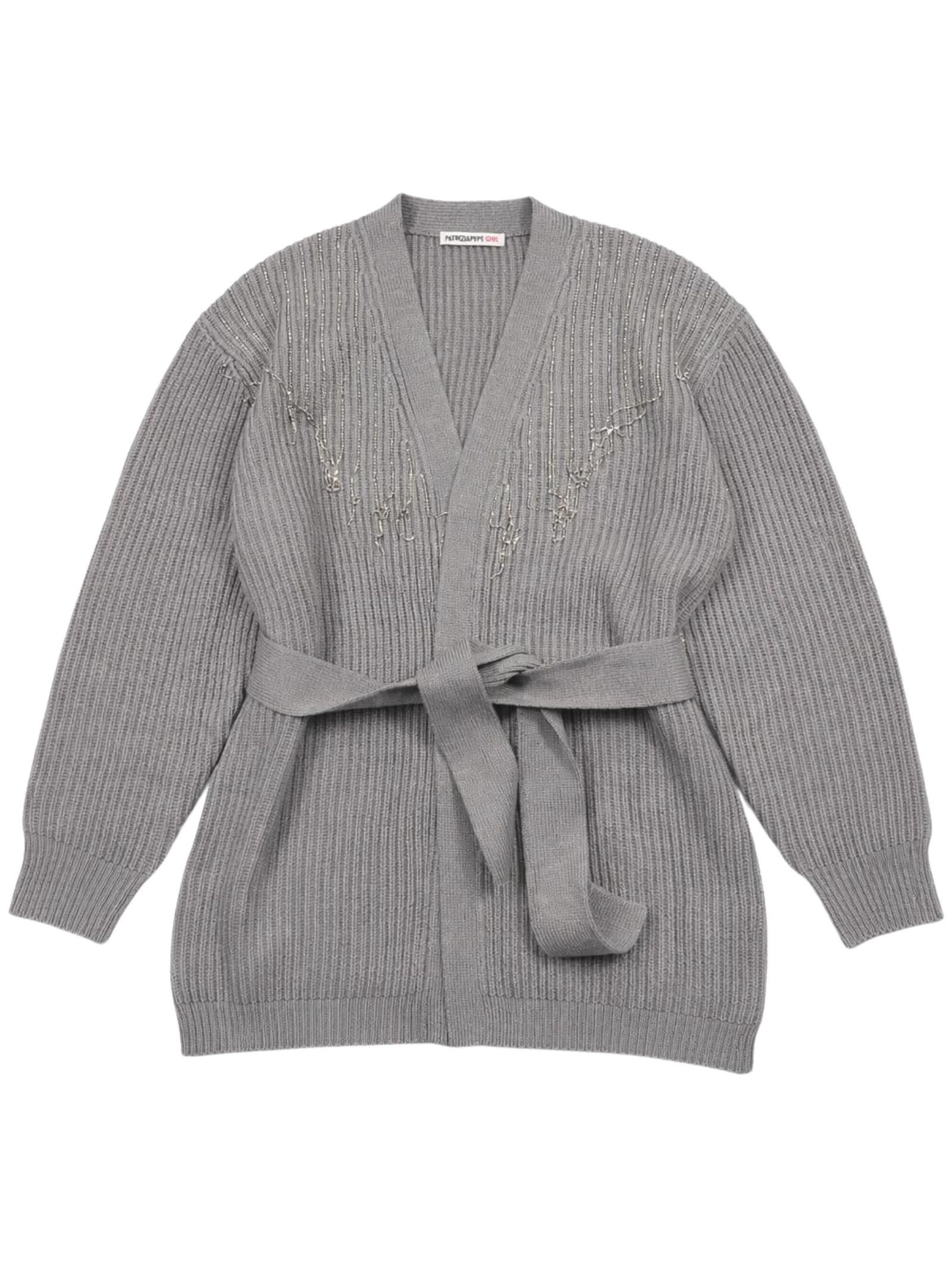 Patrizia Pepe Kids cardigan di colore grigio, realizzato in maglia a costine, dettaglio applicazione fili in strass, scollo a V, cintura in vita, vestibilità regolare. Composizione: 50% Acrilica 50% lana