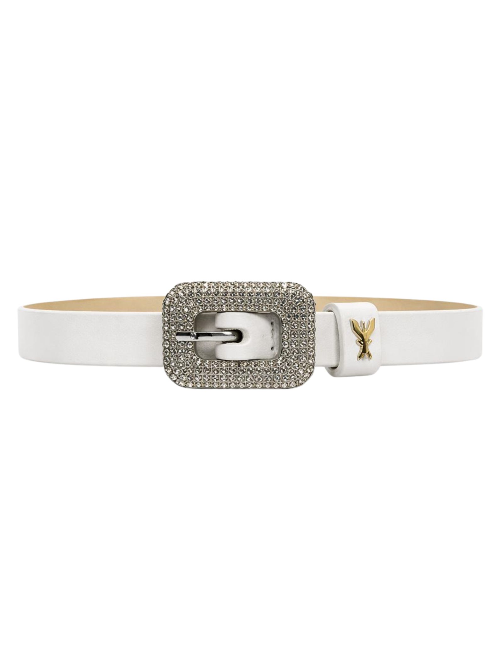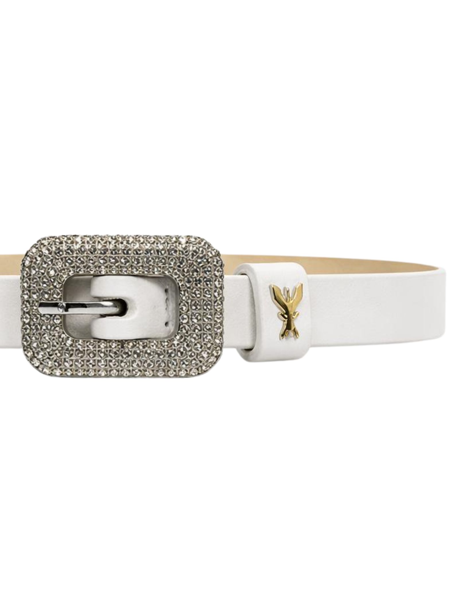 Patrizia Pepe Kids cintura di colore bianco, realizzata in pelle, design sottile, caratterizzata da fibbia decorata con strass, modello regolabile. Made in Italy