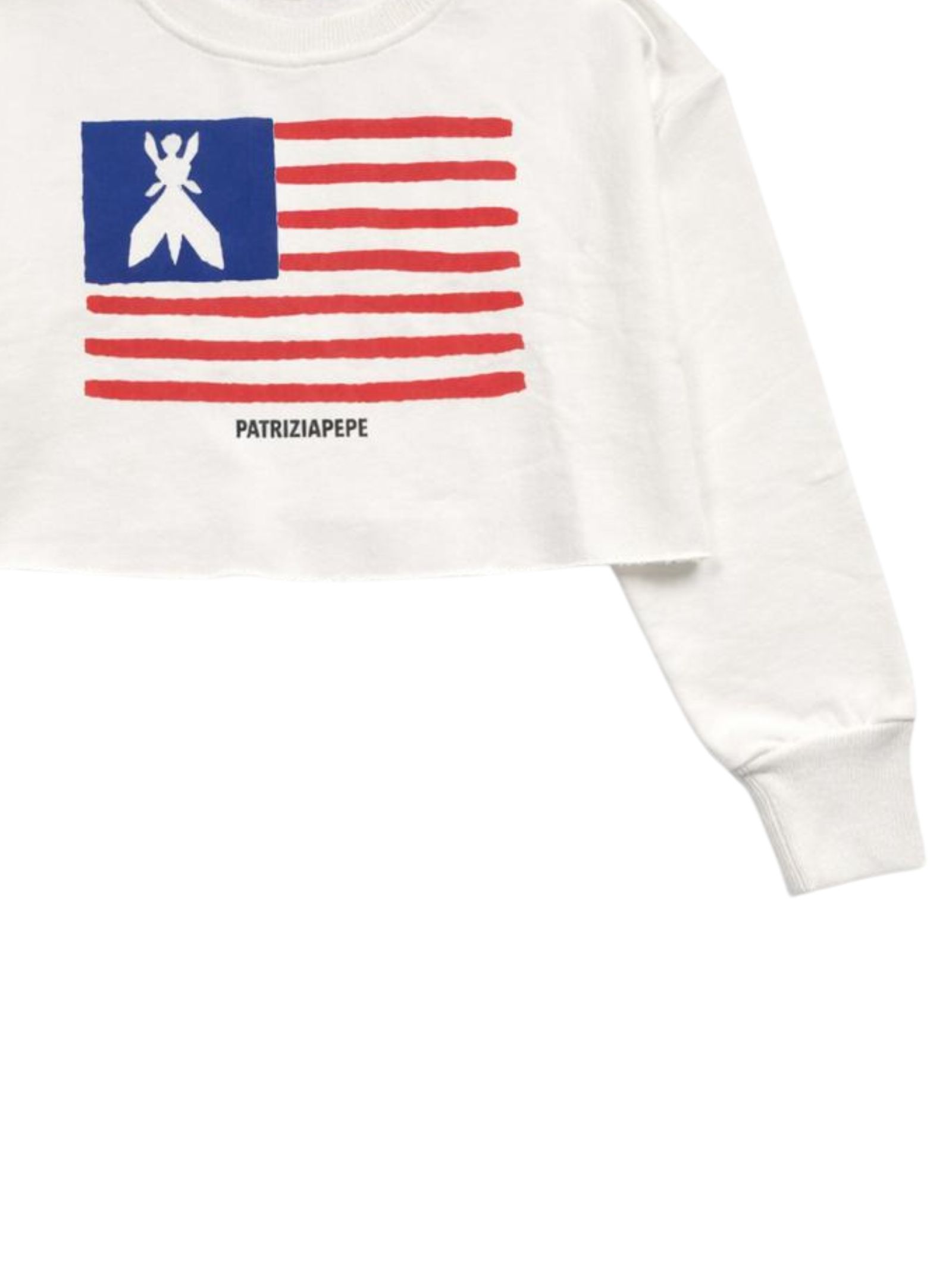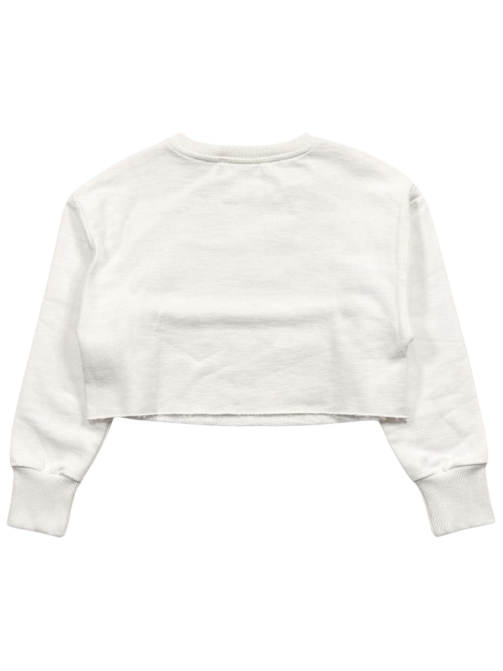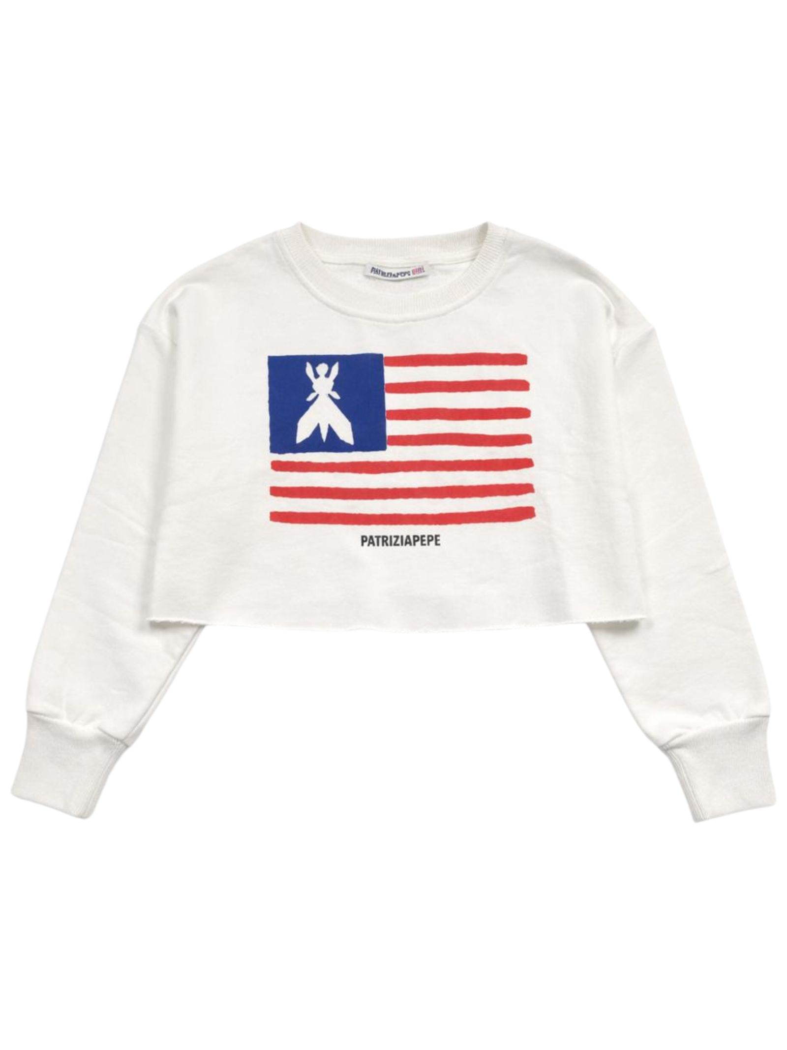 Patrizia Pepe Kids felpa di colore bianco, modello corto, girocollo, maniche lunghe, stampa frontale con logo a contrasto, orlo dritto a taglio vivo, vestibilità ampia. Composizione: 100% Cotone. Made in Italy