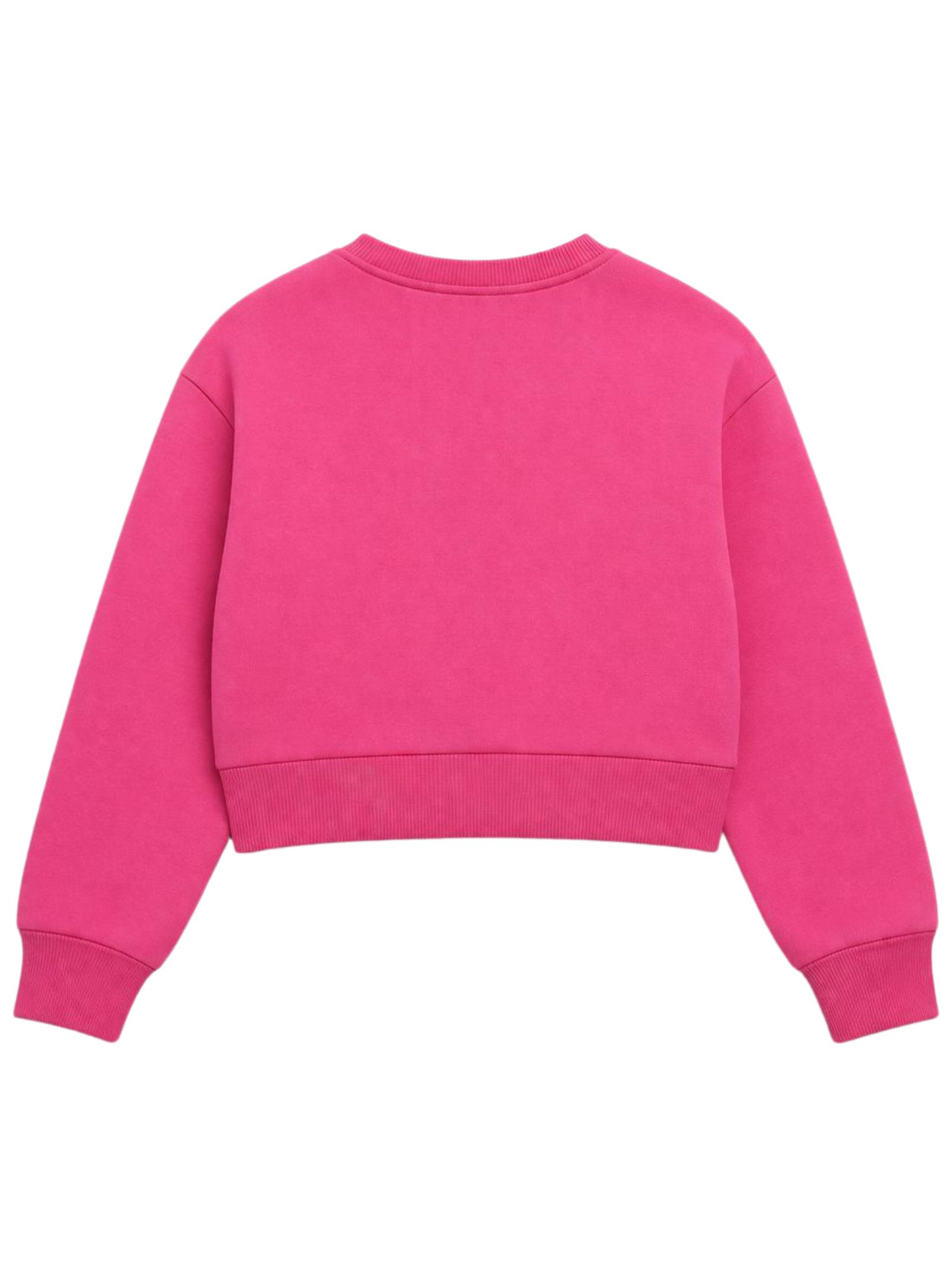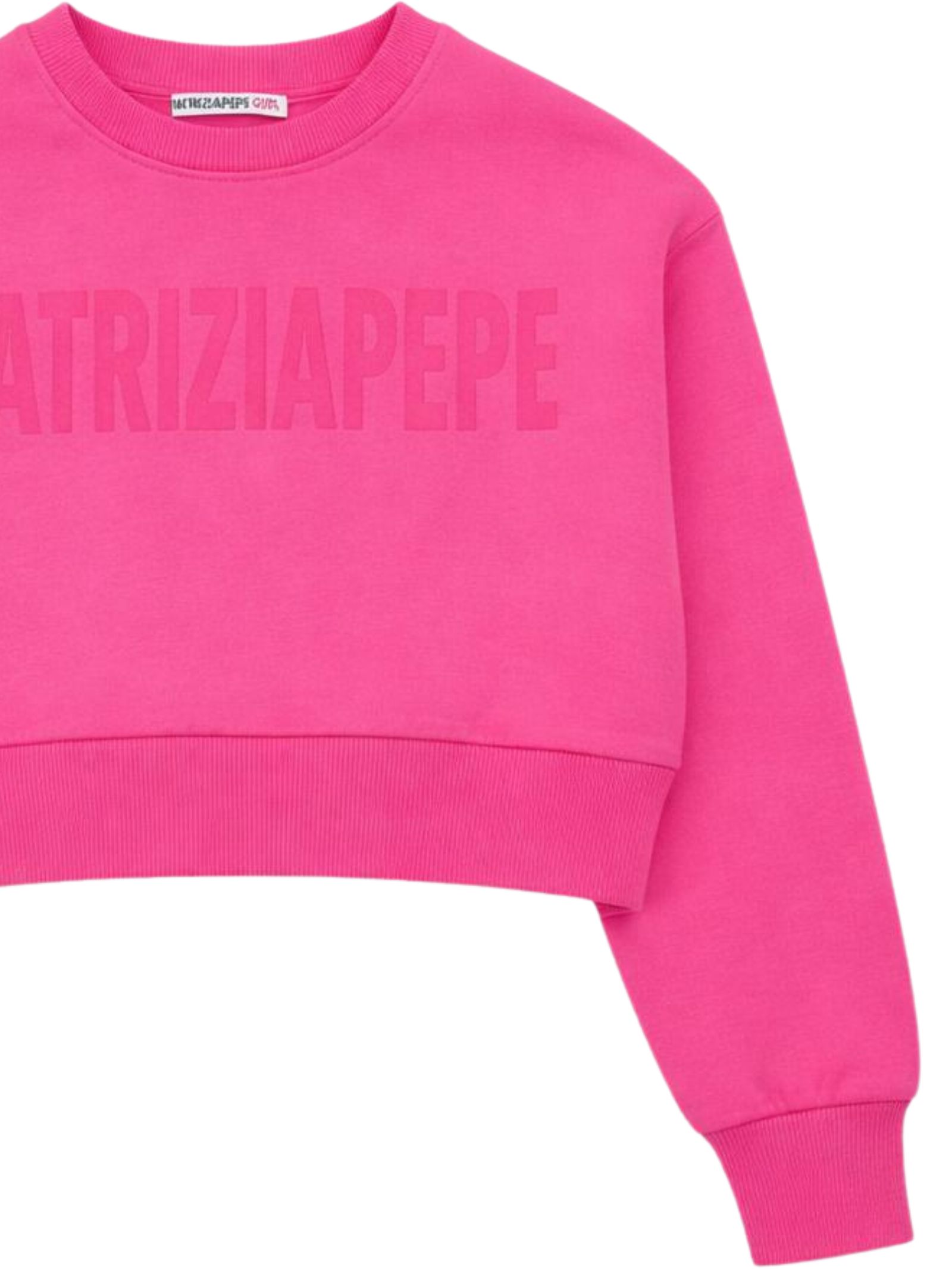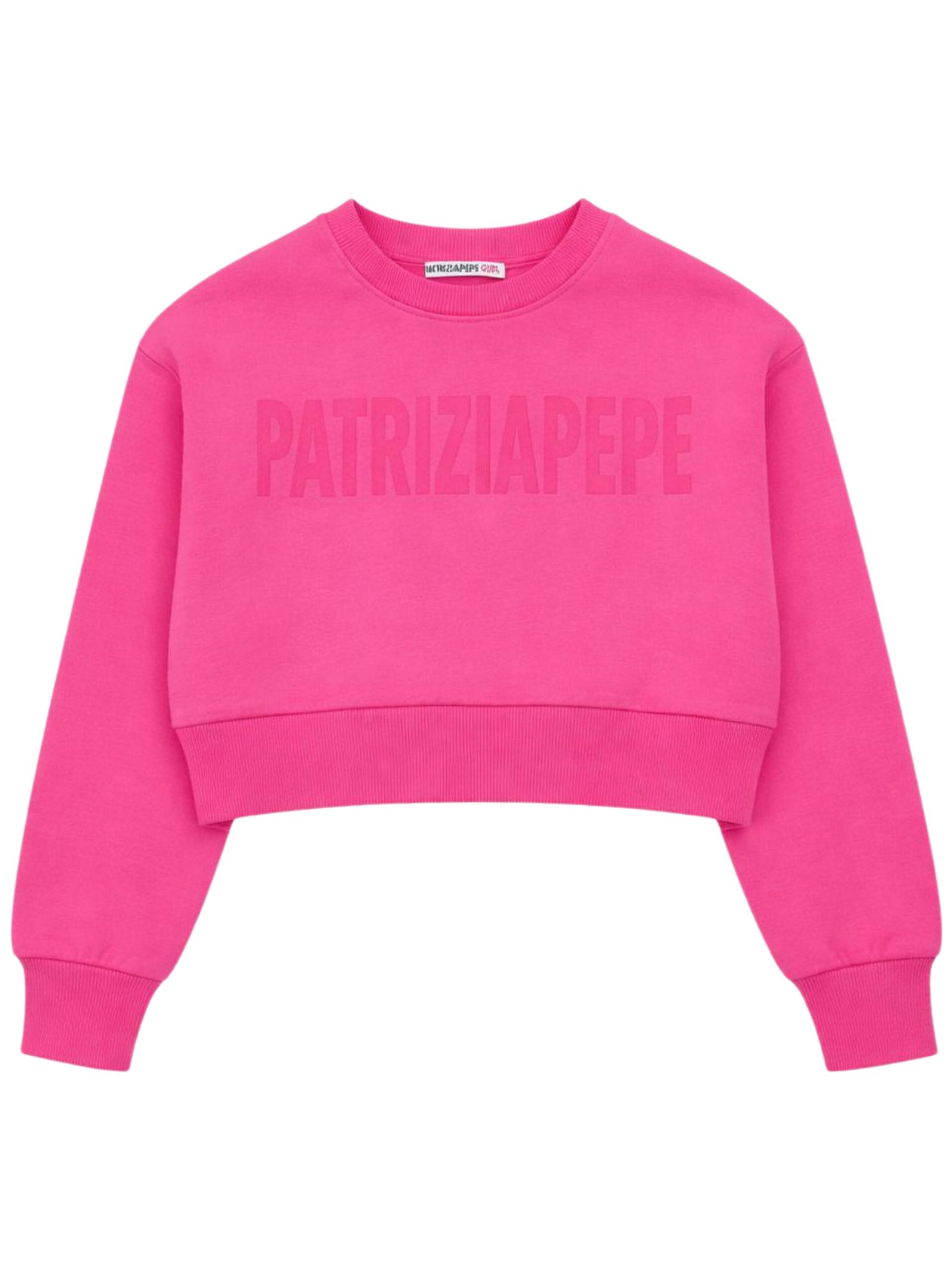 Patrizia Pepe Kids felpa di colore fucsia, modello corto, girocollo, manica lunga, caratterizzata da stampa logo centrale a contrasto, orli a costine, vestibilità regolare. Composizione: 100% Cotone. Made in Italy