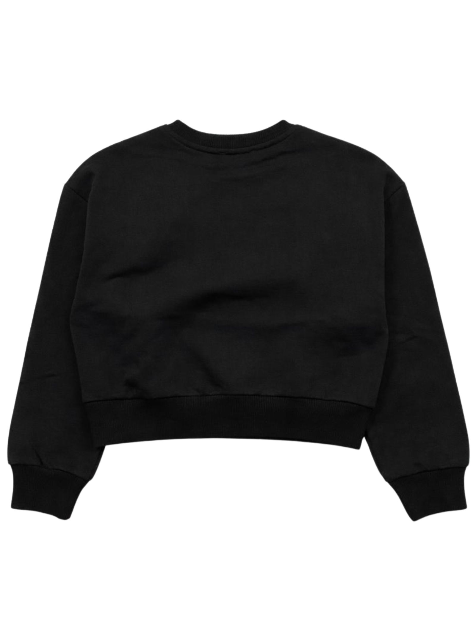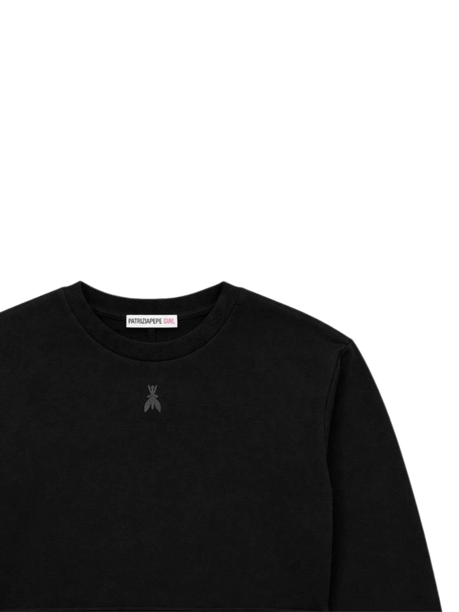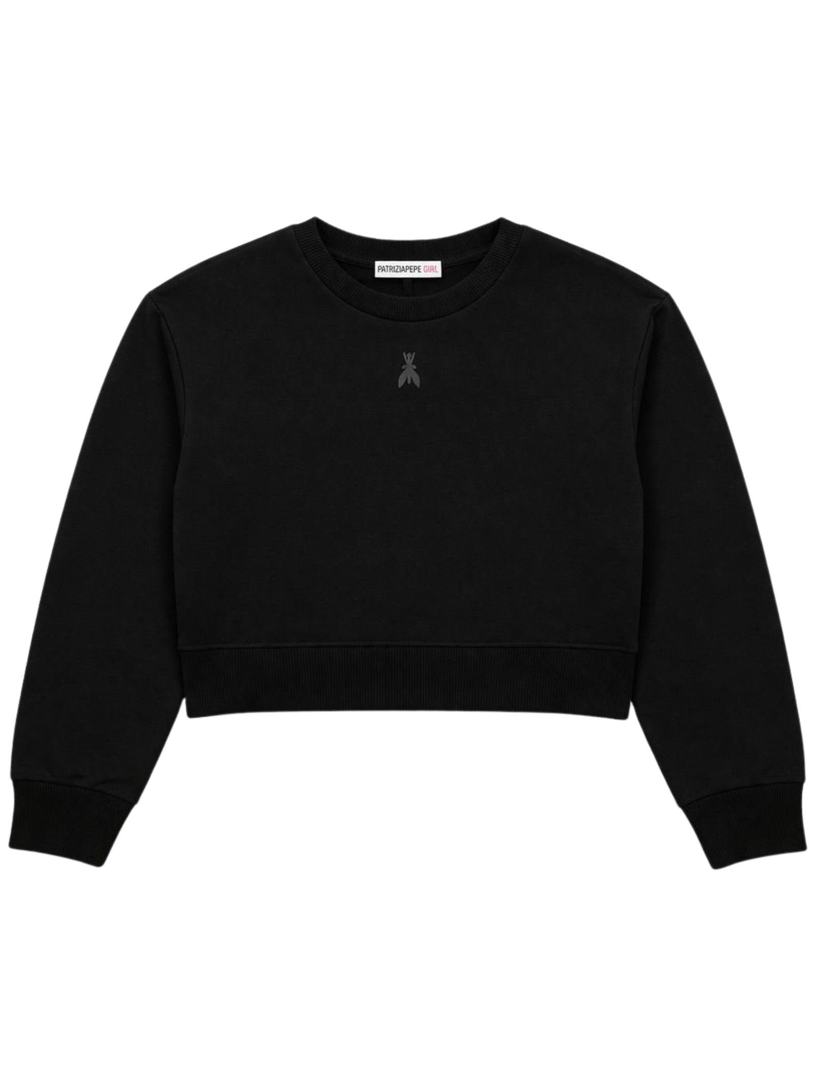 Patrizia Pepe Kids felpa di colore nero, modello corto, girocollo, manica lunga, caratterizzata da stampa logo centrale a contrasto, orli a costine, vestibilità regolare. Composizione: 100% Cotone. Made in Italy