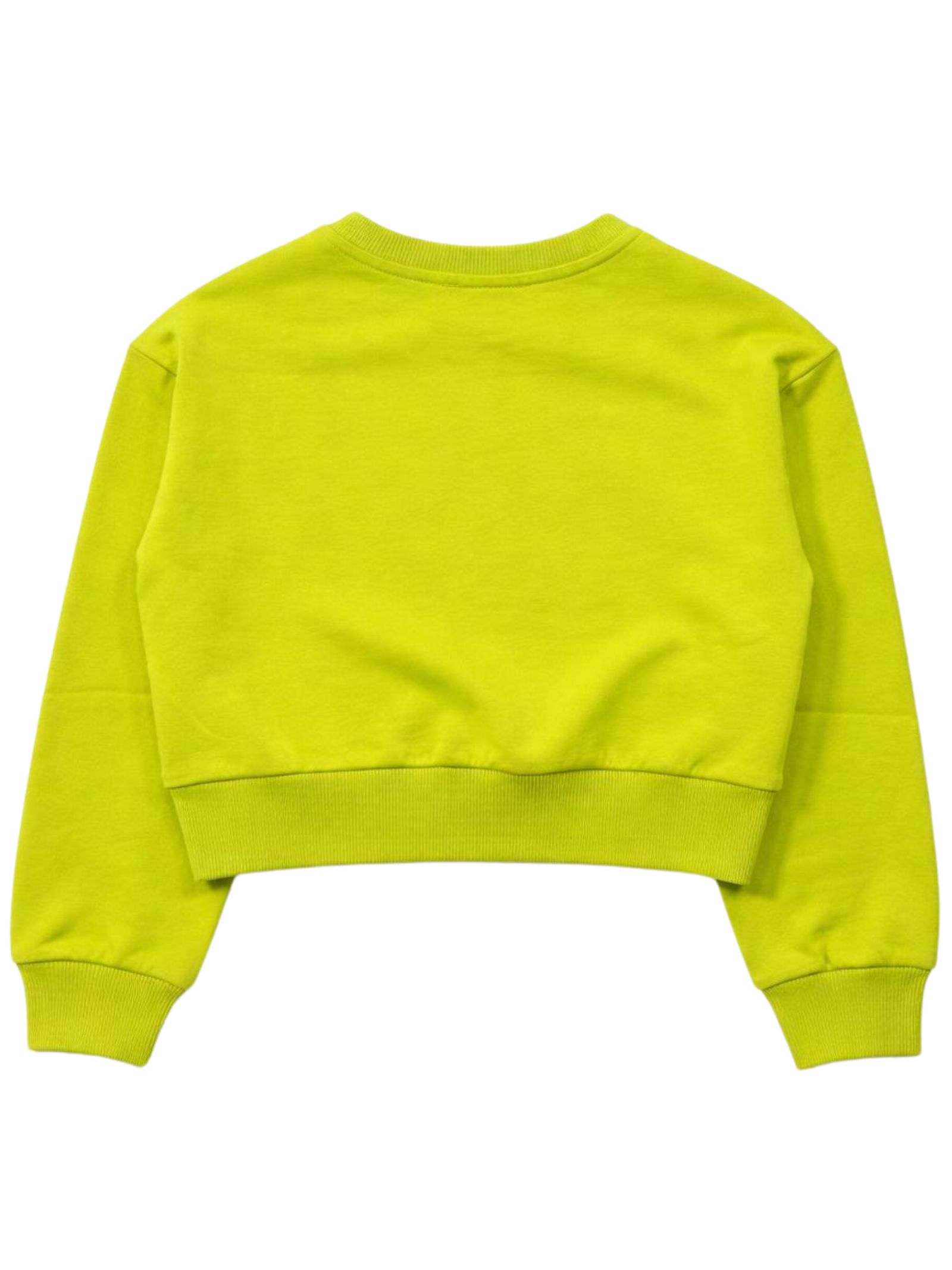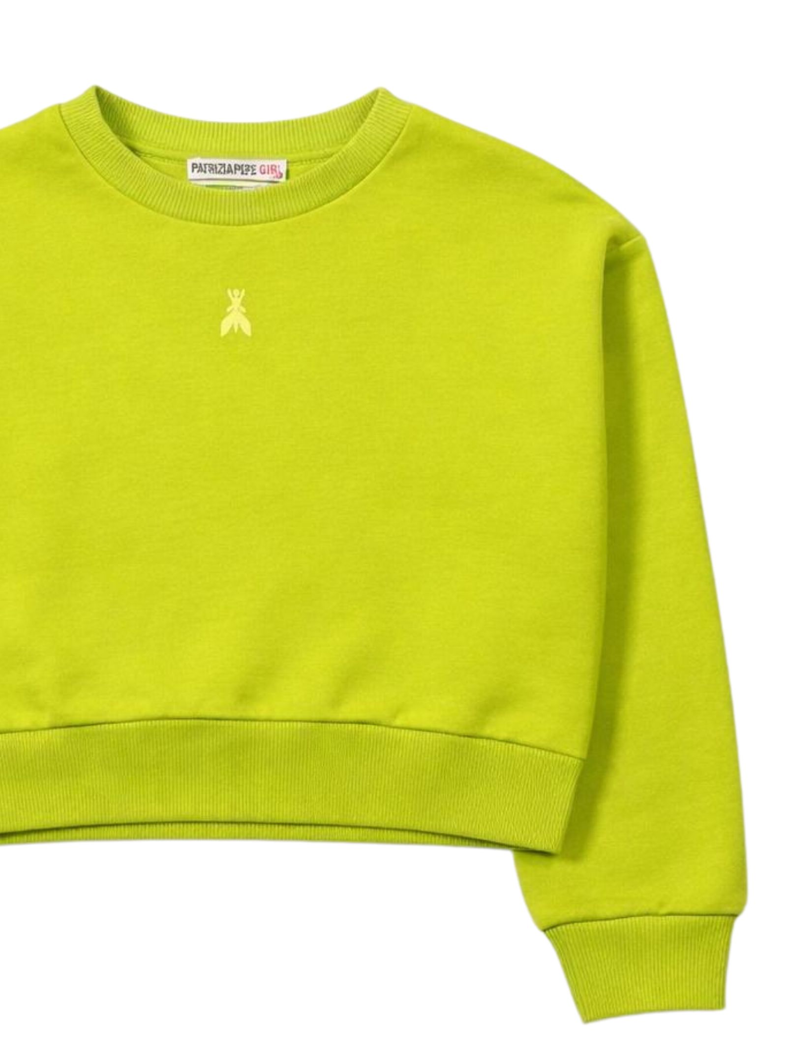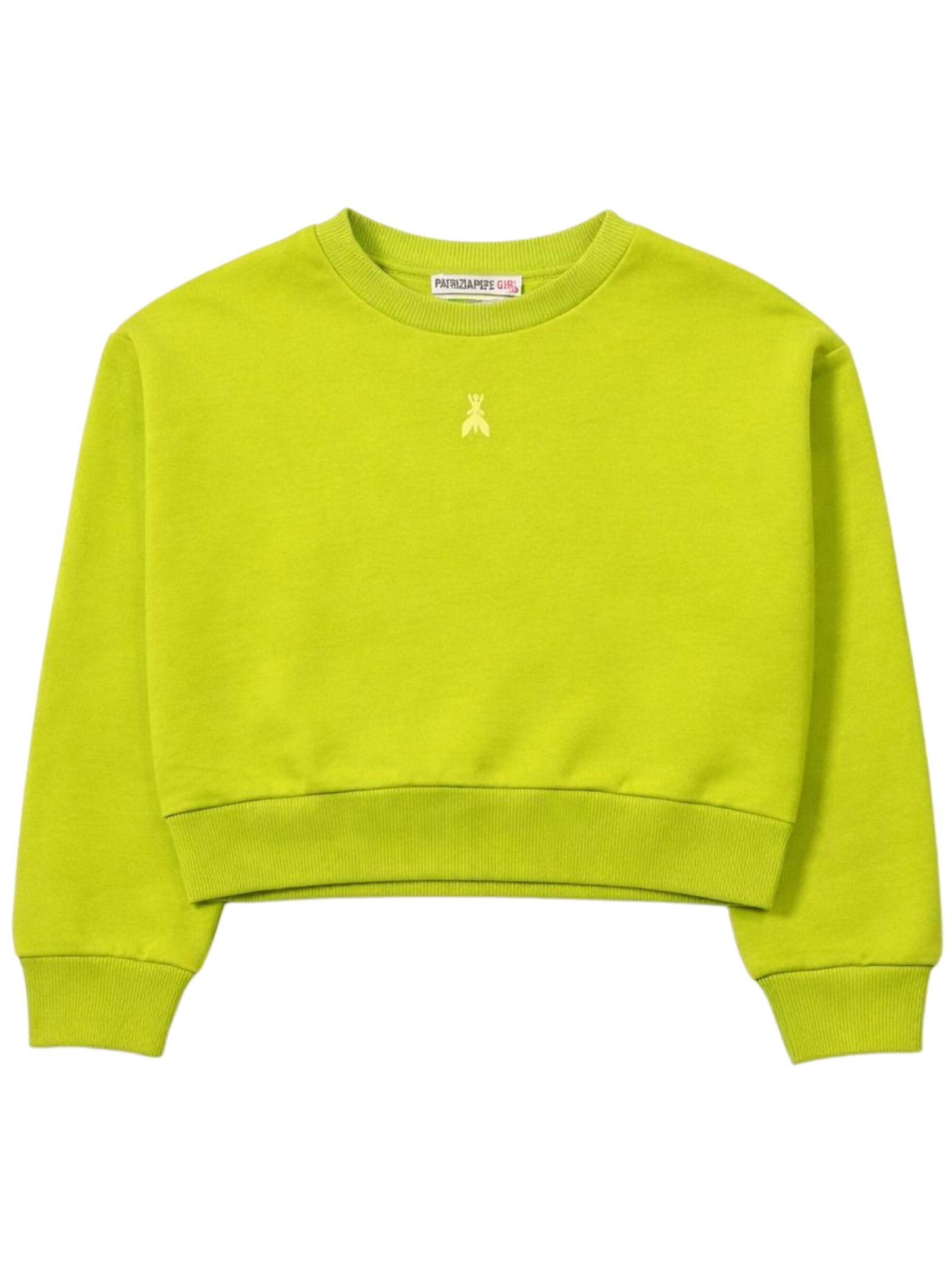 Patrizia Pepe Kids felpa di colore verde fluo, modello corto, girocollo, manica lunga, caratterizzata da stampa logo centrale a contrasto, orli a costine, vestibilità regolare. Composizione: 100% Cotone. Made in Italy