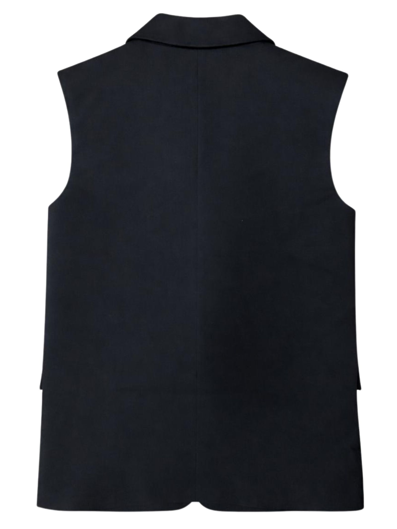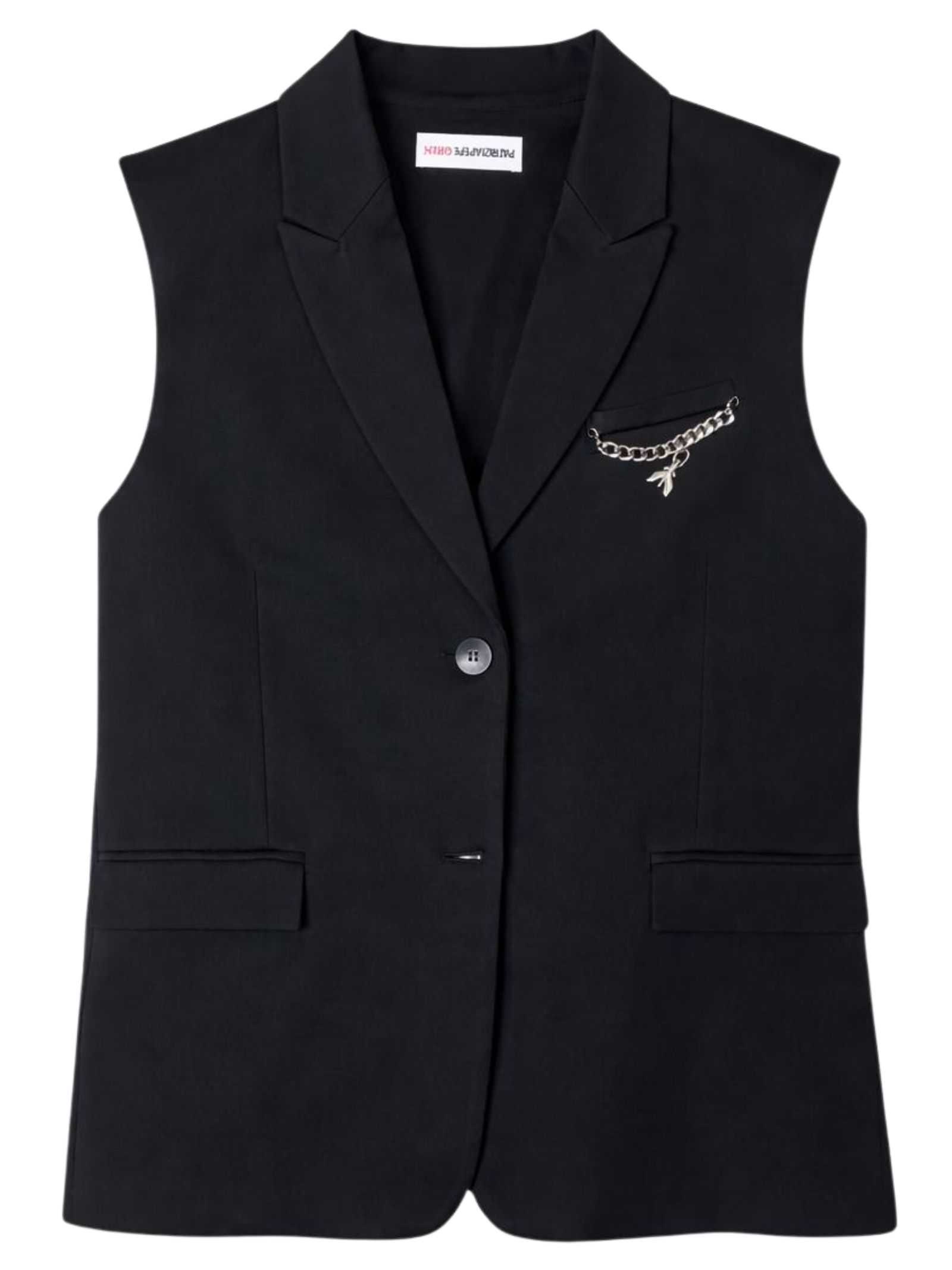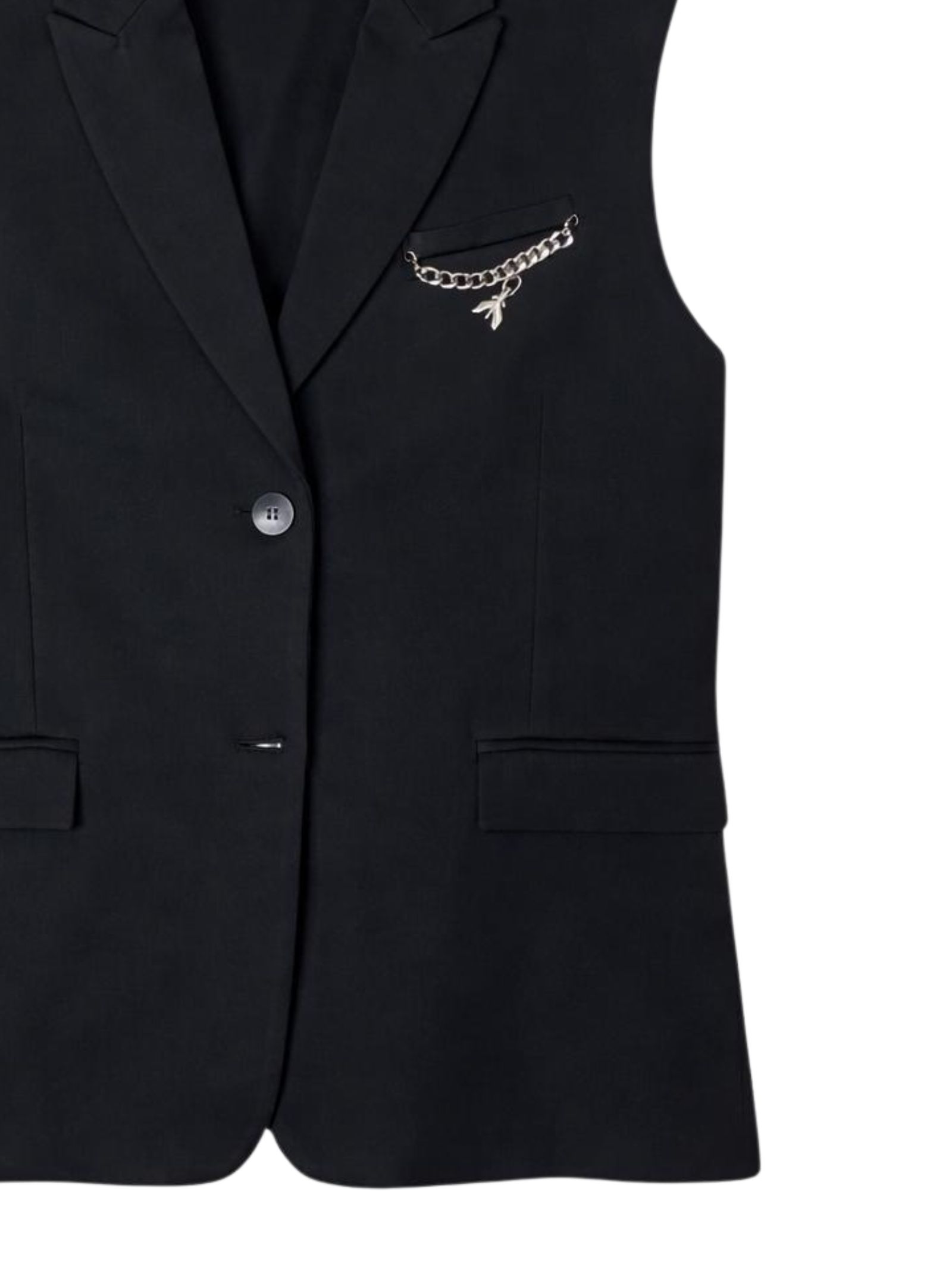 Patrizia Pepe Kids giacca di colore nero, modello senza maniche, collo a lancia, due bottoni, 3 tasche, dettaglio applicazione catena con logo. Composizione: 65% viscosa 30% nylon 5% elastan. Fodera: 100% poliestere. Made in Italy