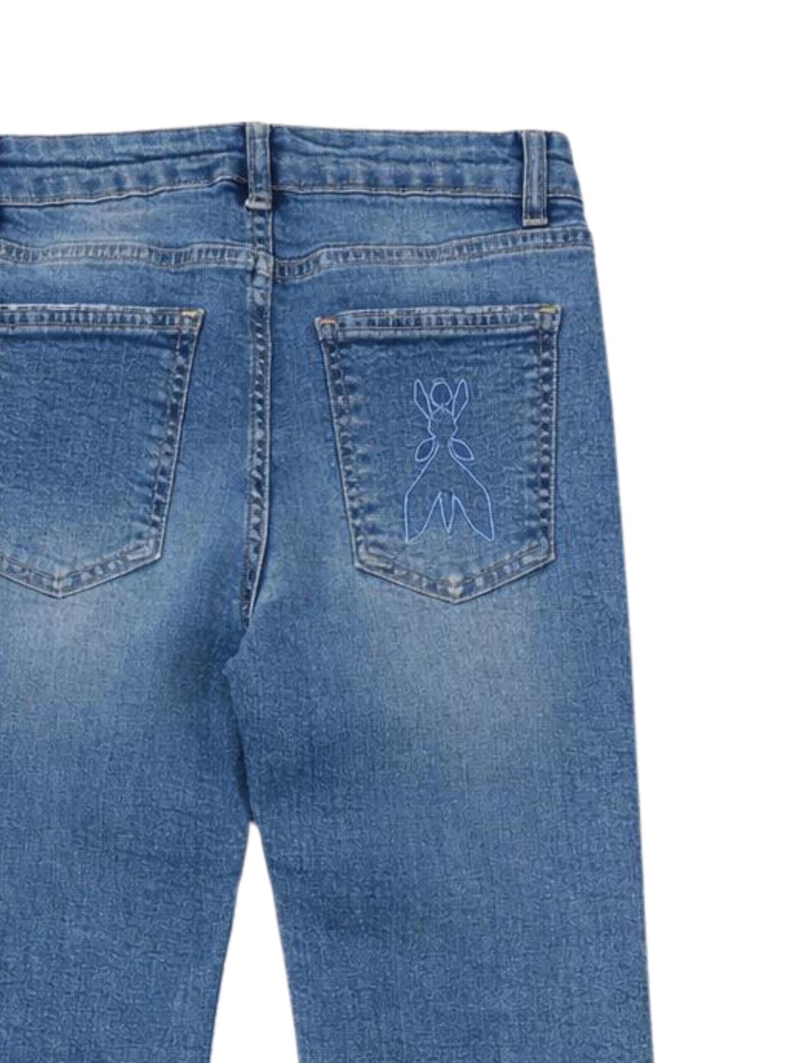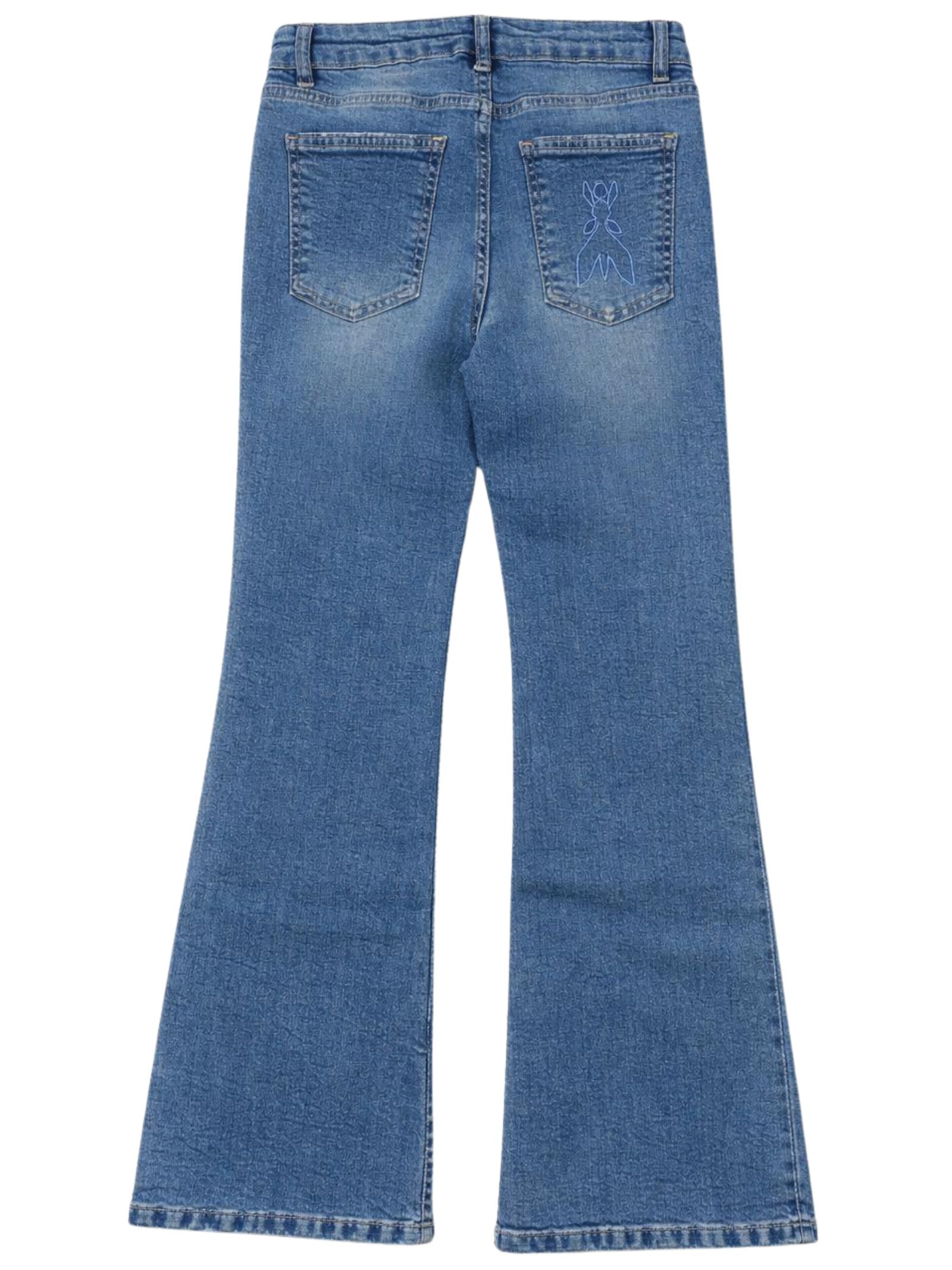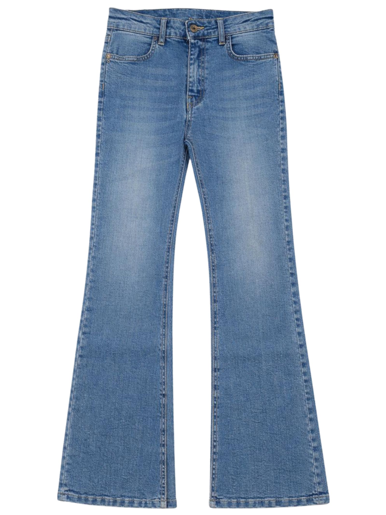 Patrizia Pepe Kids jeans dal lavaggio azzurro medio-scuro, dettaglio sbiaditure, vita regolabile all'interno, chiusura con bottone e zip, modello con 4 tasche, logo frontale, design a zampa con spacchetti laterali. Composizione: 85% cotone 15% elastan. Made in Italy