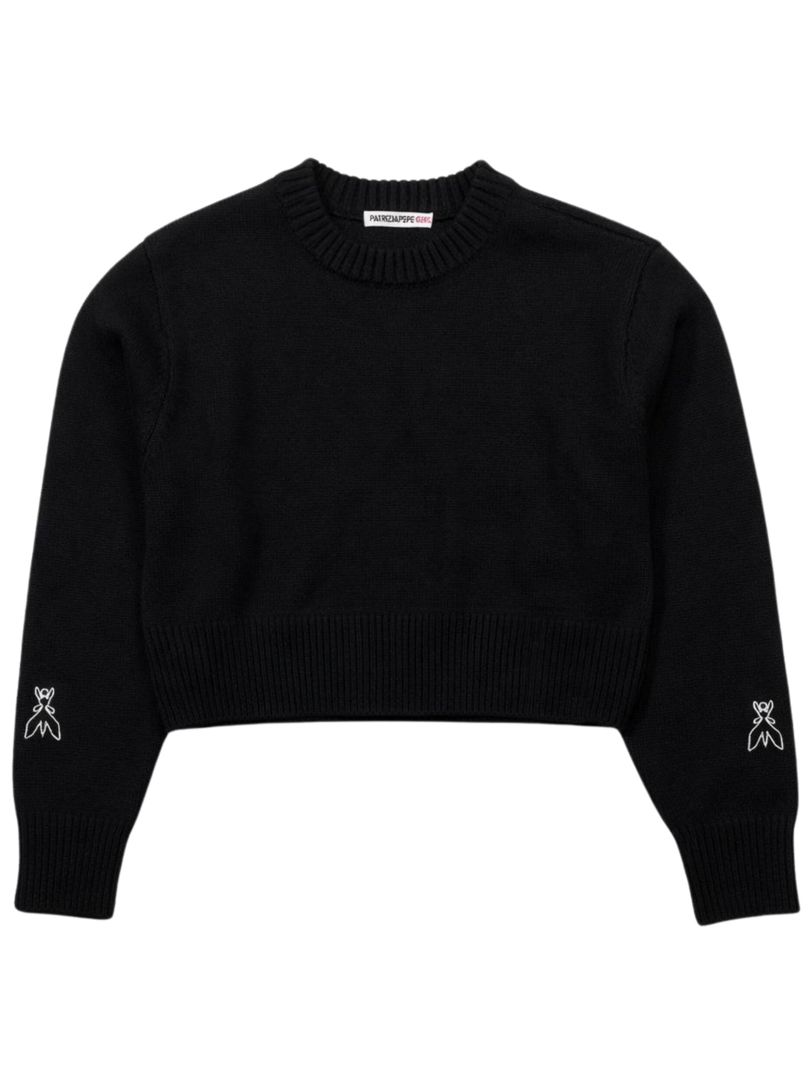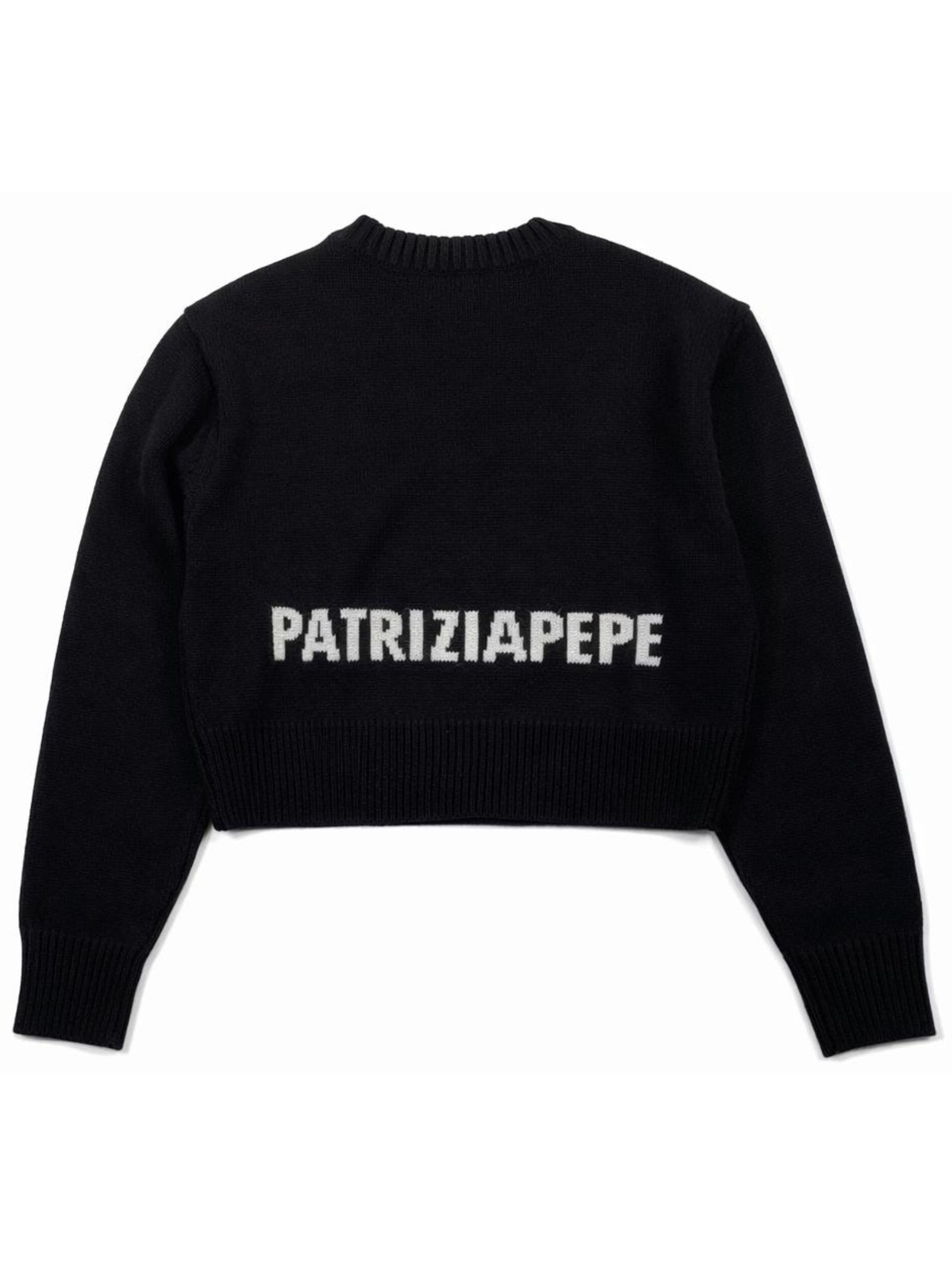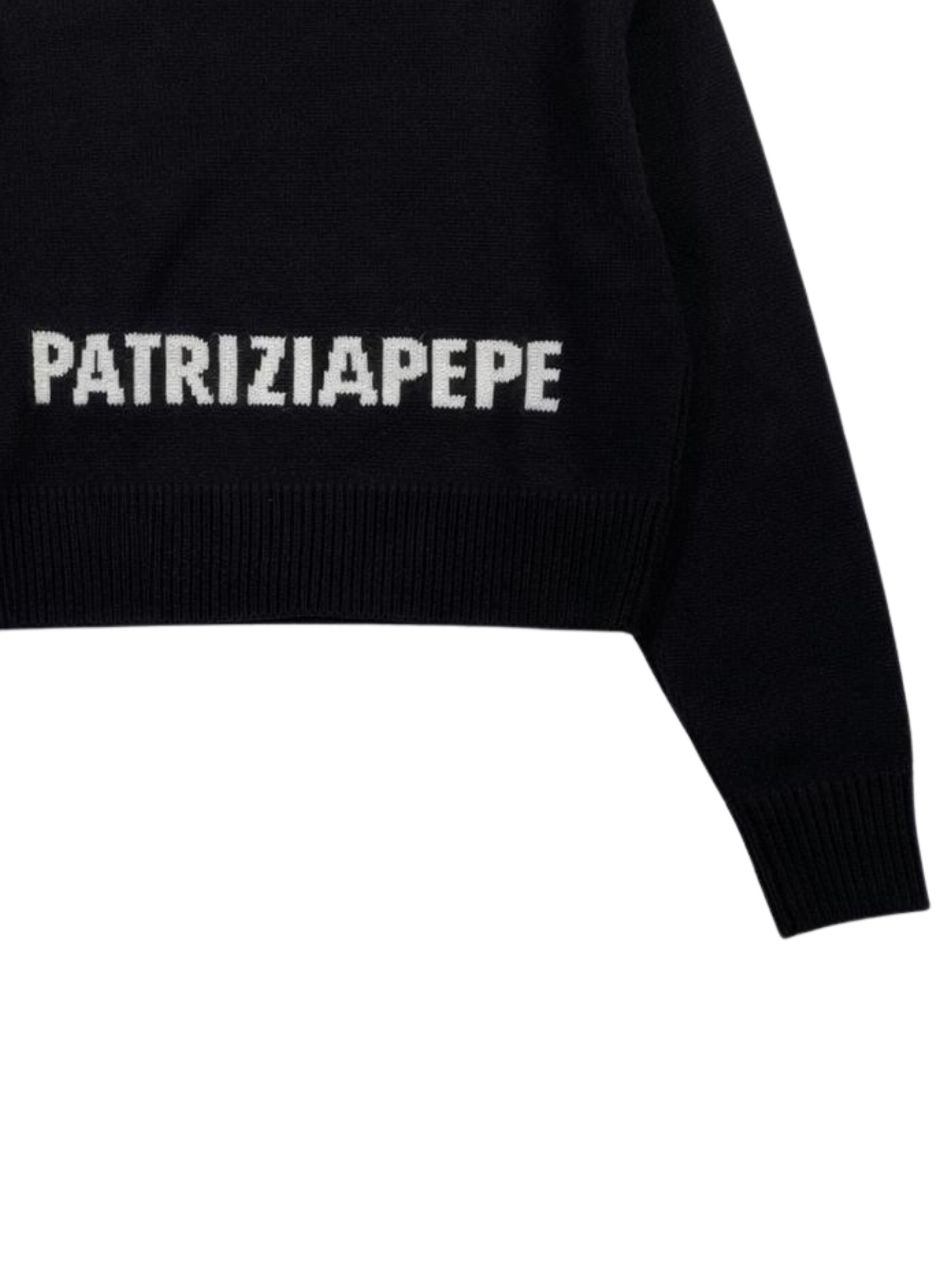 Patrizia Pepe Kids maglione di colore nero, dettaglio logo intarsiato sul retro a contrasto bianco, design corto, girocollo, maniche lunghe, orli a costine, vestibilità regolare. Composizione: 50% Acrilica 50% lana