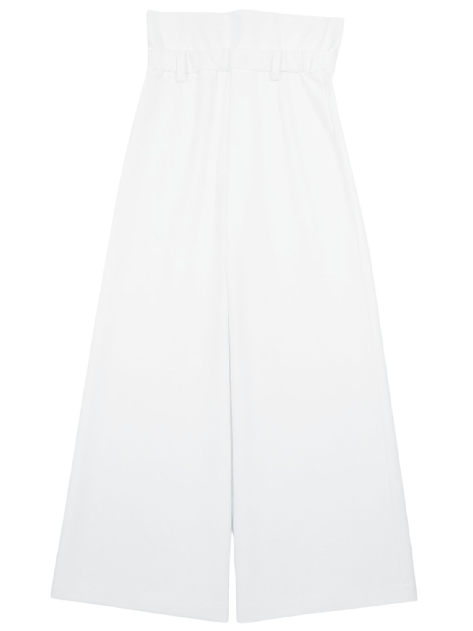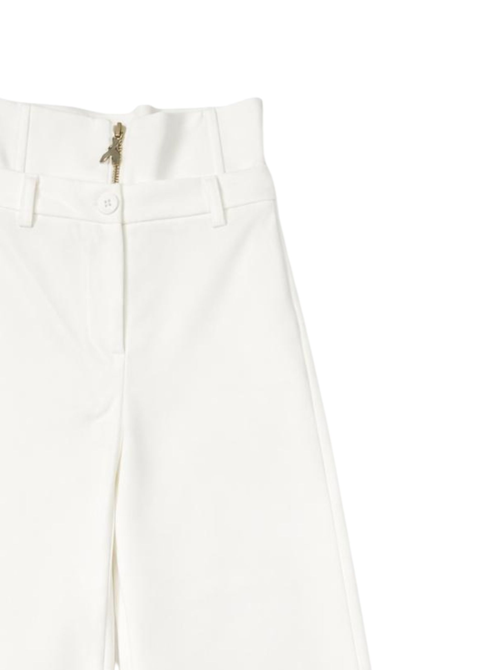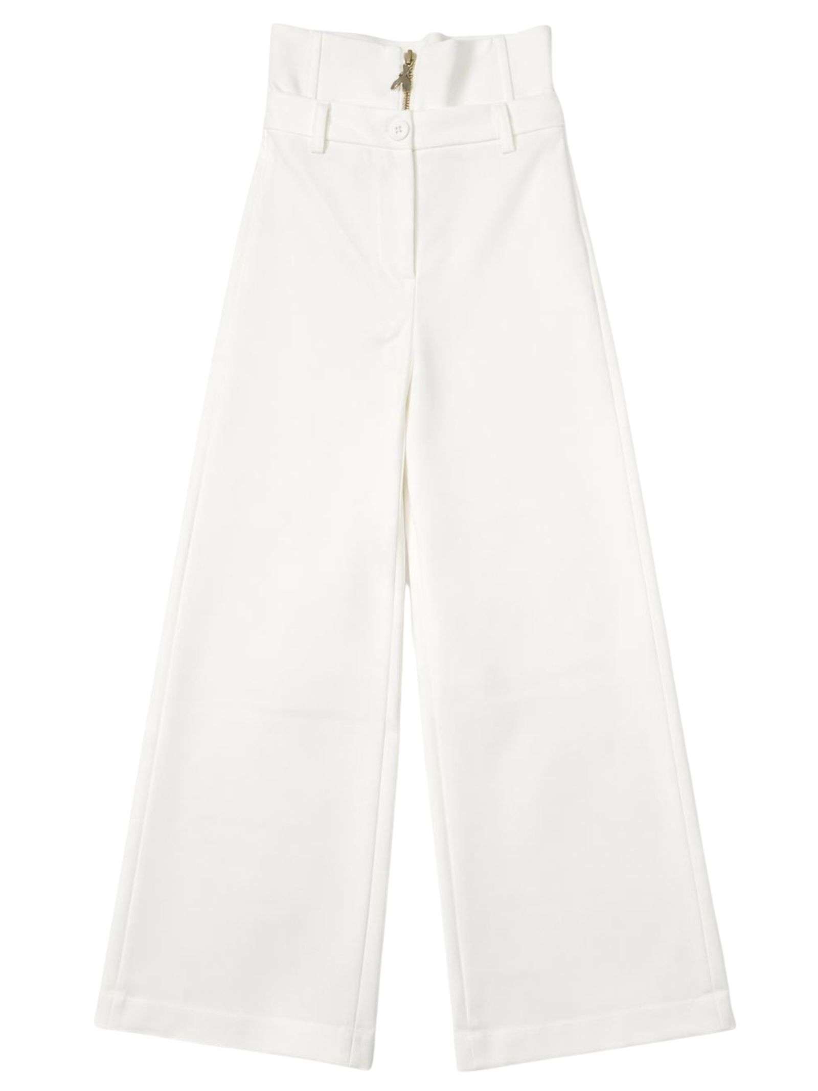 Patrizia Pepe Kids pantalone di colore bianco, modello classico a vita alta, elastico posteriore in vita, doppia chiusura centrale con bottone e zip, passanti, applicazione logo in metallo, taglio svasato, vestibilità ampia. Composizione: 95% poliestere 5% elastan. Made in Italy