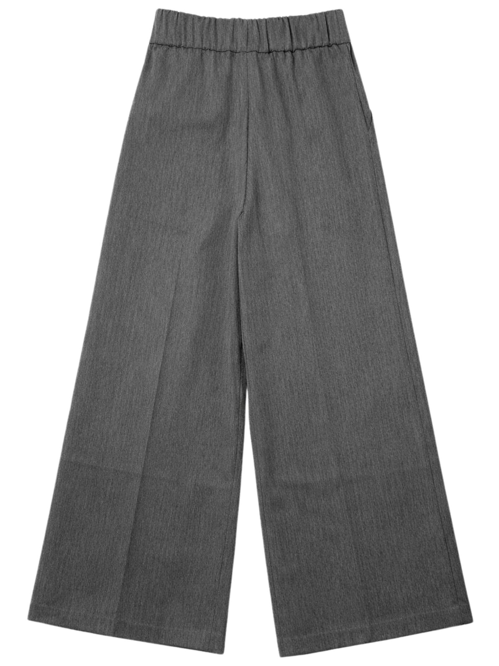 Patrizia Pepe Kids pantalone di colore grigio, modello con elastico in vita sul retro, due tasche laterali, taglio svasato, vestibilità ampia. Composizione: 74% poliestere 23% viscosa 3% elastan. Made in Italy