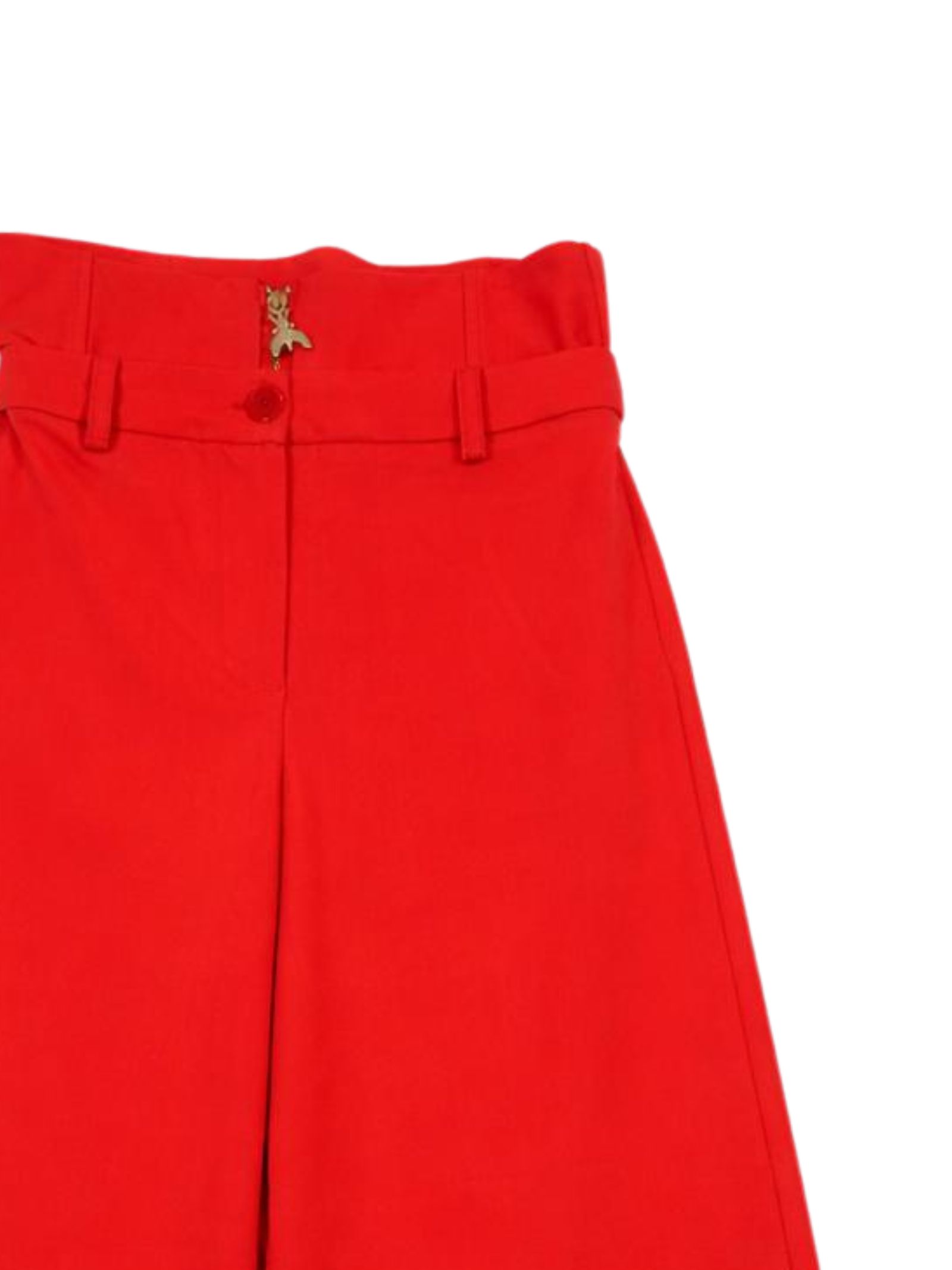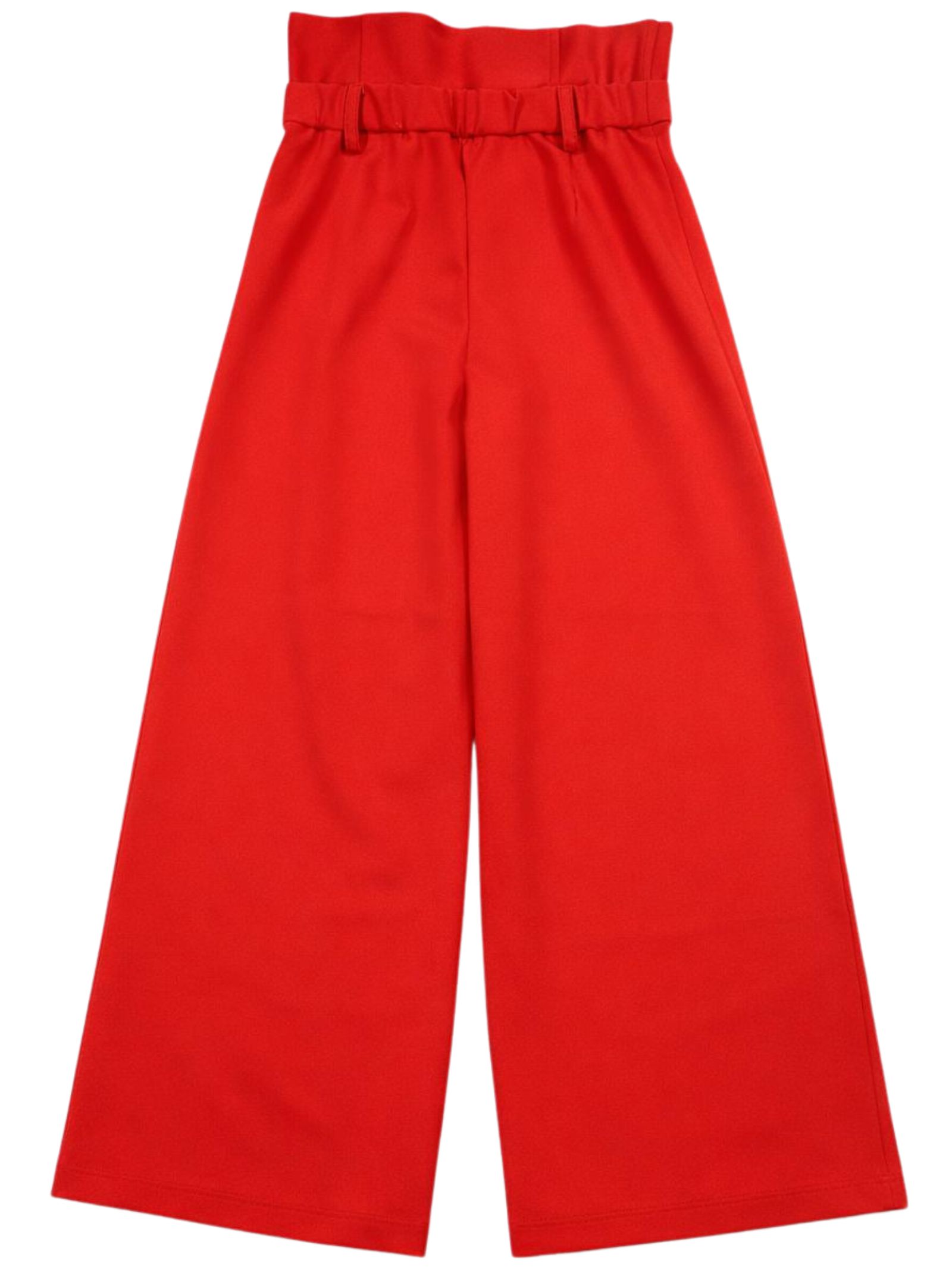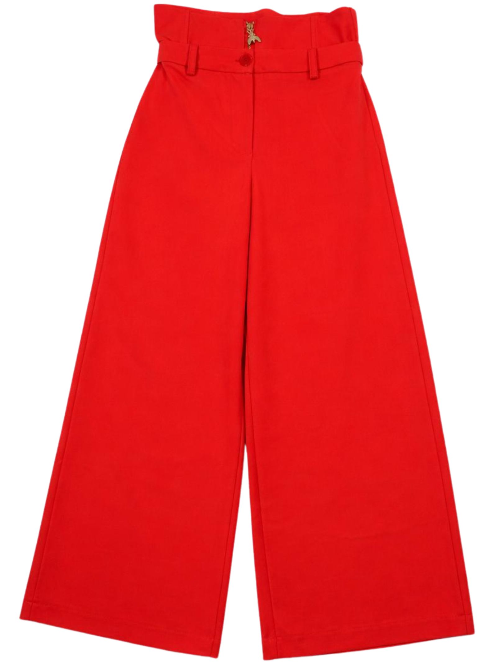 Patrizia Pepe Kids pantalone di colore rosso corallo, modello classico a vita alta, elastico posteriore in vita, doppia chiusura centrale con bottone e zip, passanti, applicazione logo in metallo, taglio svasato, vestibilità ampia. Composizione: 95% poliestere 5% elastan. Made in Italy