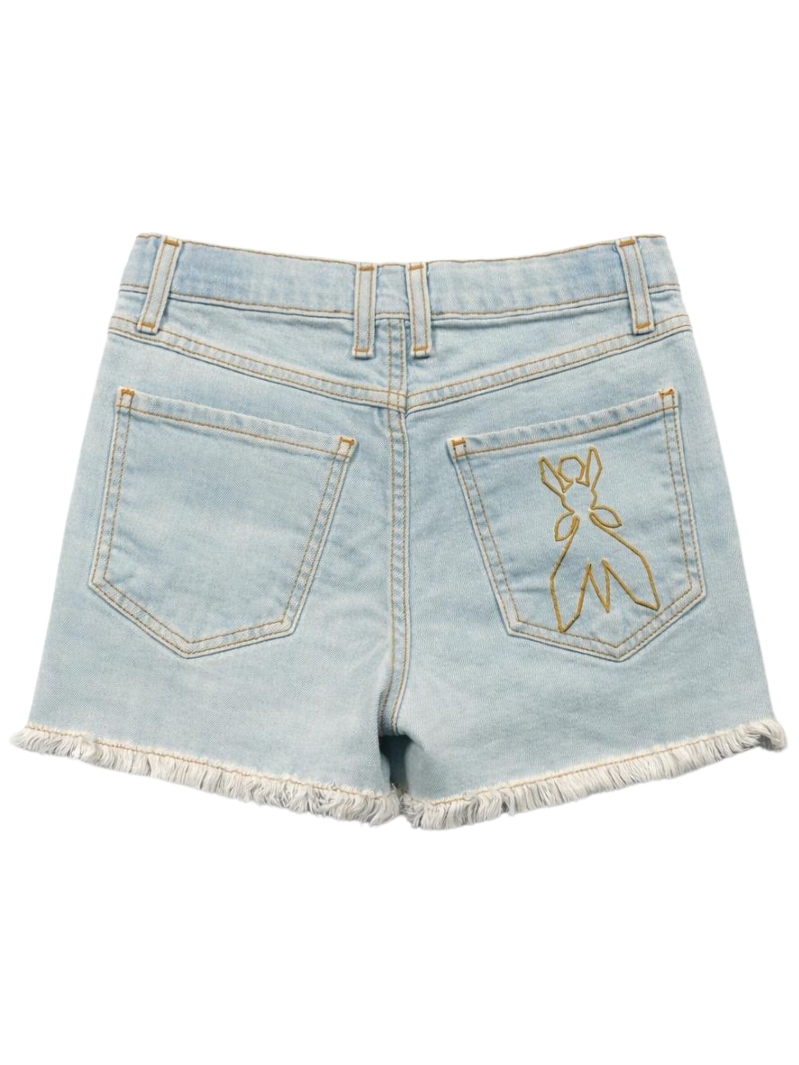Patrizia Pepe Kids shorts realizzato in cotone denim dal lavaggio chiaro, vita regolabile all'interno, chiusura con bottone e zip, modello con 4 tasche, orli sfrangiati, logo ricamato sul retro, design aderente. Composizione: 99% cotone 1% elastan. Made in Italy