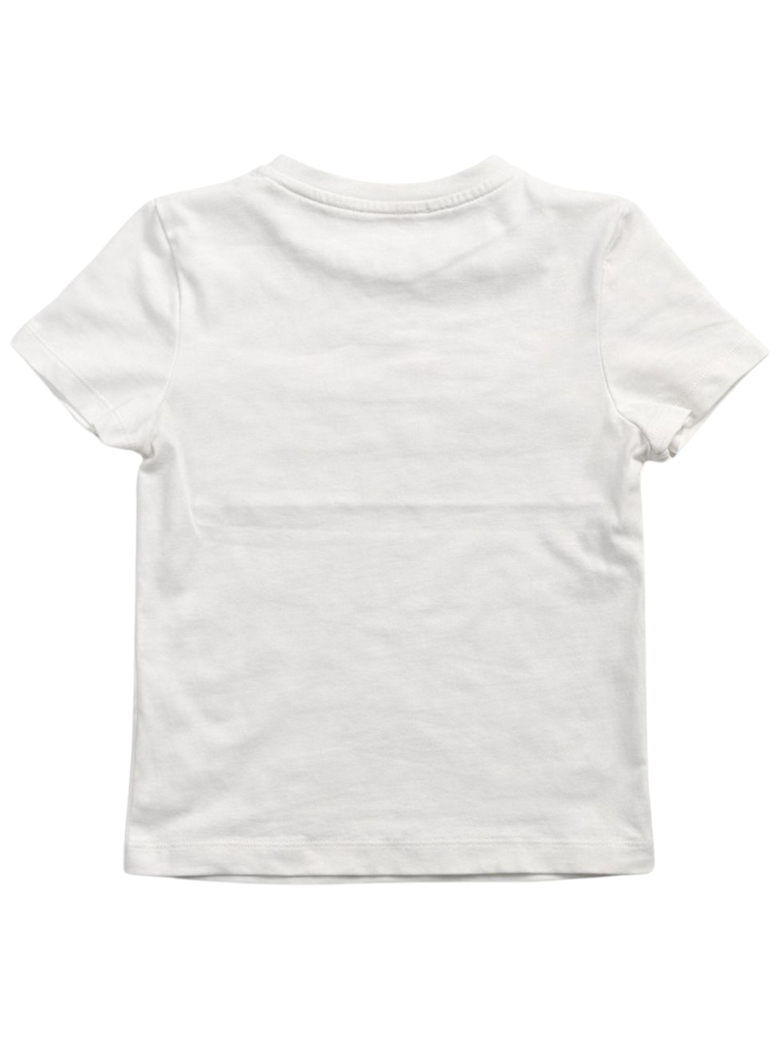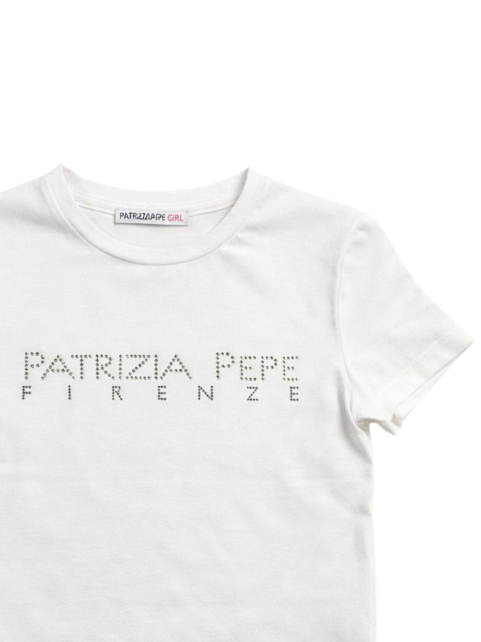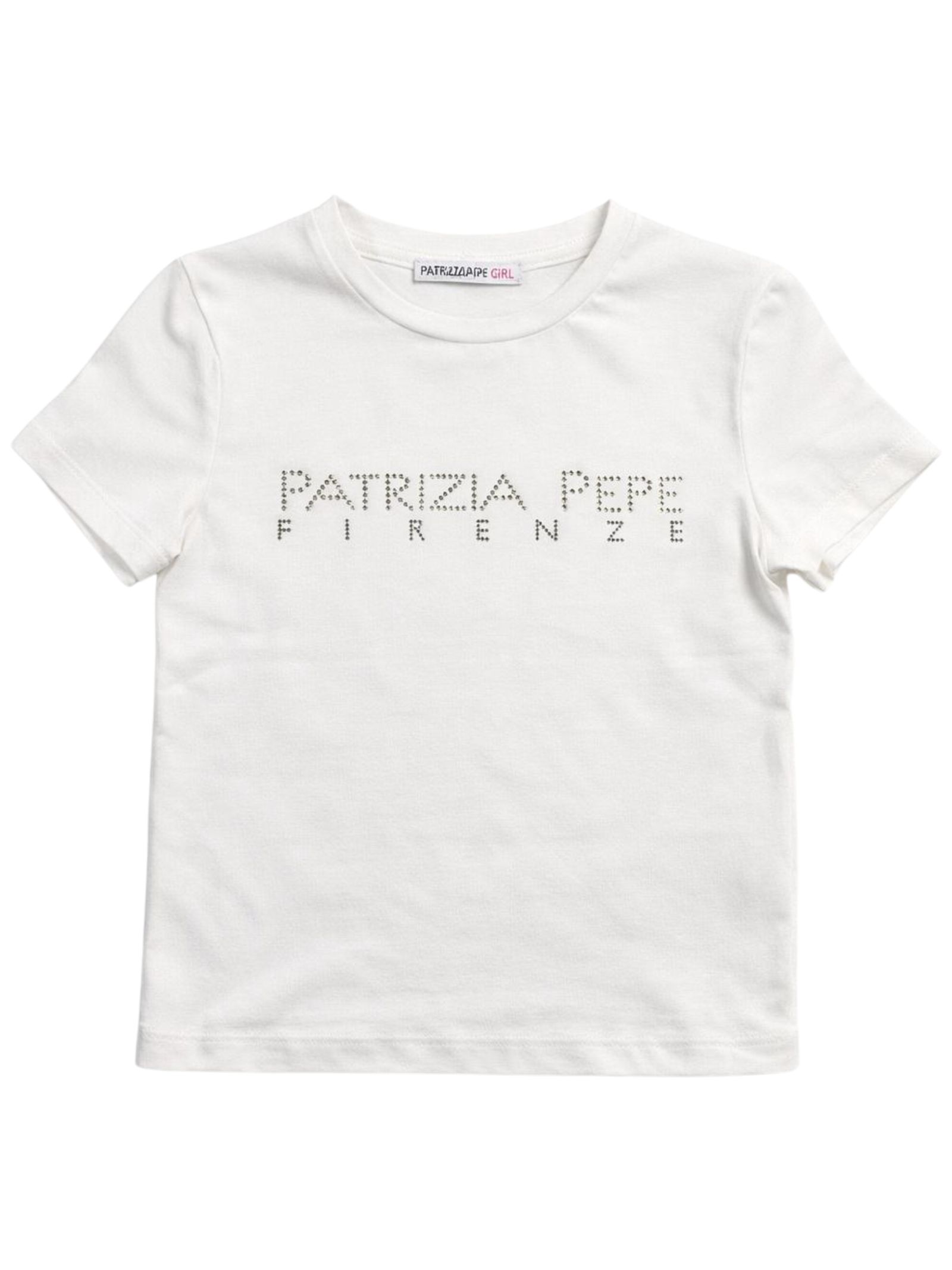 Patrizia Pepe Kids t-shirt di colore bianco, modello girocollo, mezze maniche, logo centrale in strass a contrasto nero, orlo dritto, vestibilità regolare. Composizione: 95% cotone 5% elastan. Made in Italy