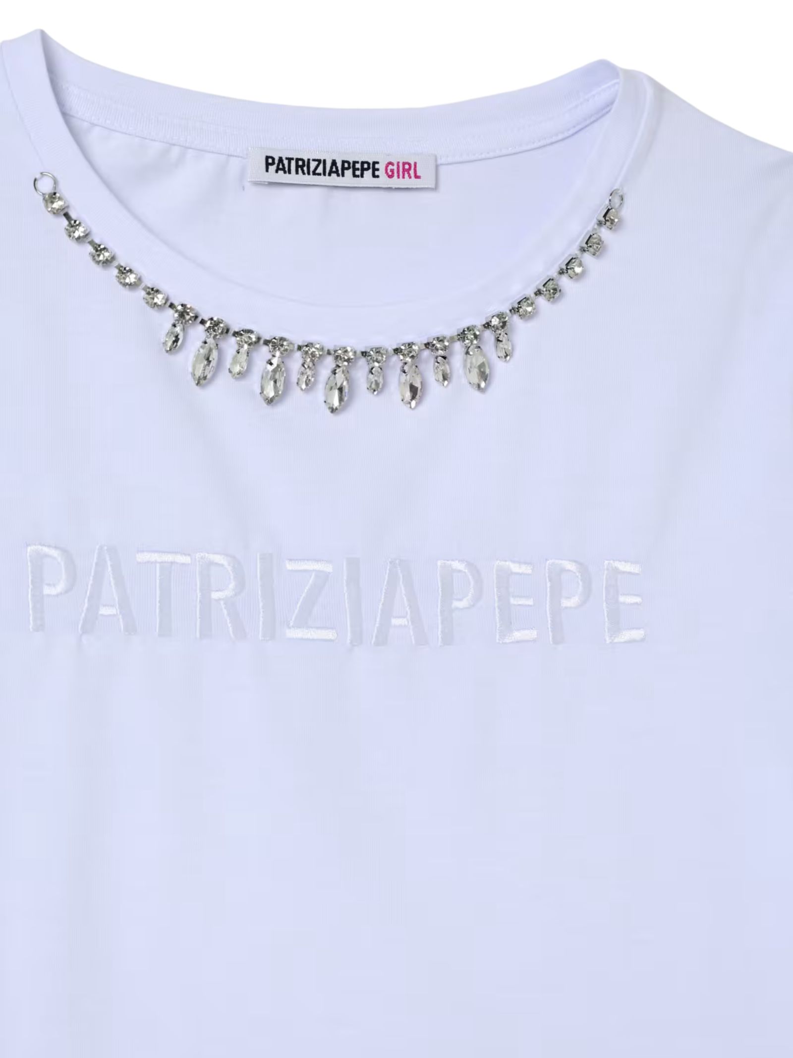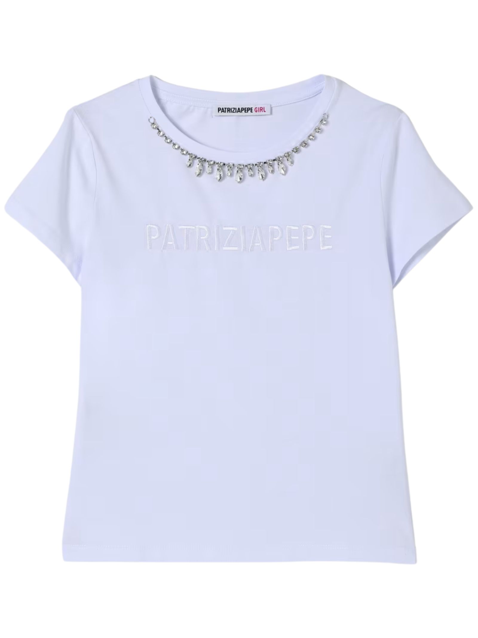 Patrizia Pepe Kids t-shirt di colore bianco, modello girocollo, mezza manica, caratterizzata da collana di strass, ricamo centrale logo, vestibilità regolare. Composizione: 100% cotone