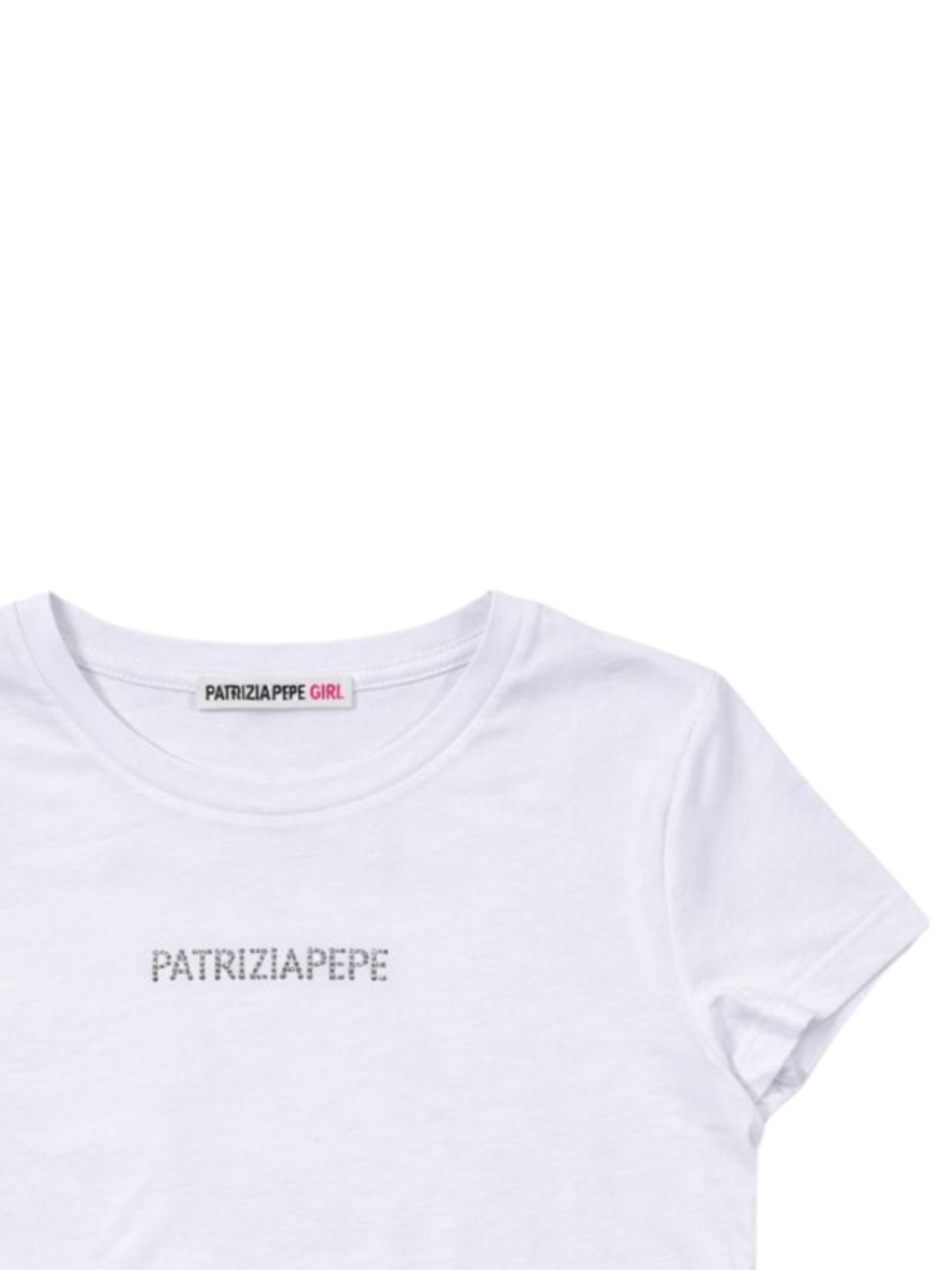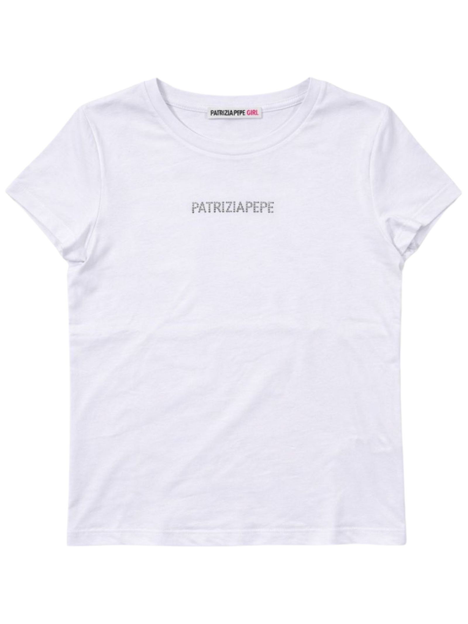 Patrizia Pepe Kids t-shirt di colore bianco, modello girocollo, mezze maniche, logo centrale in strass, orlo dritto, vestibilità regolare. Composizione: 95% cotone 5% elastan