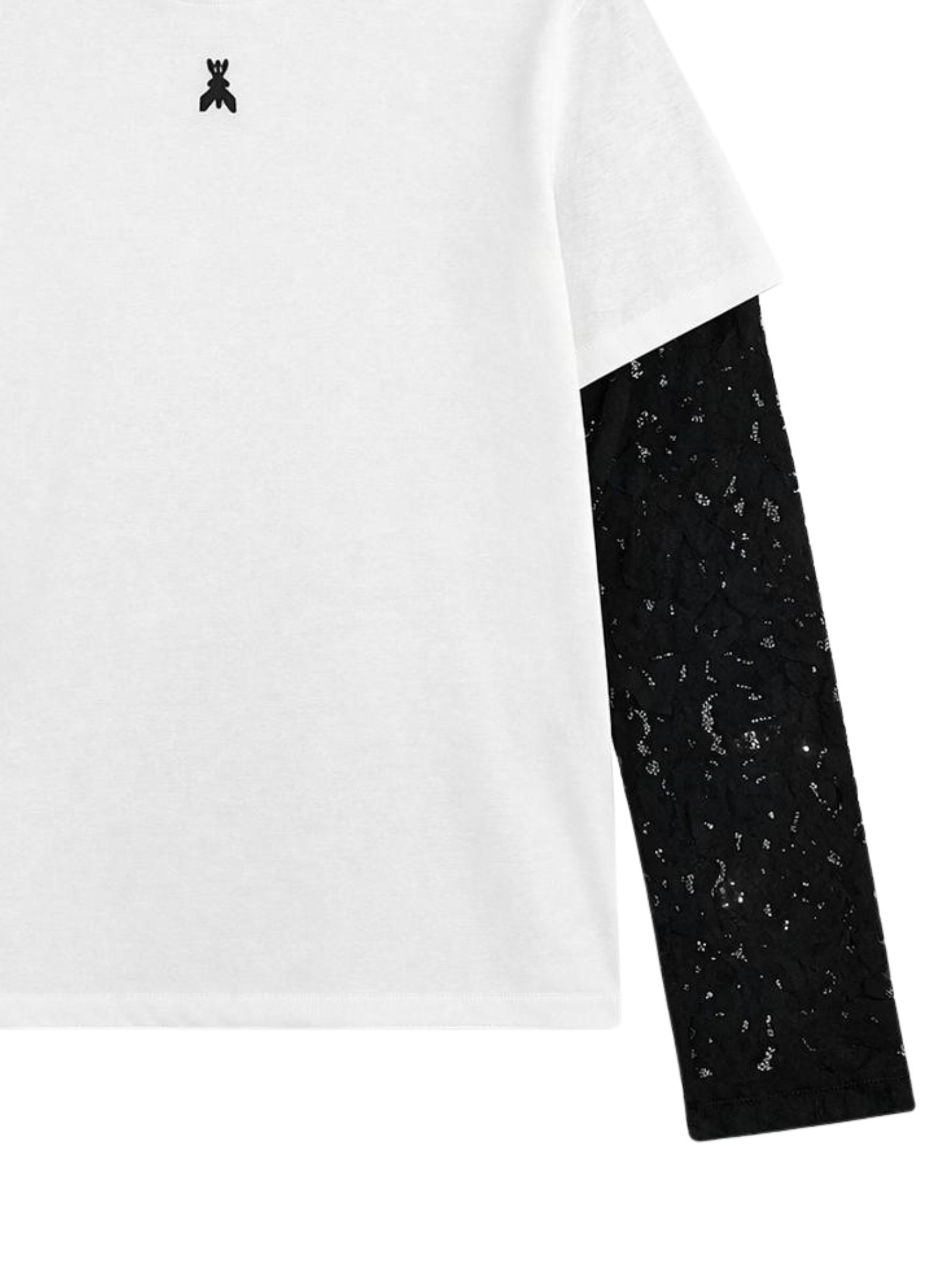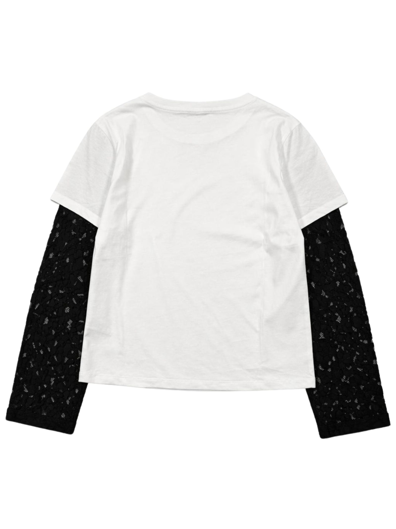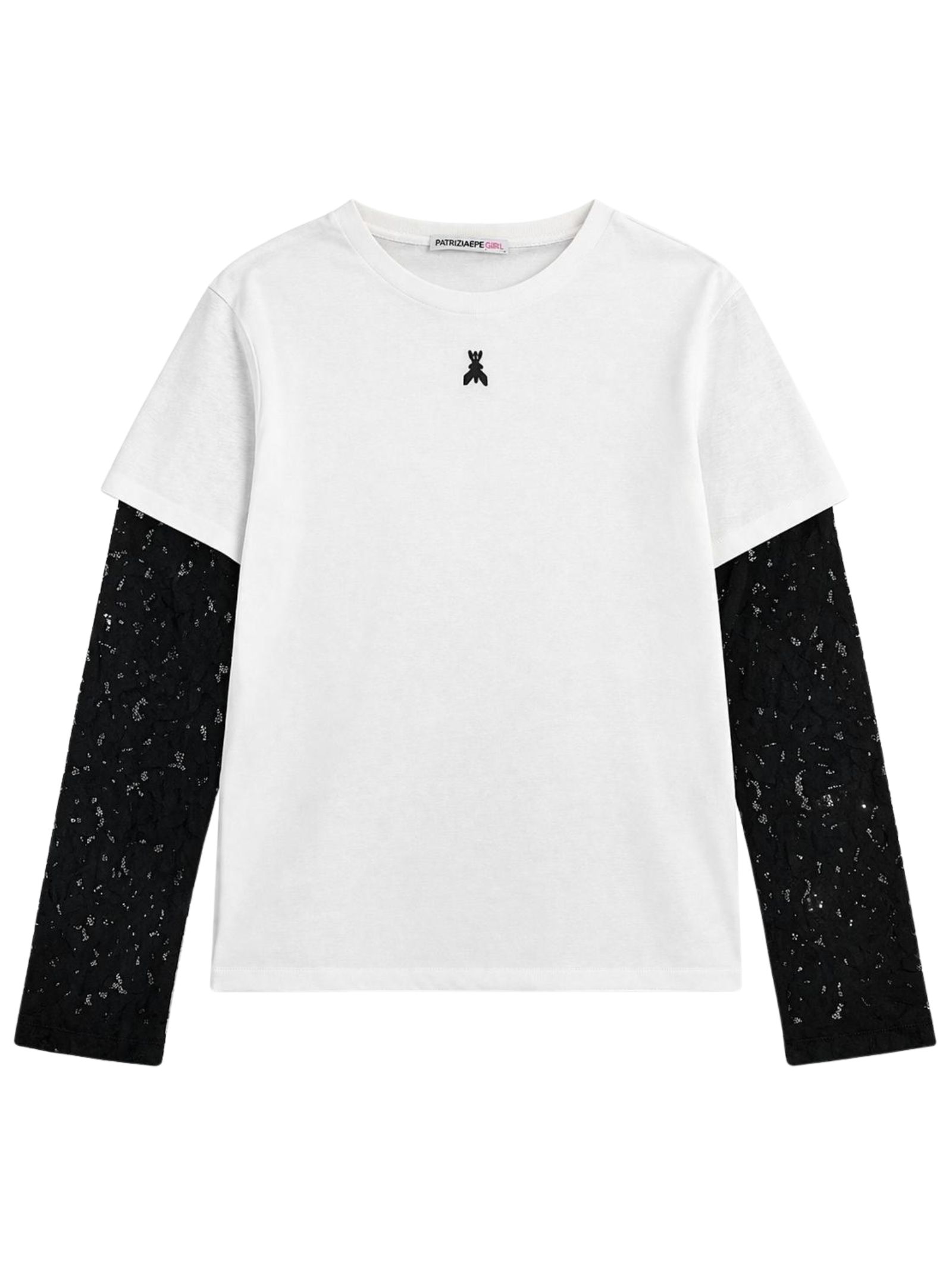 Patrizia Pepe Kids t-shirt di colore bianco, modello girocollo, manica lunga in merletto a contrasto nero, caratterizzata da logo centrale in rilievo, vestibilità regolare. Composizione: 95% Cotone 5% Elastan