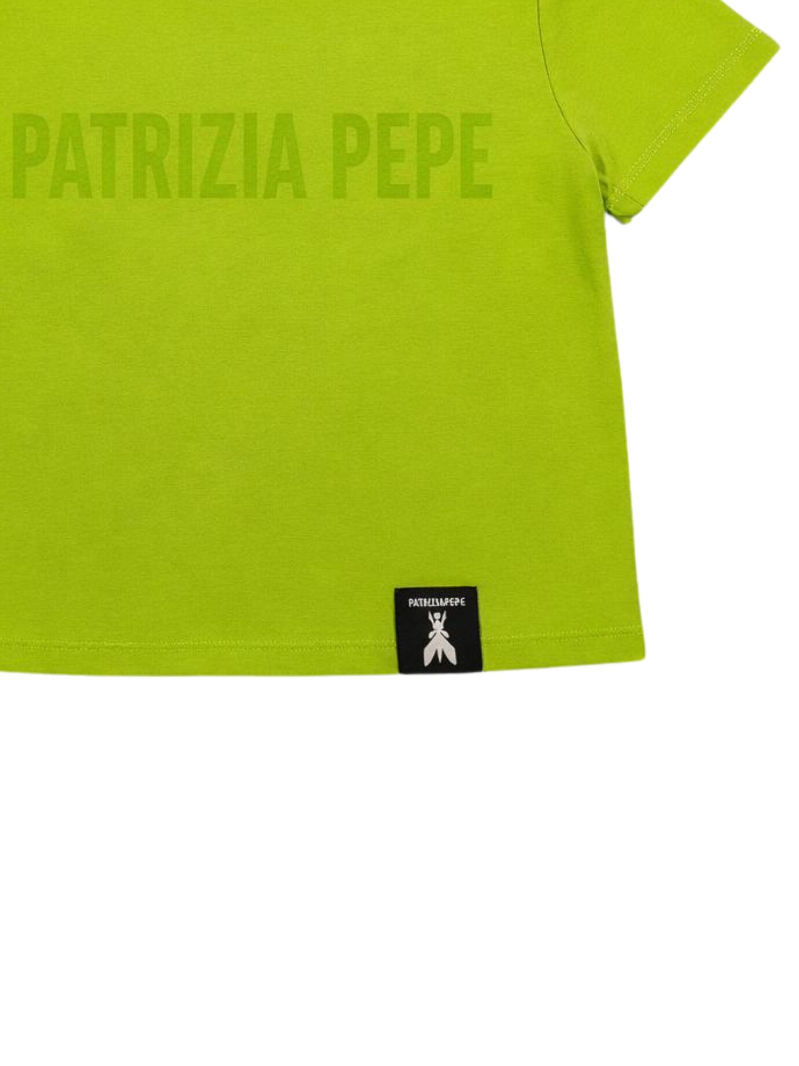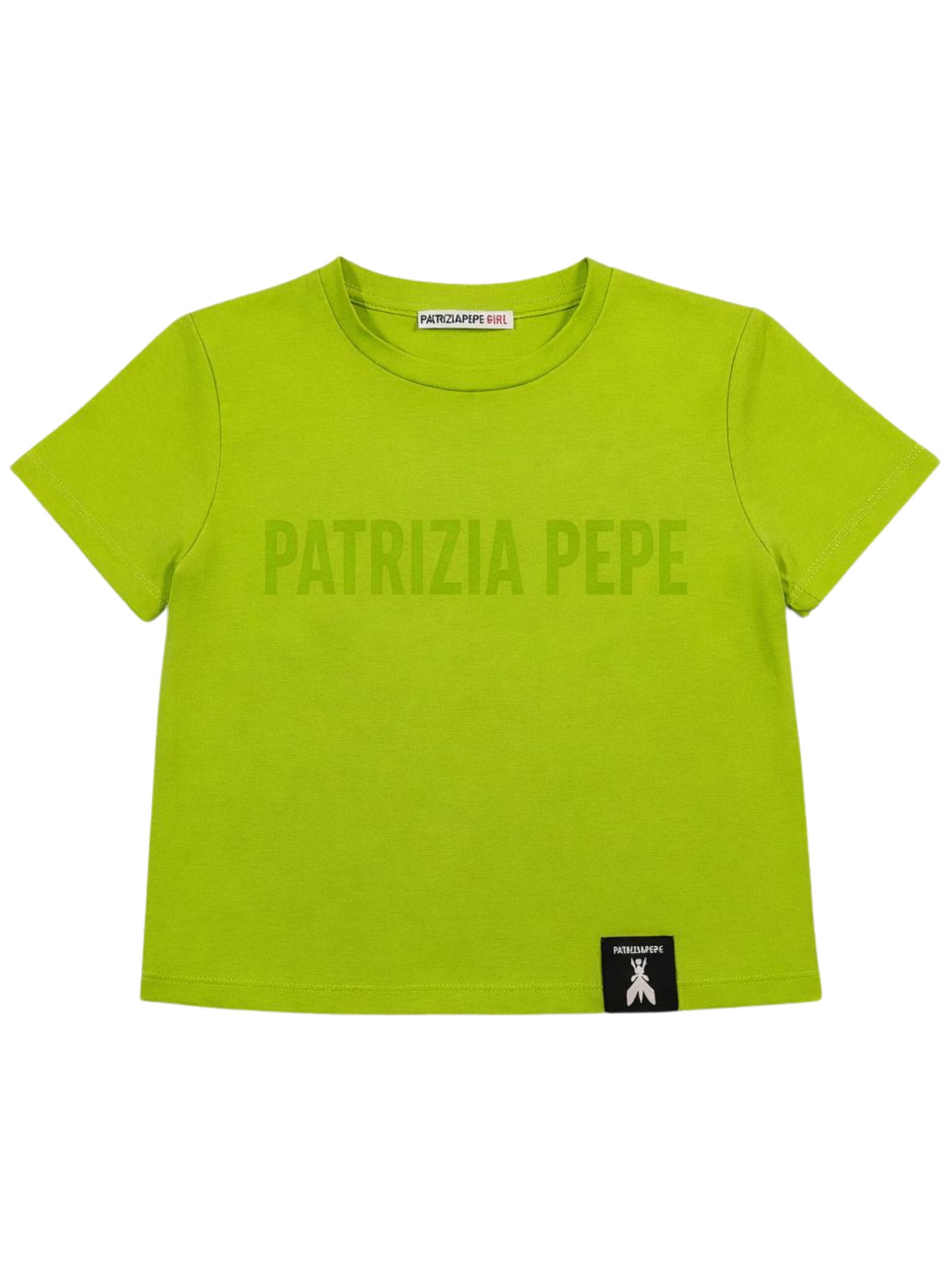 Patrizia Pepe Kids t-shirt di colore verde fluo, modello corto, girocollo, mezza manica, caratterizzata da stampa centrale con logo a contrasto, patch con logo applicato, vestibilità regolare. Composizione: 95% Cotone 5% Elastan. Made in Italy
