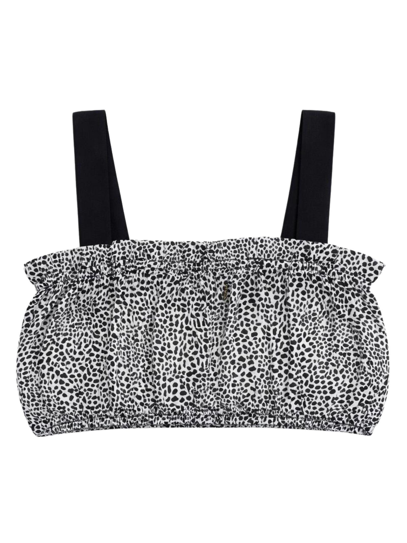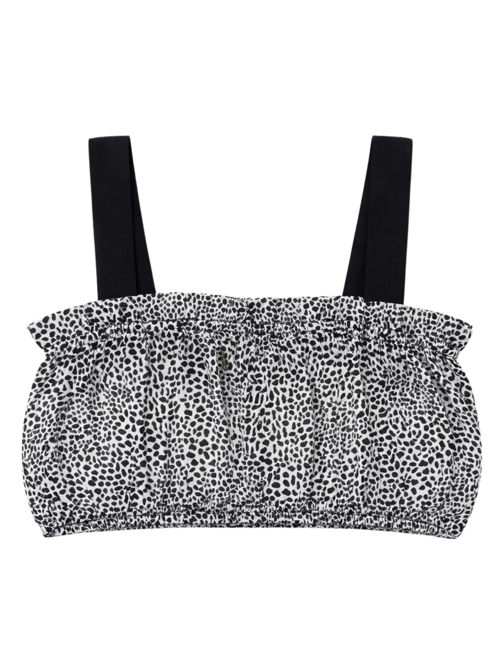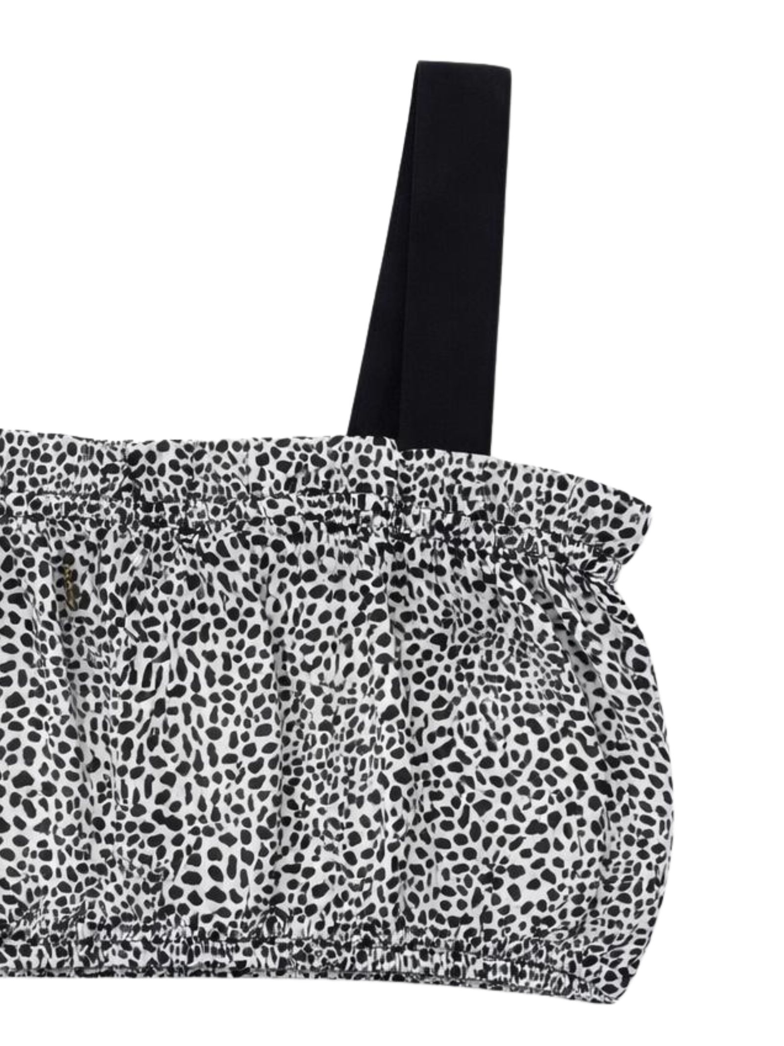 Patrizia Pepe Kids top in fantasia all-over di colore nero/bianco, modello con corto, bretelle, applicazione logo in metallo, orli con elastico. Composizione: 100% viscosa. Made in Italy