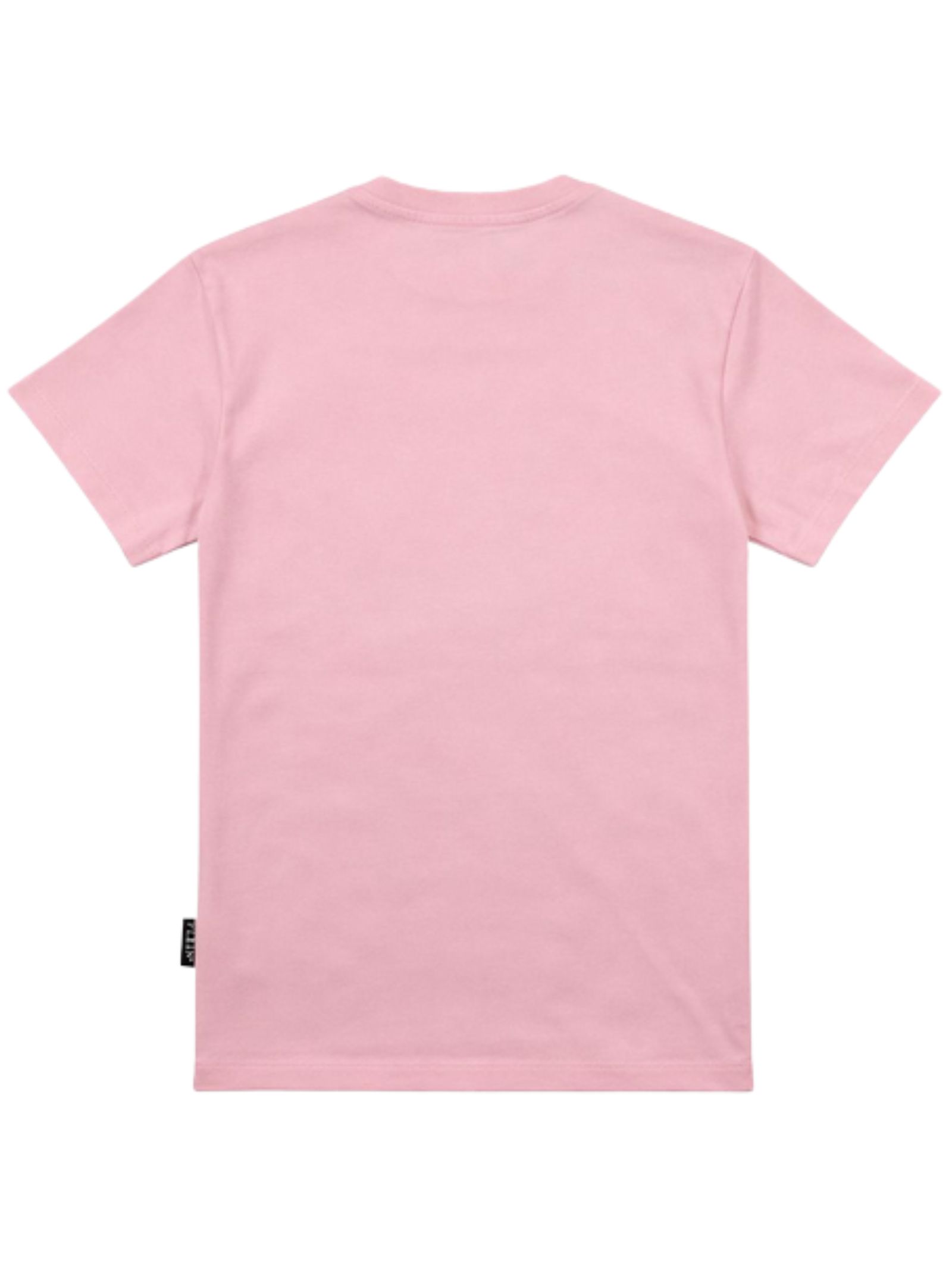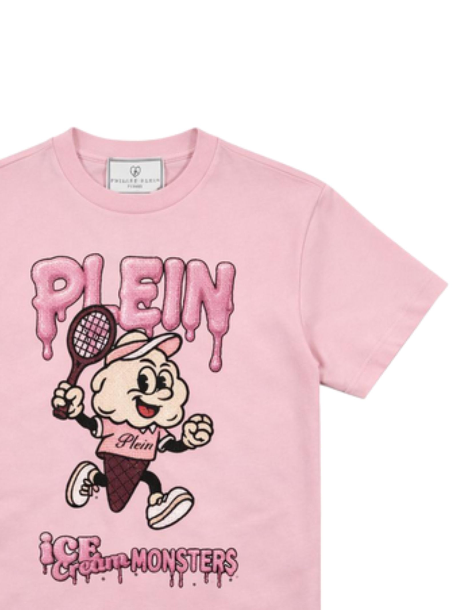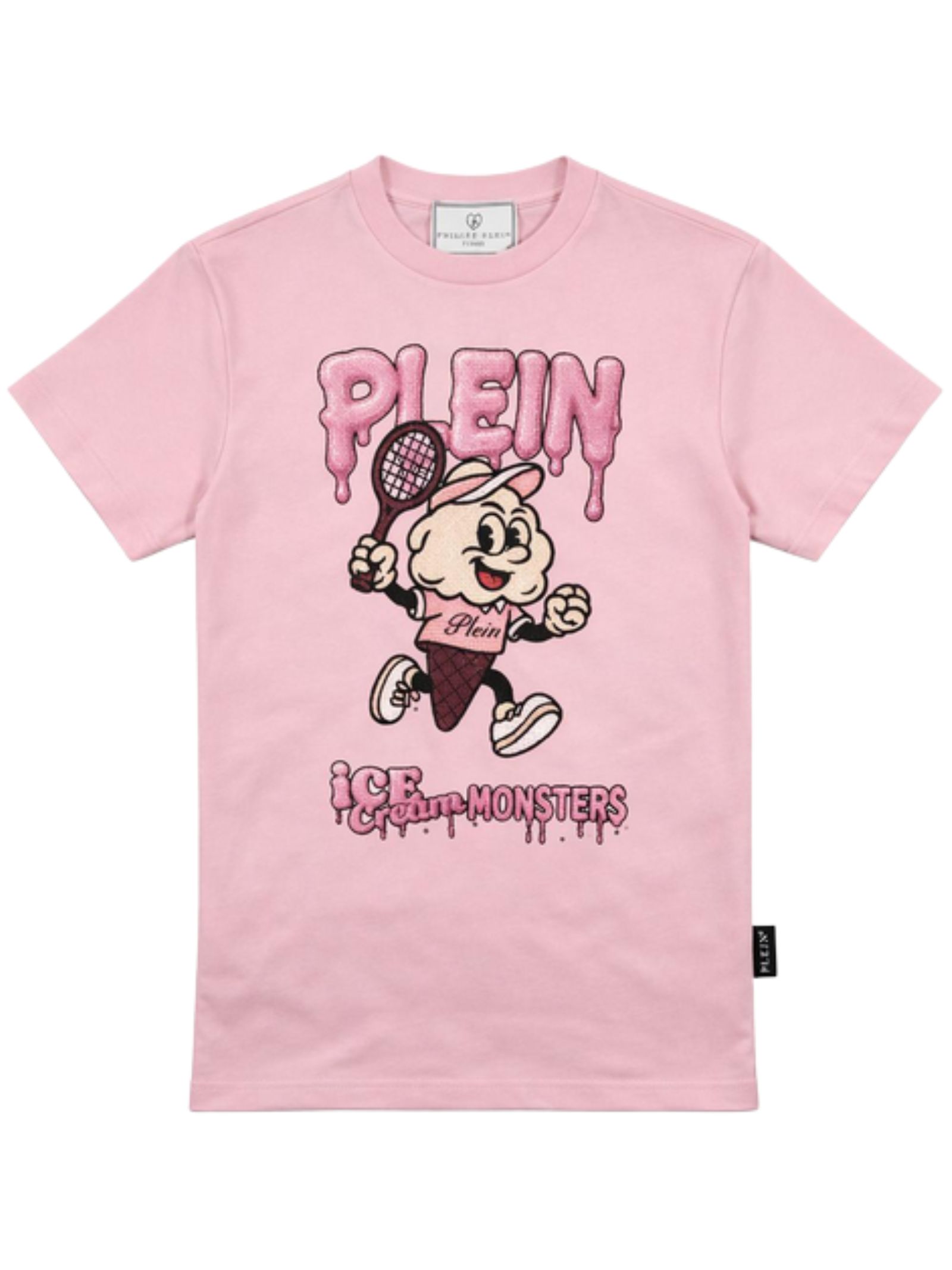 Philipp Plein Kids abito di colore rosa, modello girocollo, mezza manica, stampa a contrasto multicolor con strass, vestibilità regolare, fondo dritto. Composizione: 100% cotone. Made in Italy