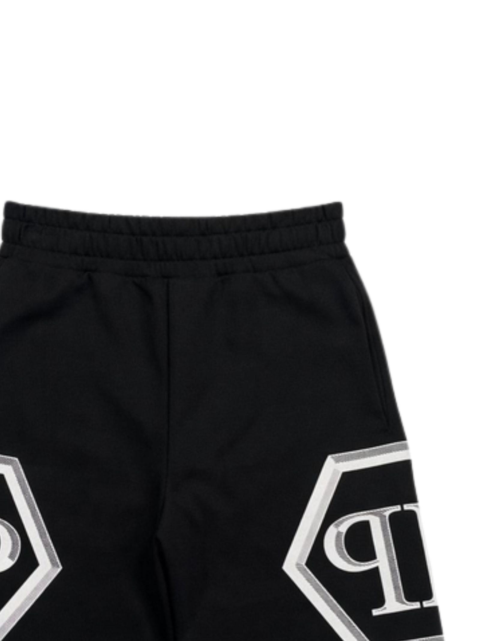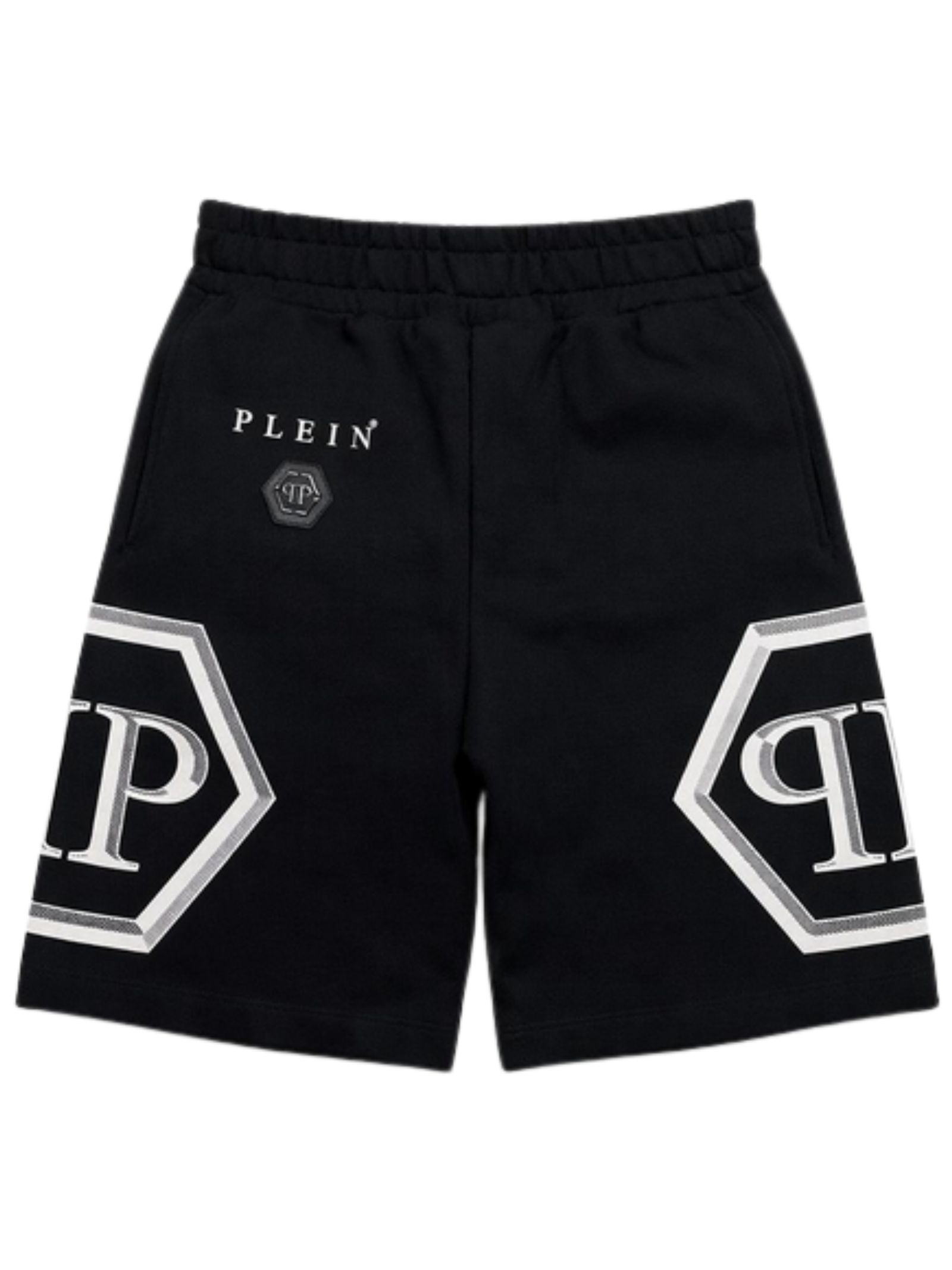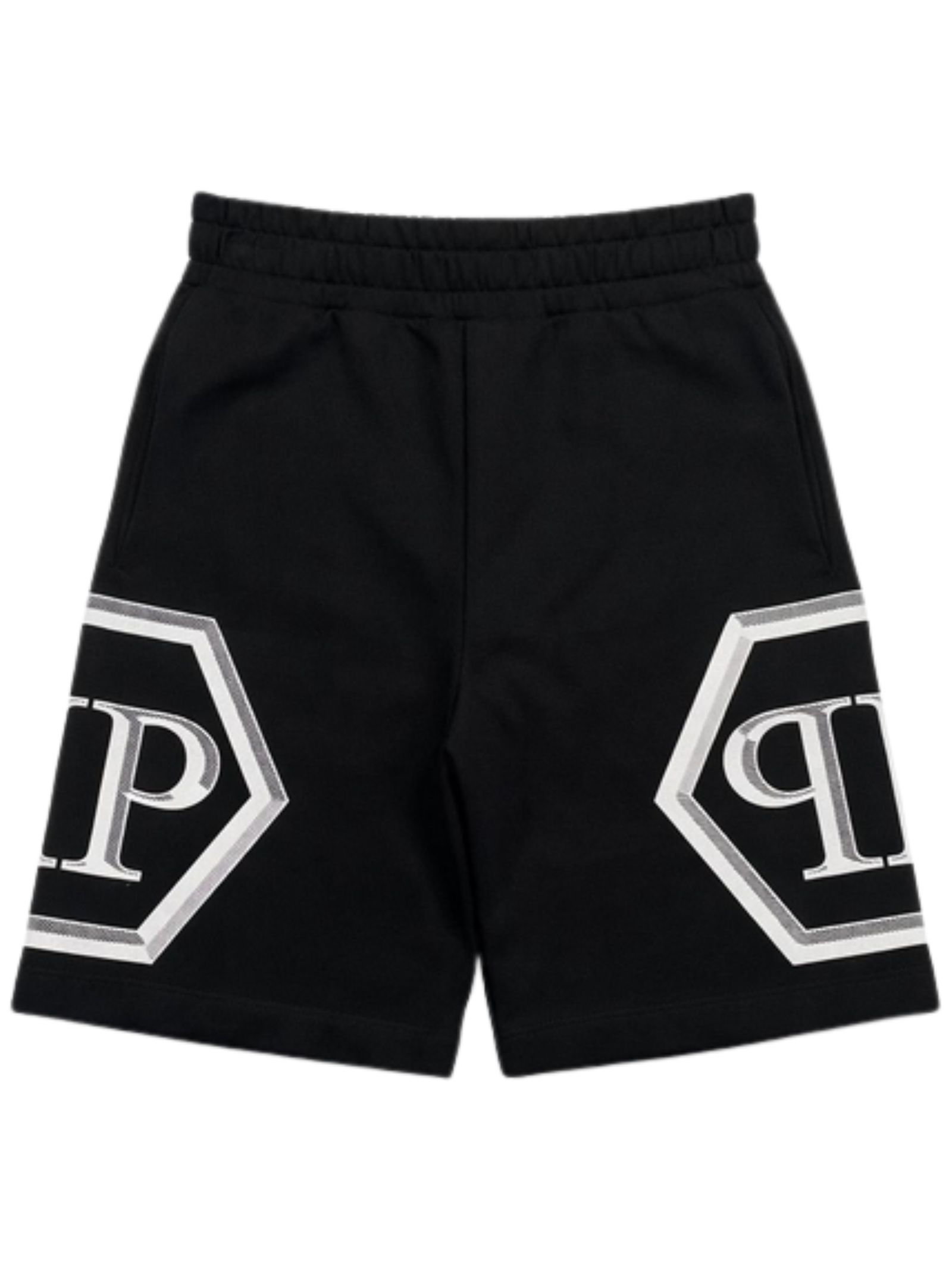 Philipp Plein Kids bermuda di colore nero, stampa logo a contrasto su entrambi i lati, modello con elastico in vita, due tasche laterali, patch con logo applicato, vestibilità regolare. Composizione: 100% cotone