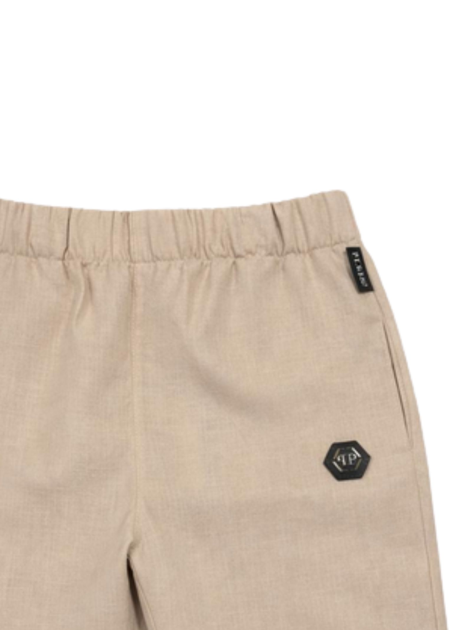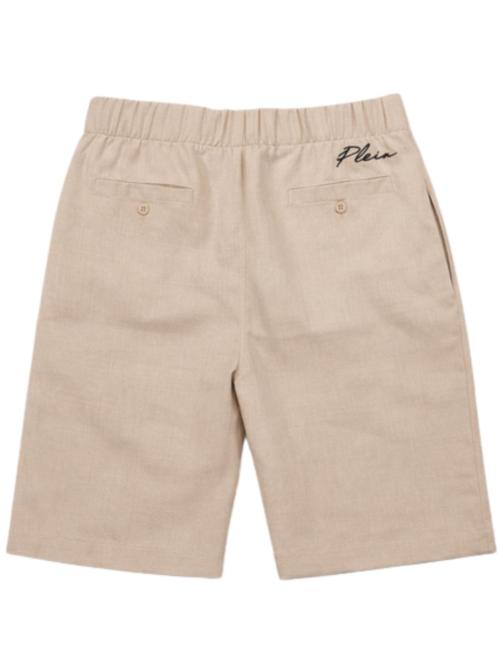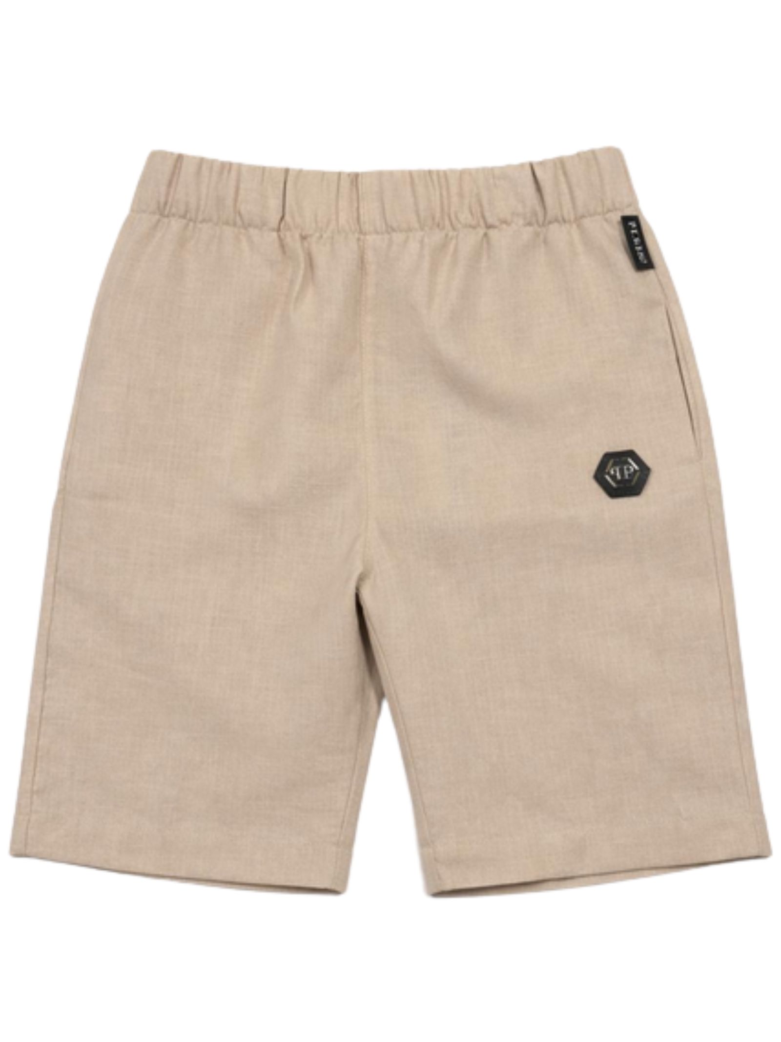 Philipp Plein Kids bermuda di colore sabbia, modello con elastico in vita, due tasche laterali, patch con logo applicato, vestibilità regolare. Composizione: 100% lino. Made in Italy