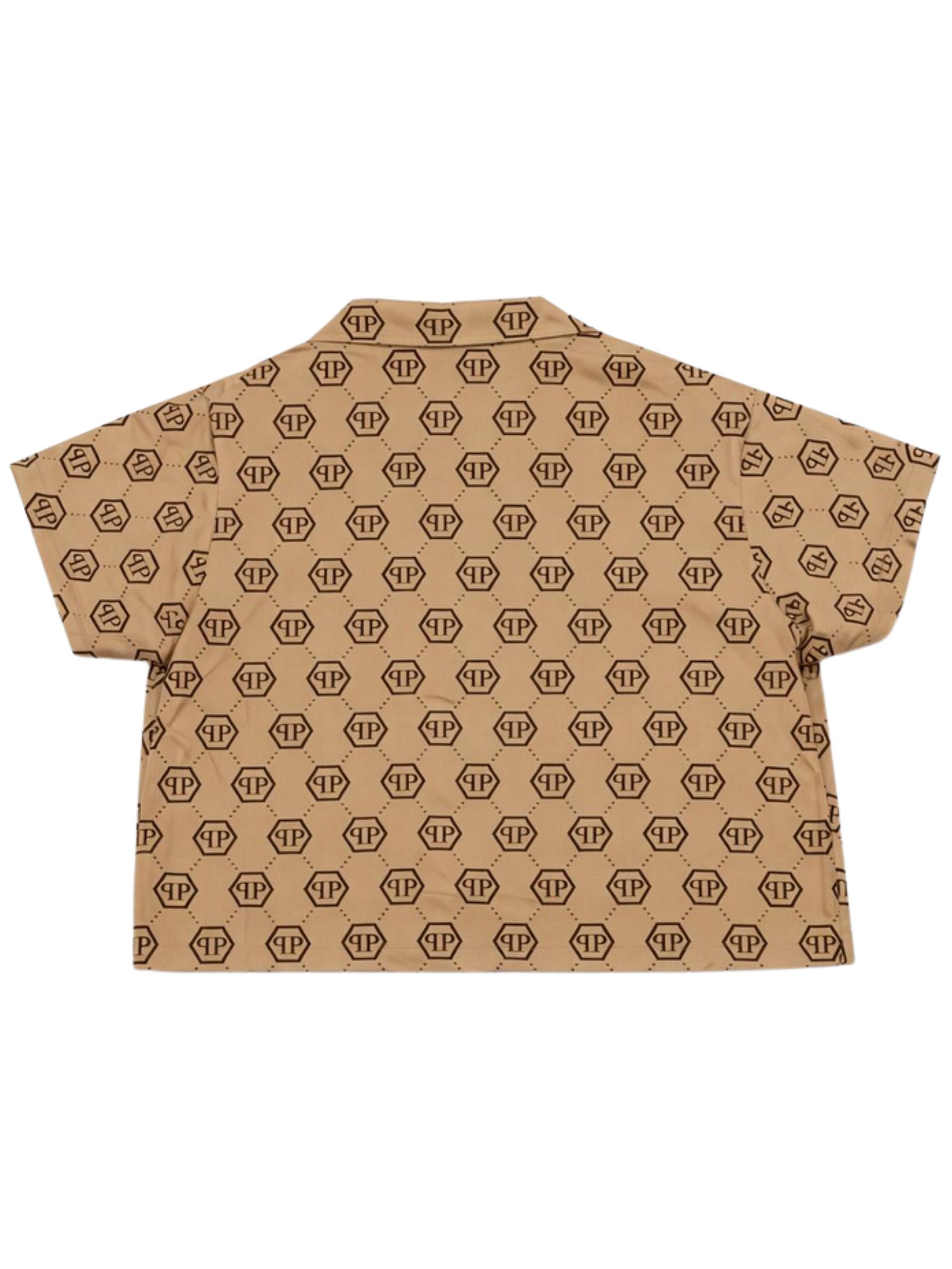 Philipp Plein Kids camicia di colore beige con logo su tutta la superficie, modello mezza manica, stampa a contrasto multicolor con logo, design cropped. Composizione: 100% cotone. Made in Italy