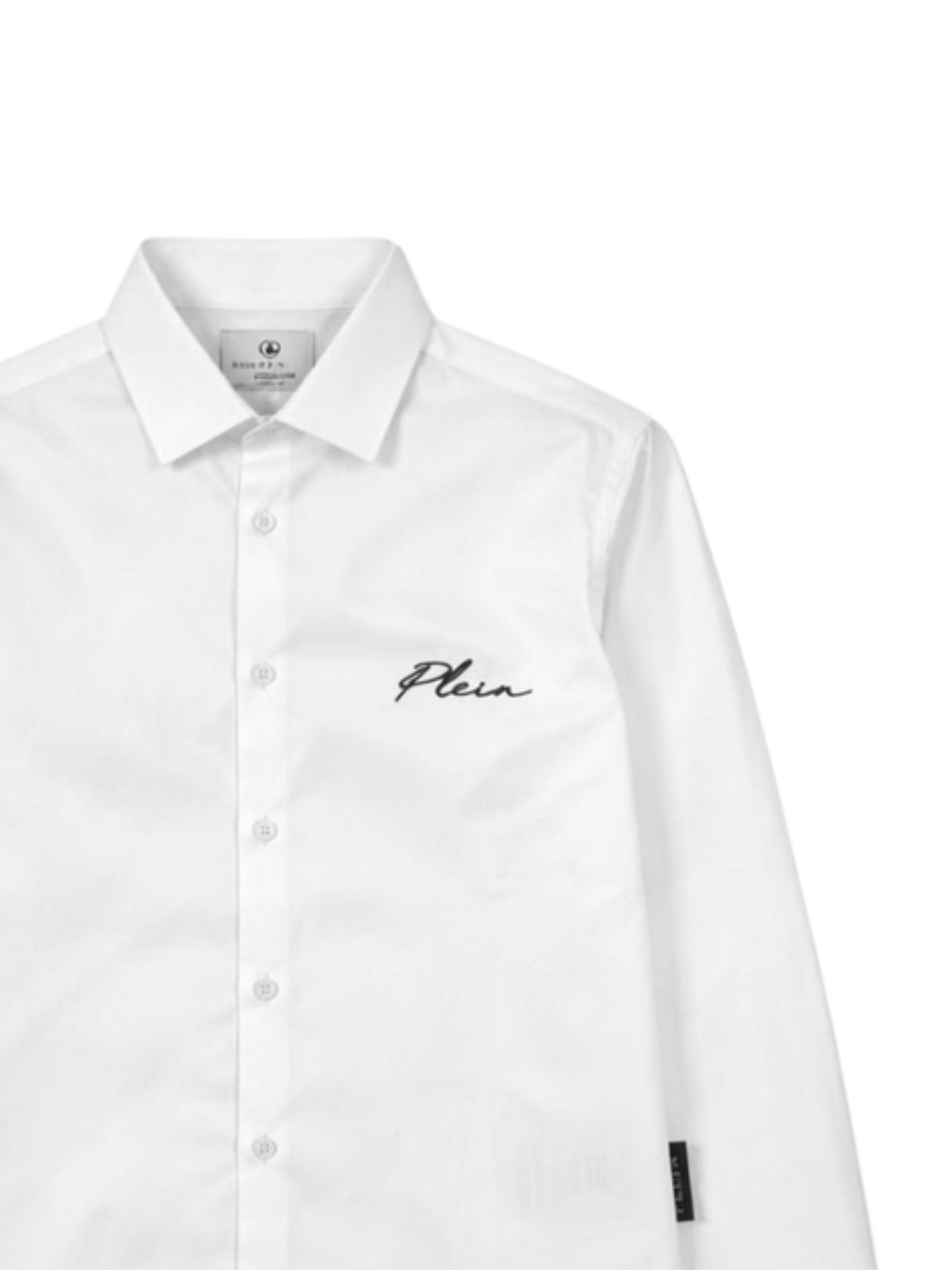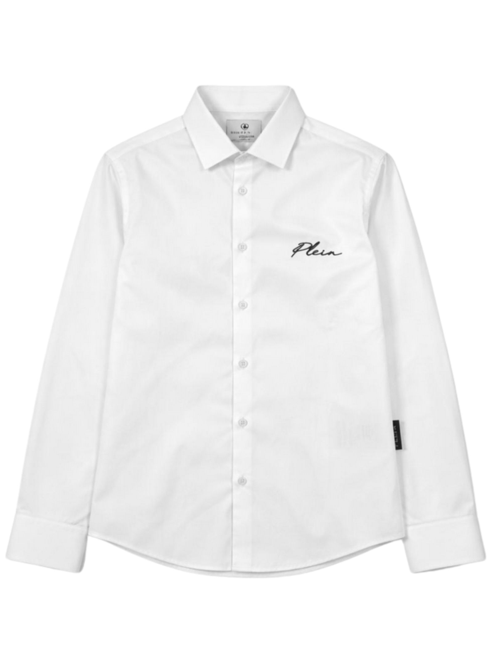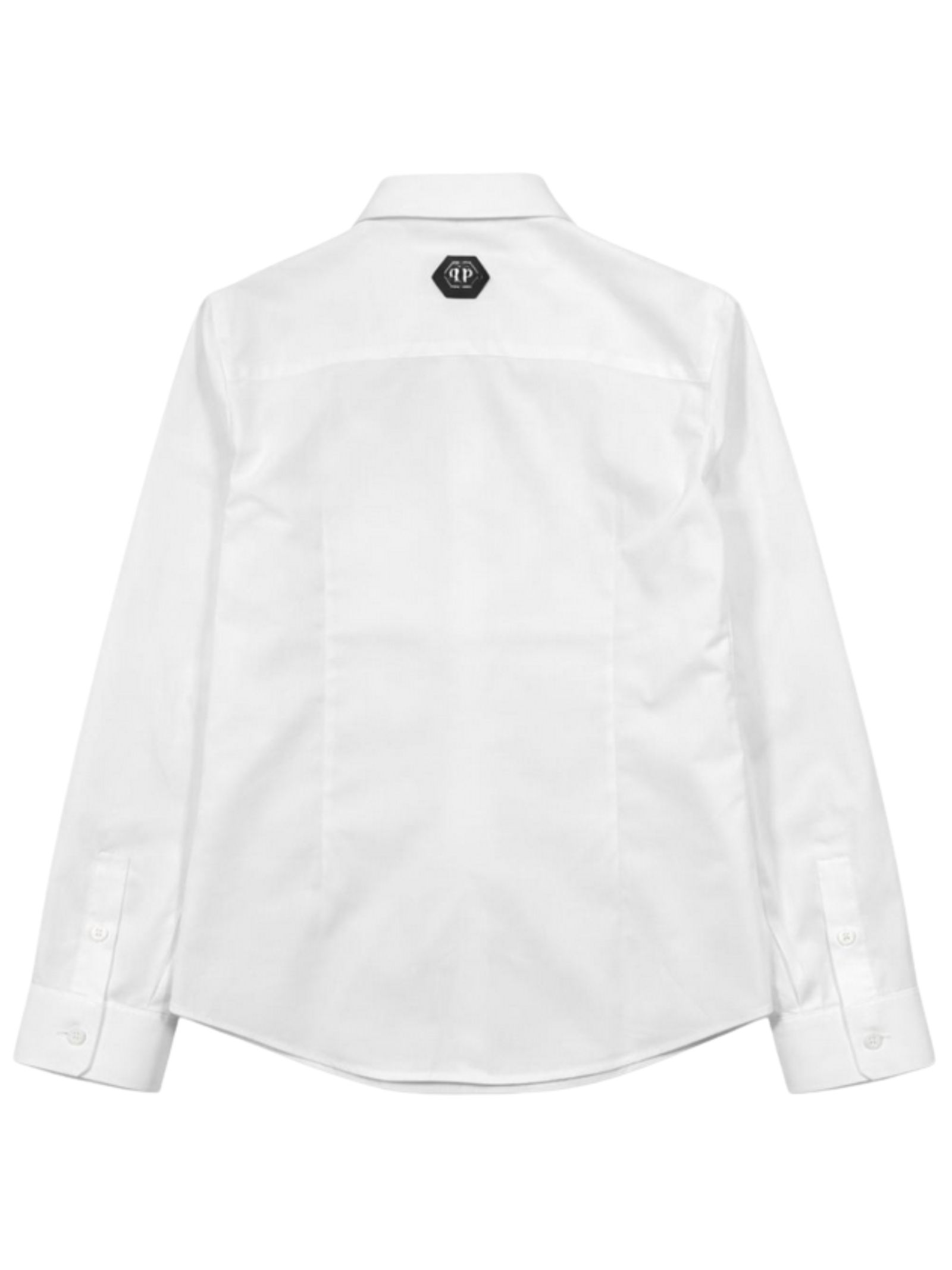 Philipp Plein Kids camicia di colore bianco, modello con colletto classico, manica lunga, ricamo logo a contrasto, orlo curvo, vestibilità regolare. Composizione: 97% cotone 3% elastan. Made in Italy