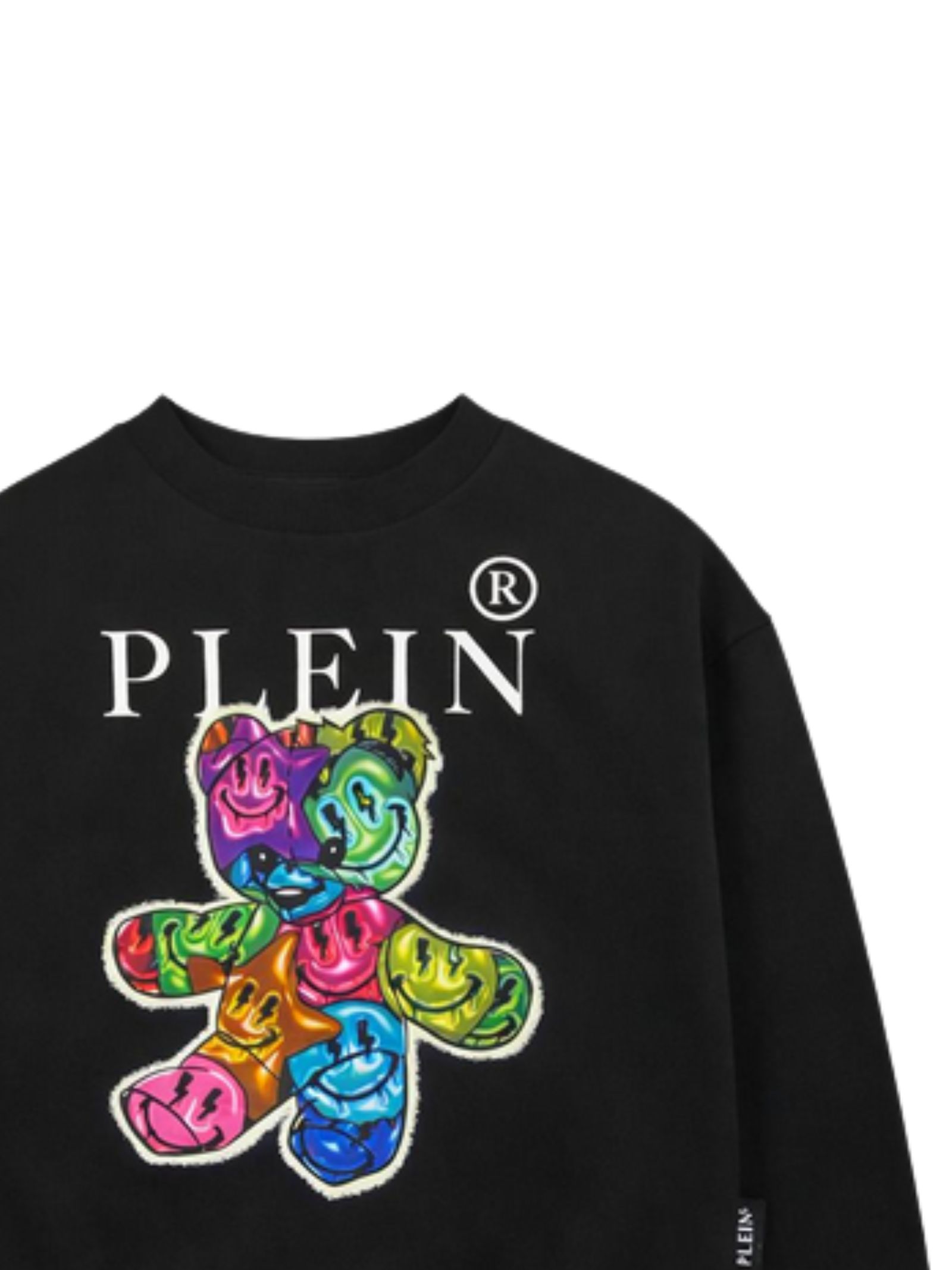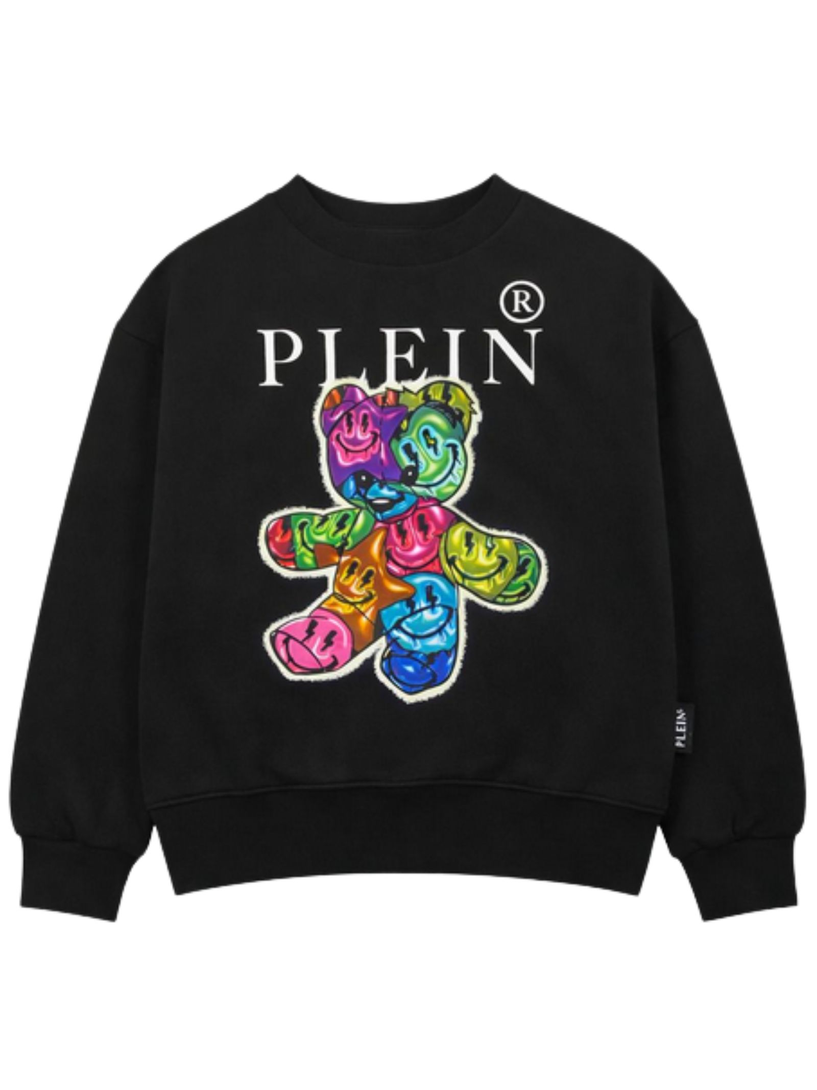 Philipp Plein Kids felpa di colore nero, modello girocollo, maniche lunghe, stampa a contrasto multicolor con logo, vestibilità regolare, orli a costine, fondo dritto. Composizione: 100% cotone. Made in Italy