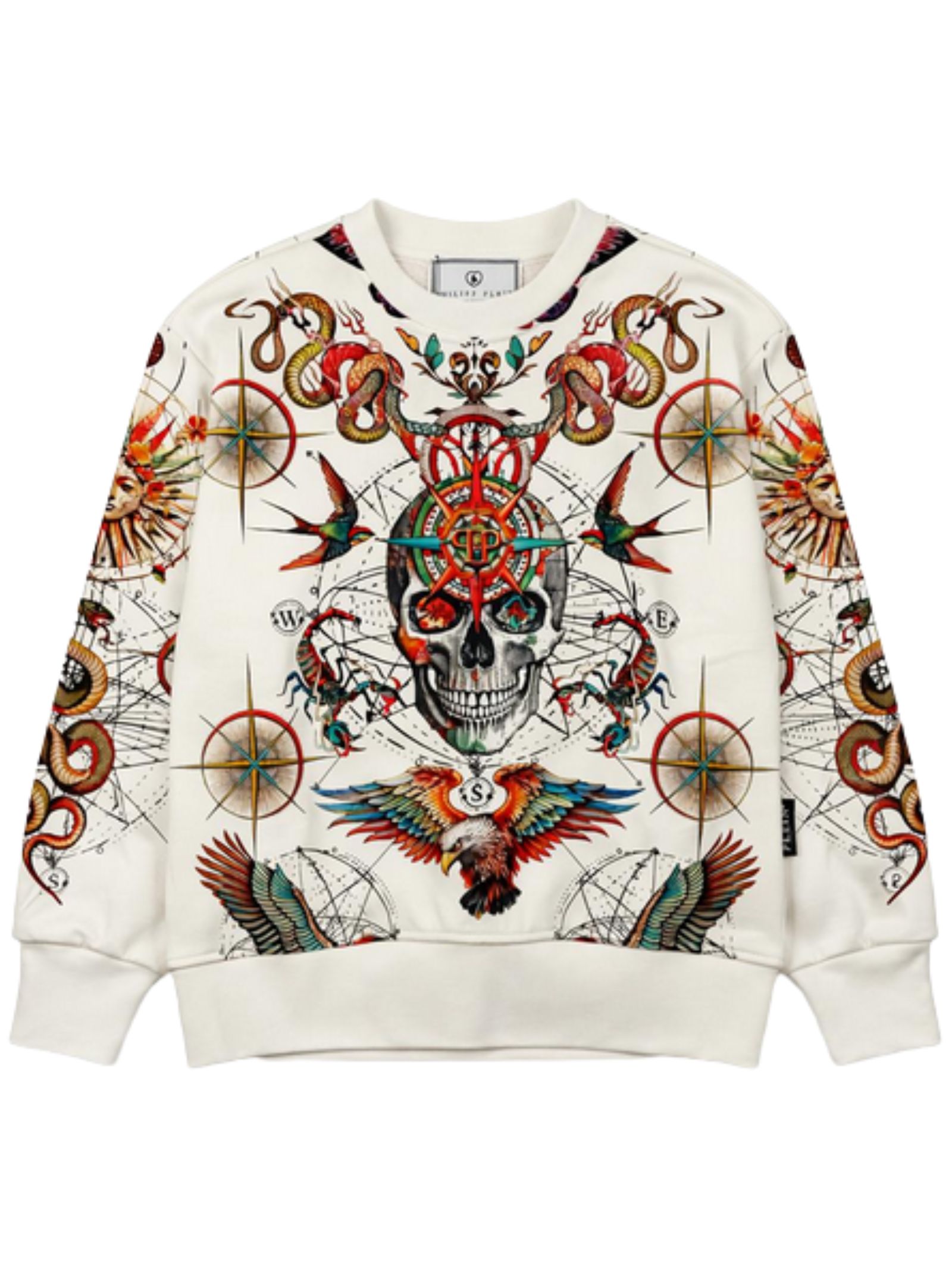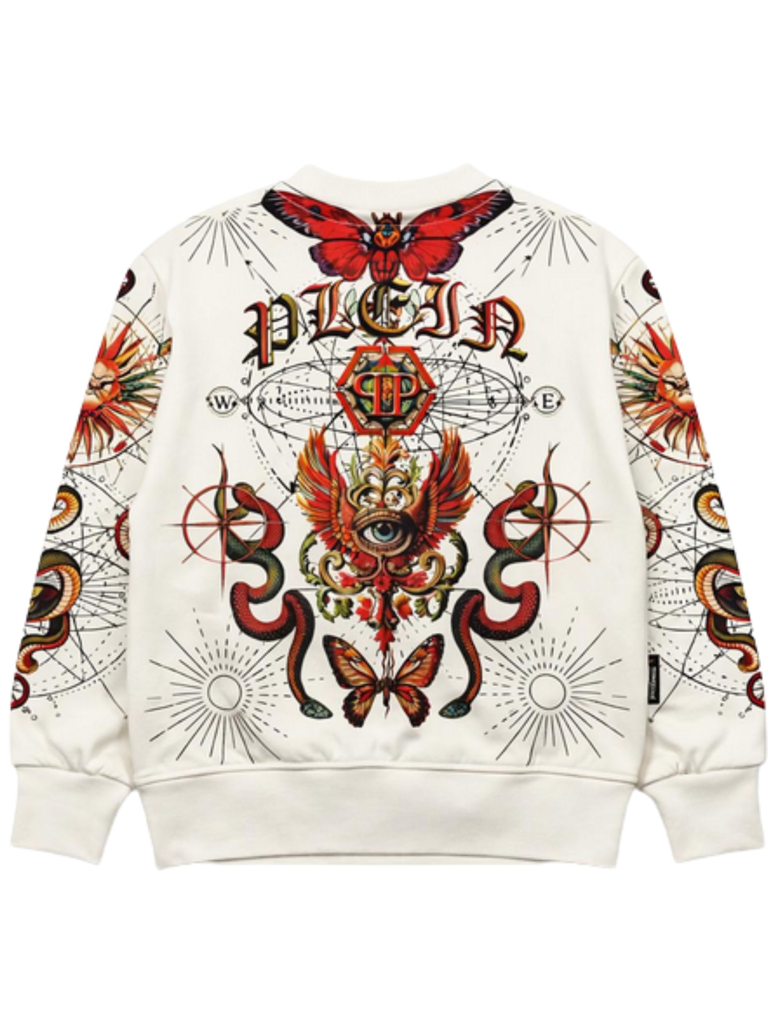 Philipp Plein Kids felpa di colore bianco, stampa a contrasto multicolor su tutta la superficie, modello girocollo, maniche lunghe, vestibilità regolare, orli a costine, fondo dritto. Composizione: 100% cotone. Made in Italy