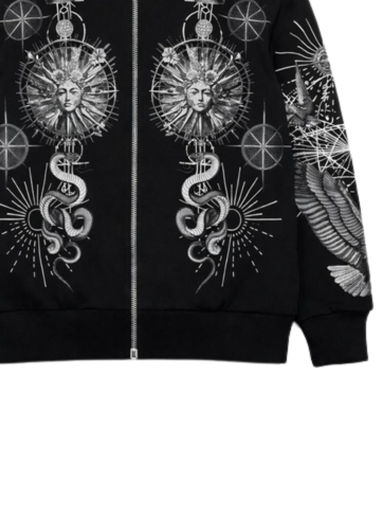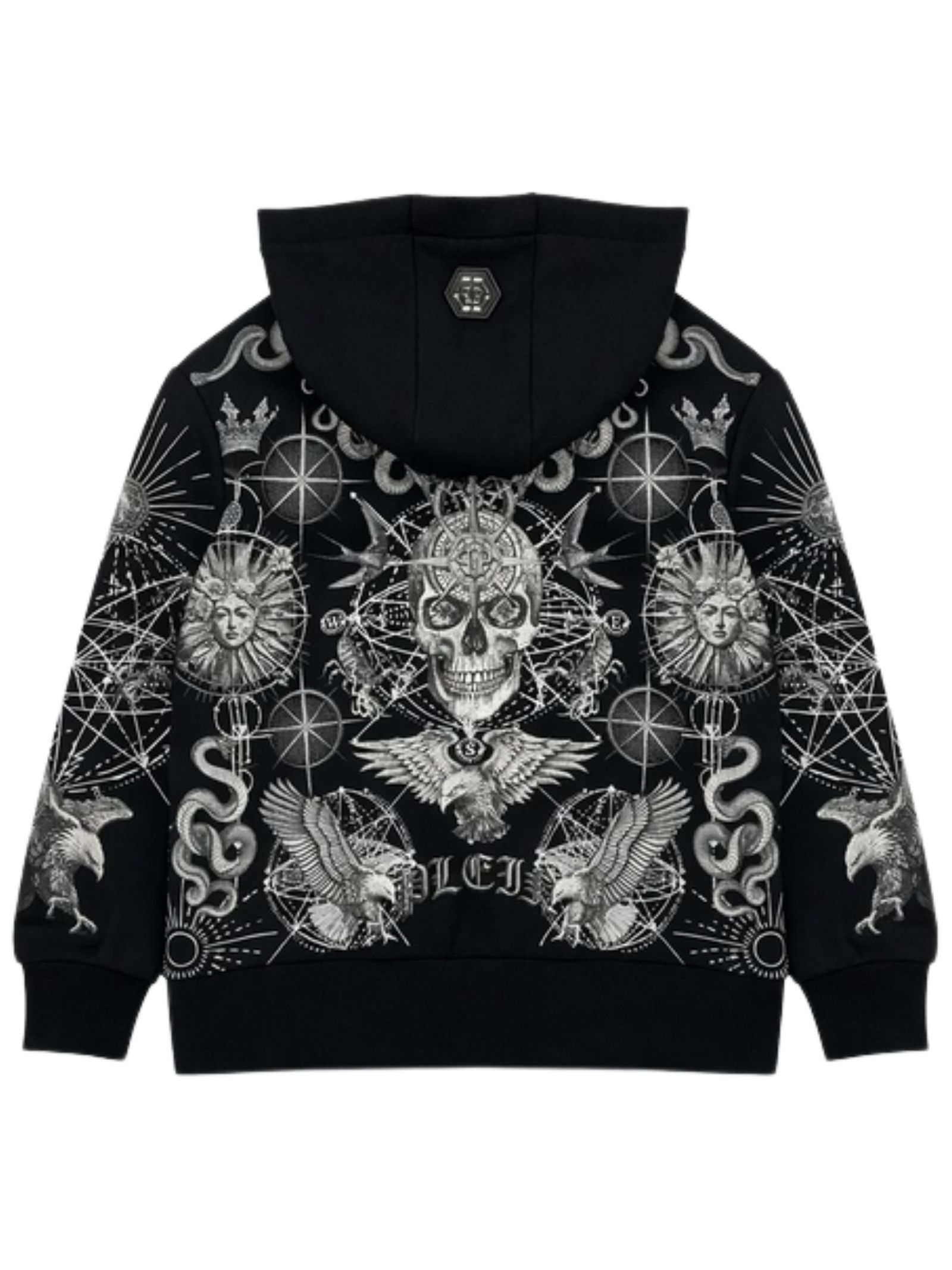 Philipp Plein Kids felpa di colore nero, stampa a contrasto su tutta la superficie, maniche lunghe, due tasche, dettaglio patch con logo sul cappuccio, vestibilità regolare, orli a costine, fondo dritto. Composizione: 100% cotone. Made in Italy