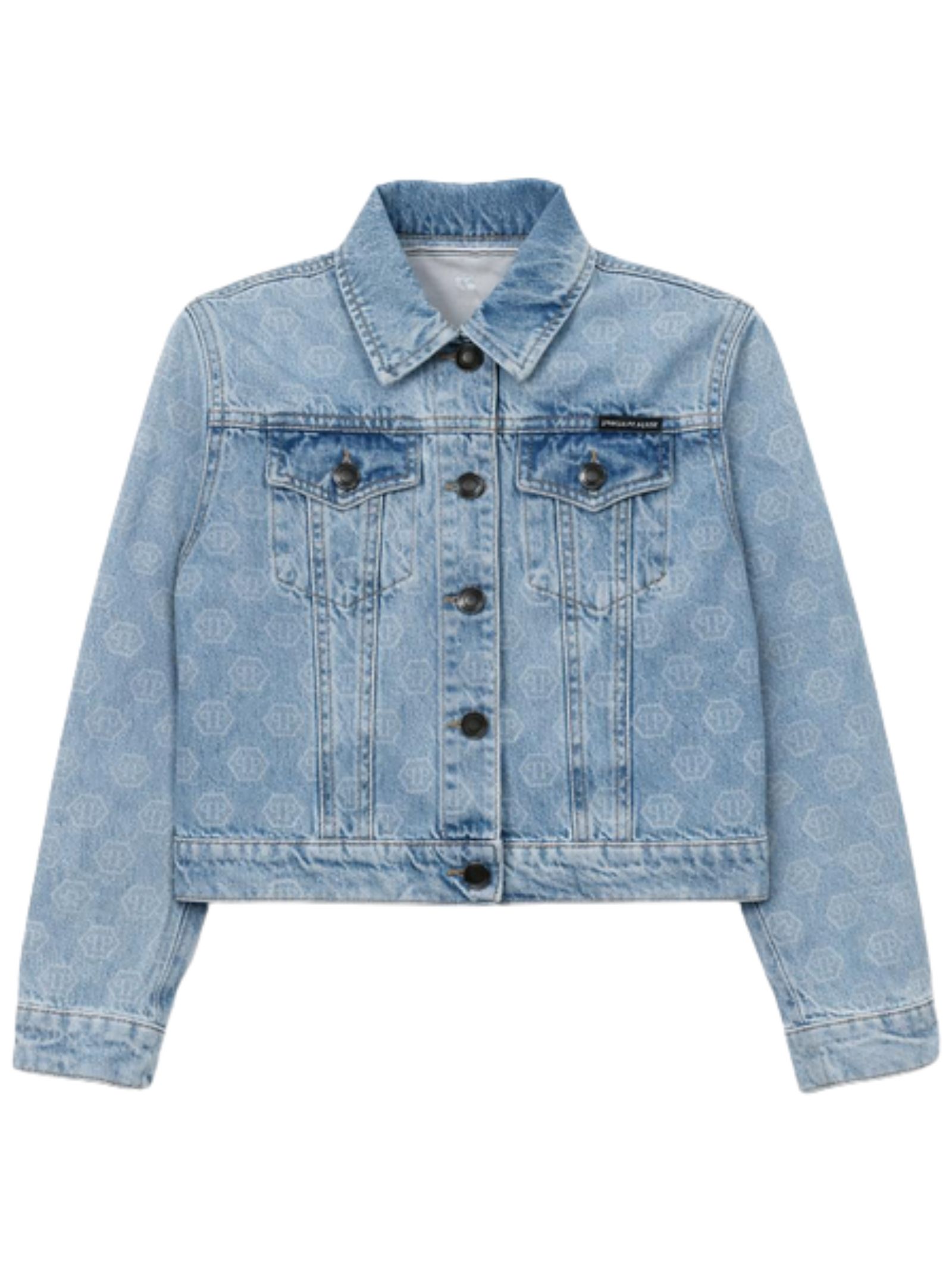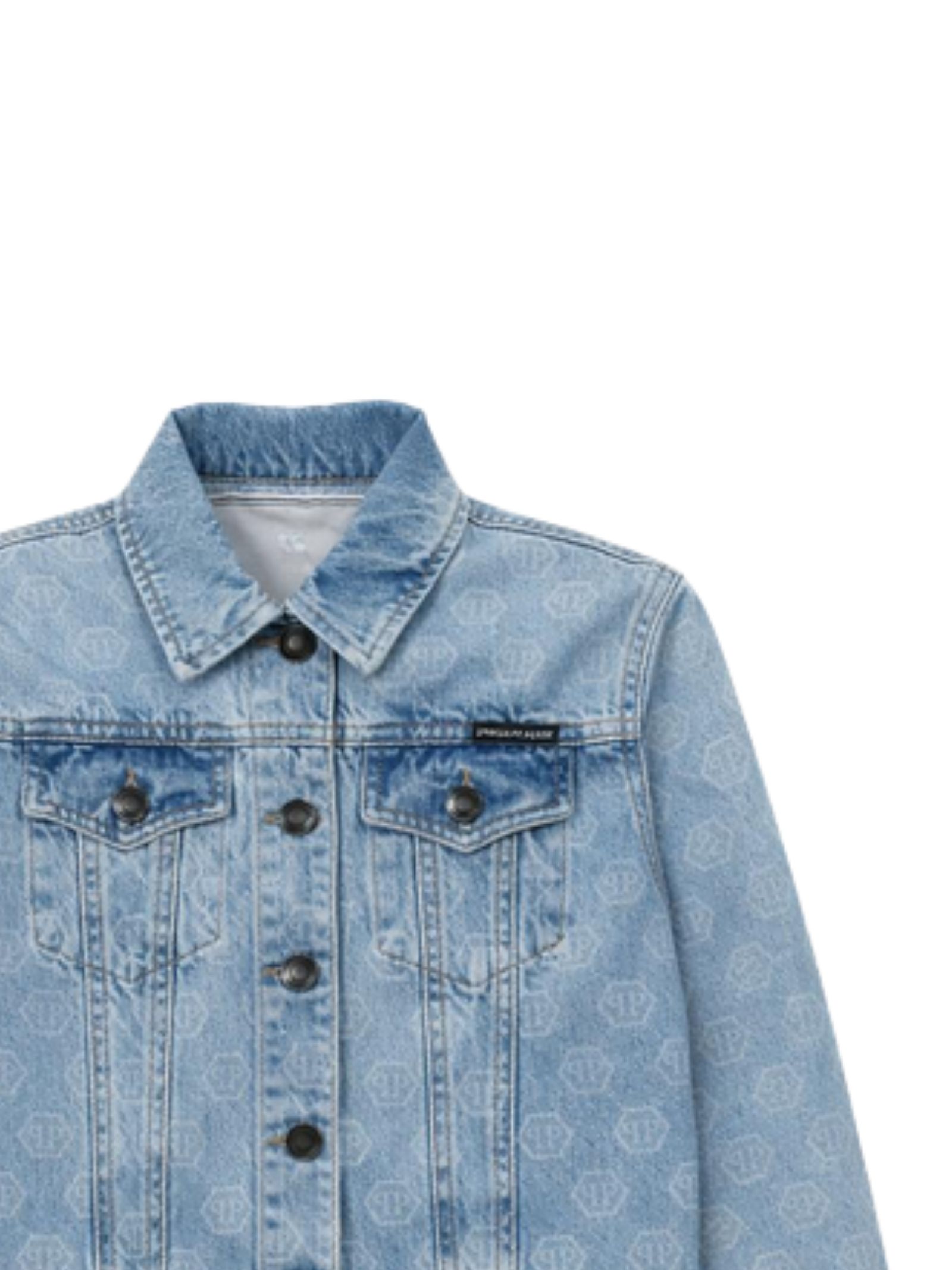 Philipp Plein Kids giubbino in cotone denim dal lavaggio blu chiaro, logo a contrasto bianco su tutta la superficie, modello cropped, due taschini sul petto, patch con logo, vestibilità regolare. Composizione: 100% cotone. Made in Italy
