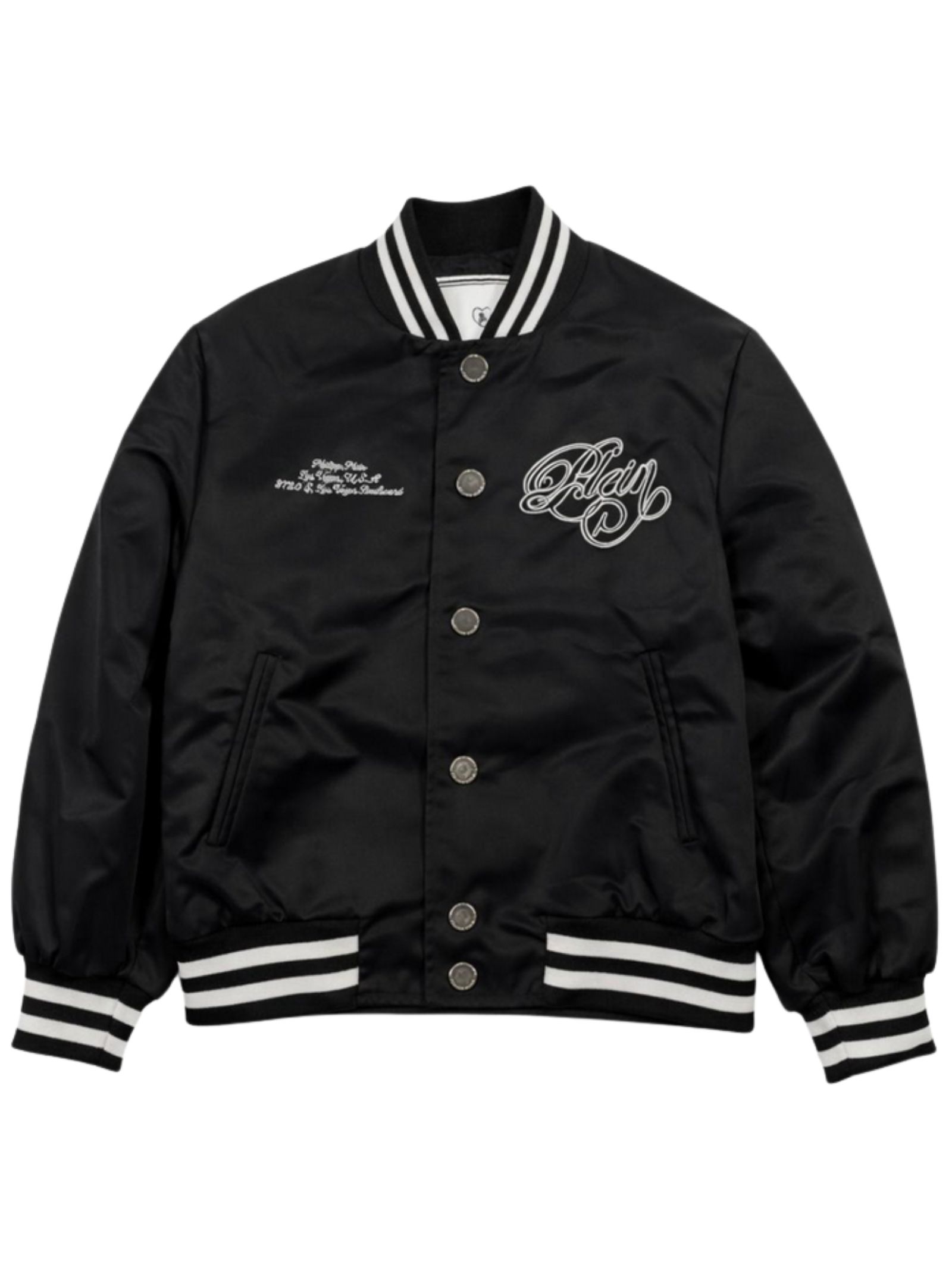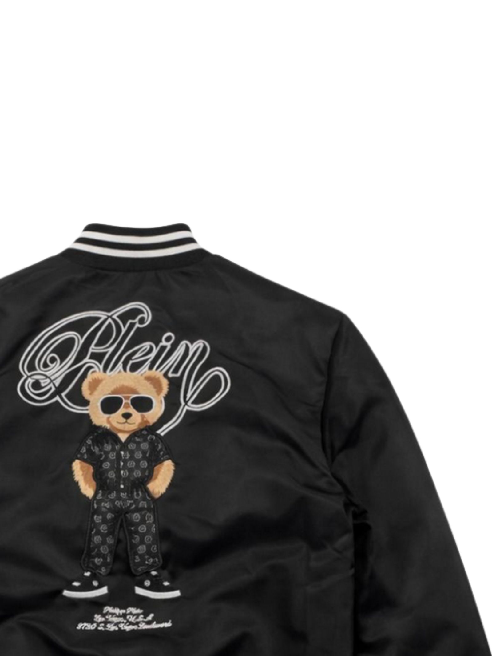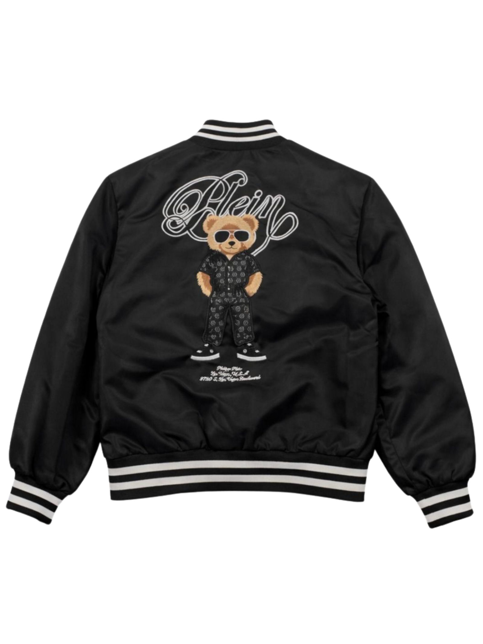 Philipp Plein Kids giubbino di colore nero, orli a costine a contrasto bianco, modello bomber, dettagli in rilievo, Teddy ricamato sul retro, vestibilità regolare. Composizione: 100% poliammide. Fodera: 100% poliestere. Made in Italy