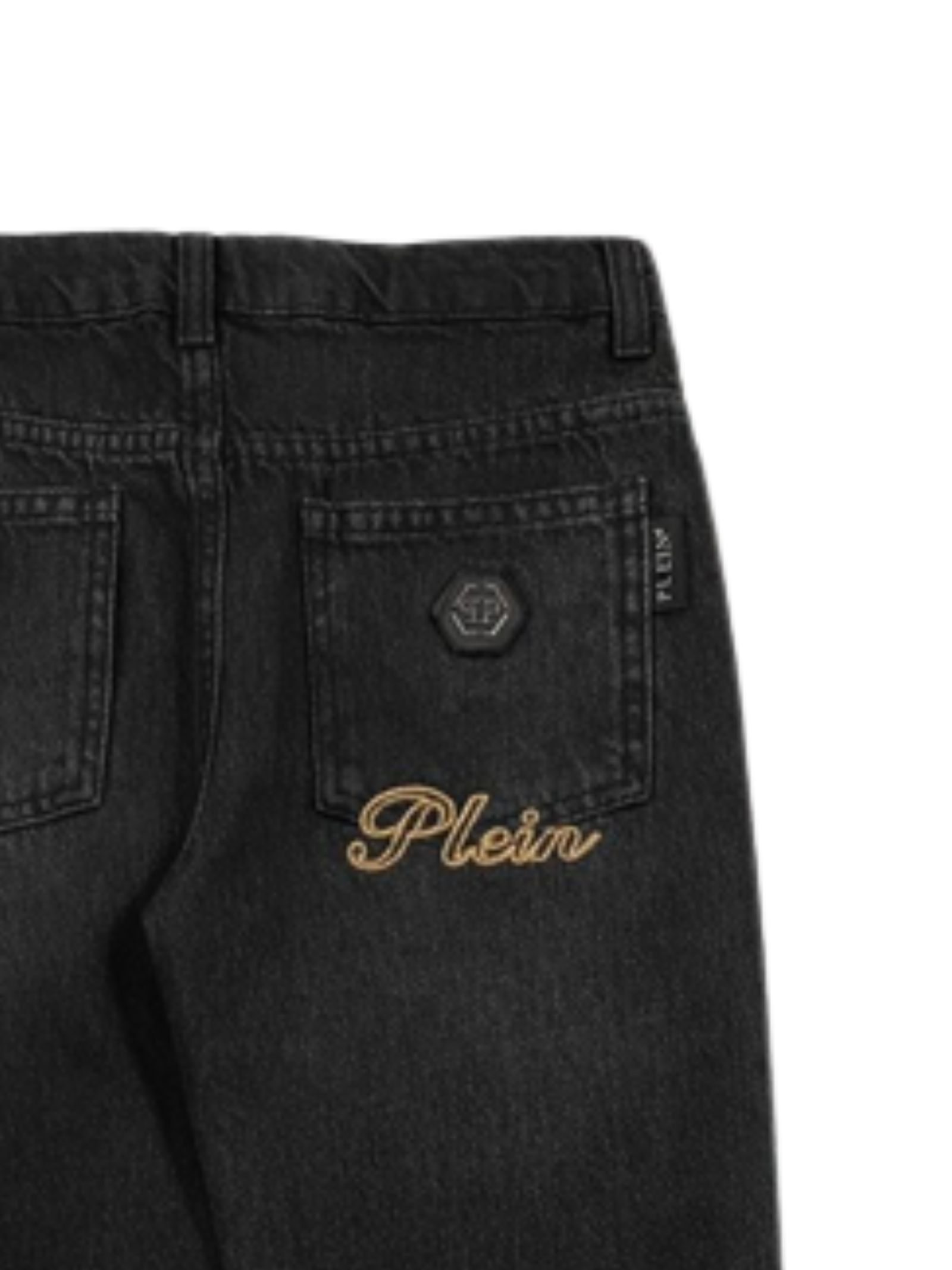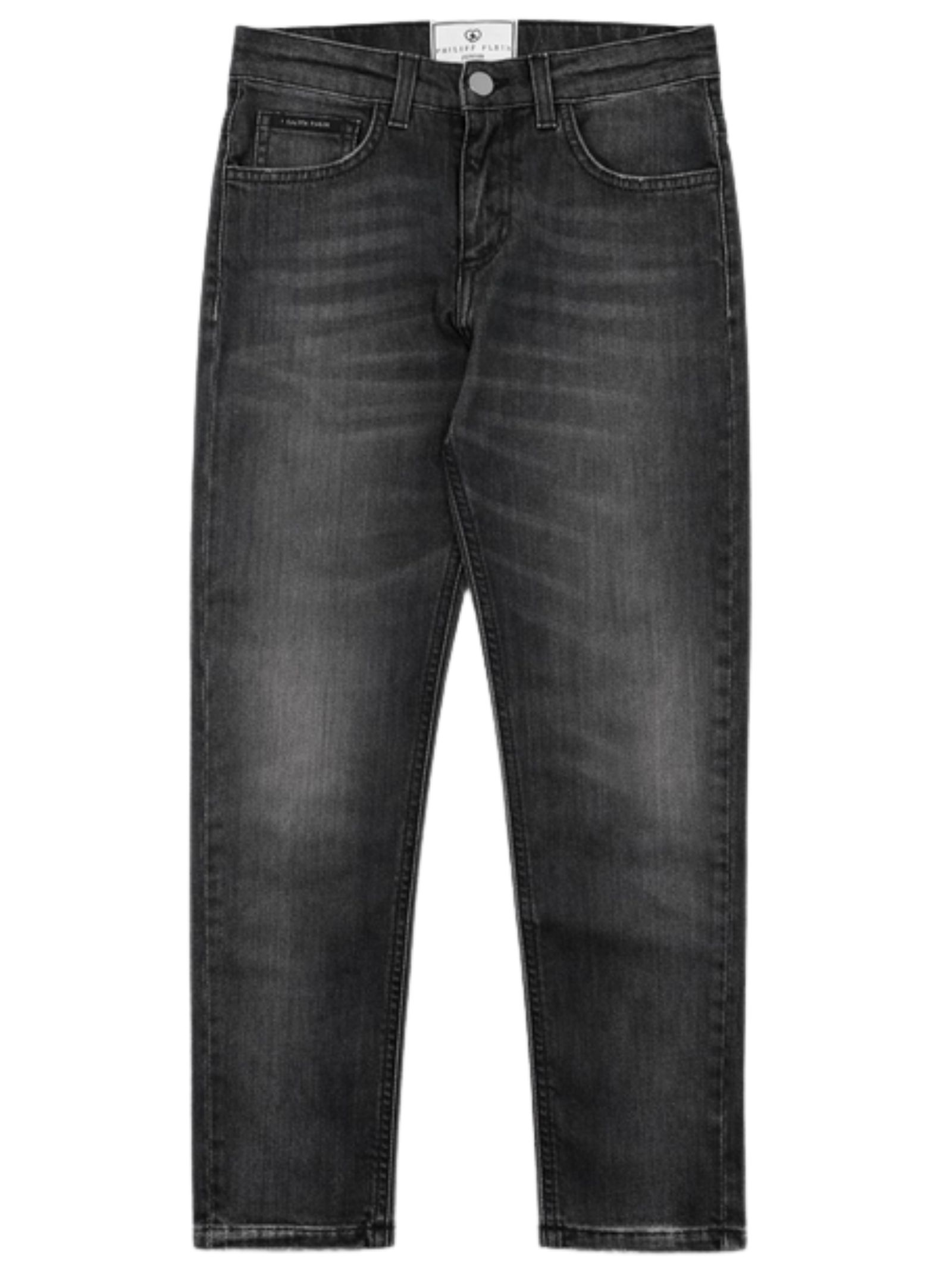 Philipp Plein Kids jeans di colore nero, lavaggio con sbiaditure, logo ricamato sul retro, modello 5 tasche, passanti, patch con logo, gamba dritta, vestibilità regolare. Composizione: 98% Cotone 2% Elastan. Made in Italy
