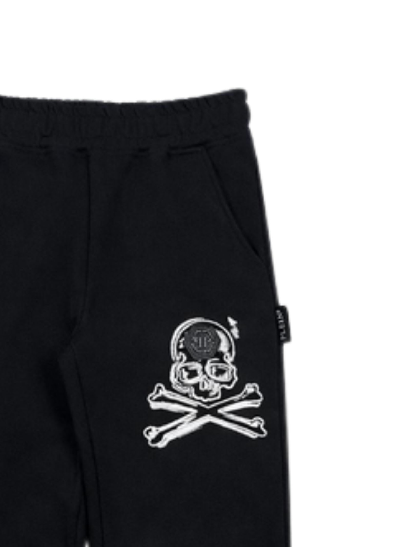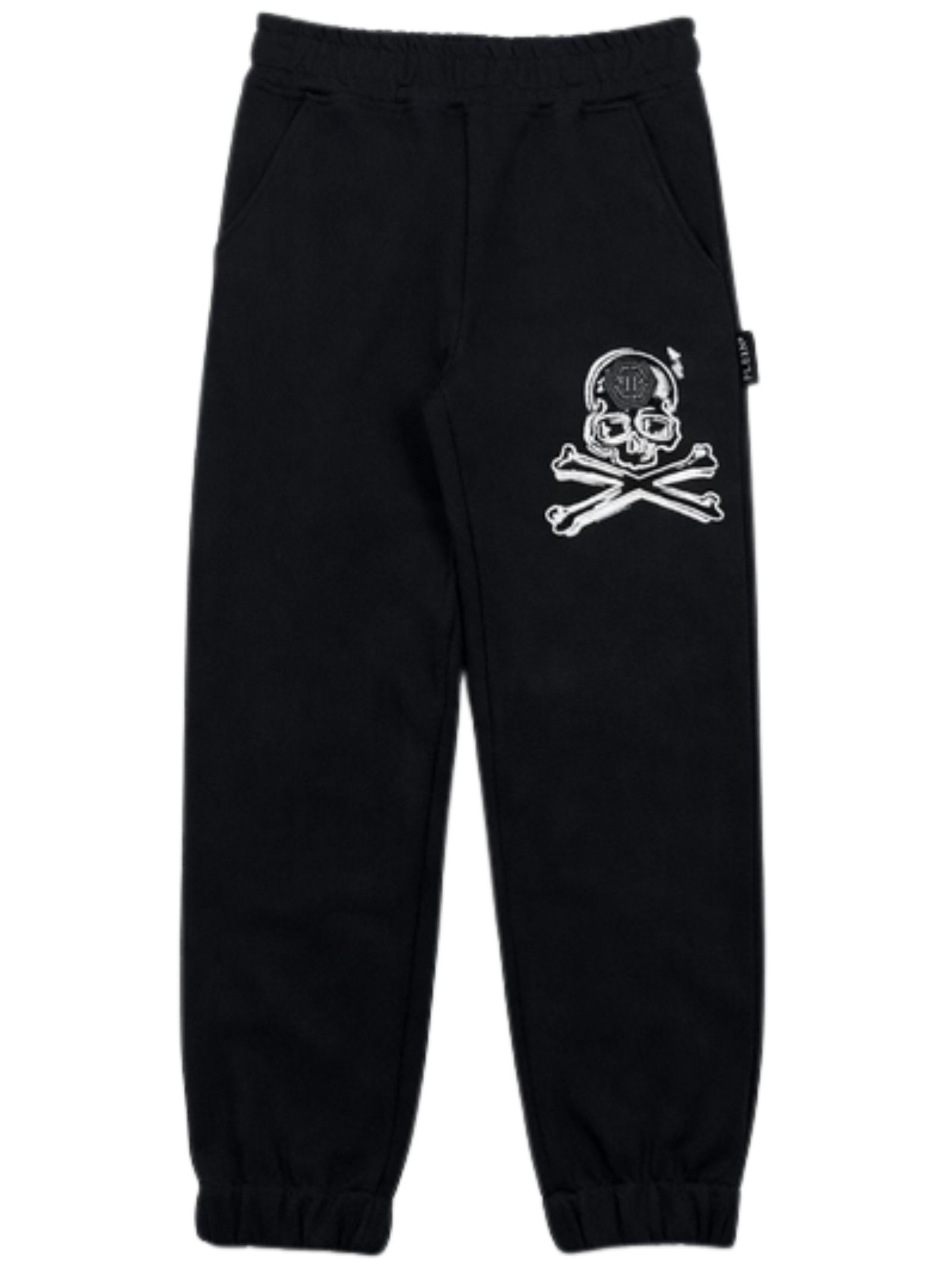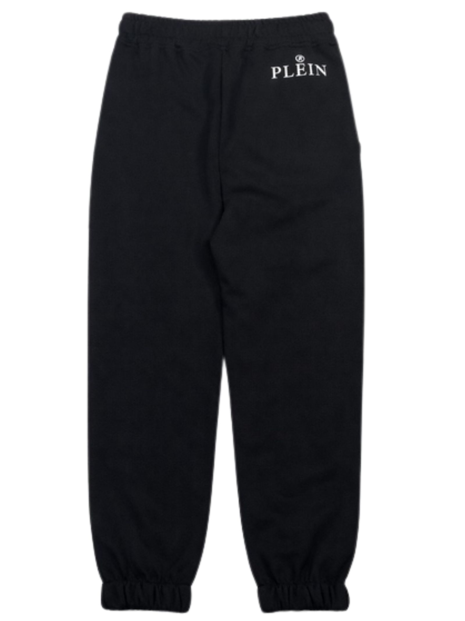 Philipp Plein Kids pantalone di colore nero, dettagli a contrasto bianco, modello con elastico in vita, due tasche laterali, patch con logo applicato, caviglie elastiche, vestibilità regolare. Composizione: 100% cotone. Made in Italy