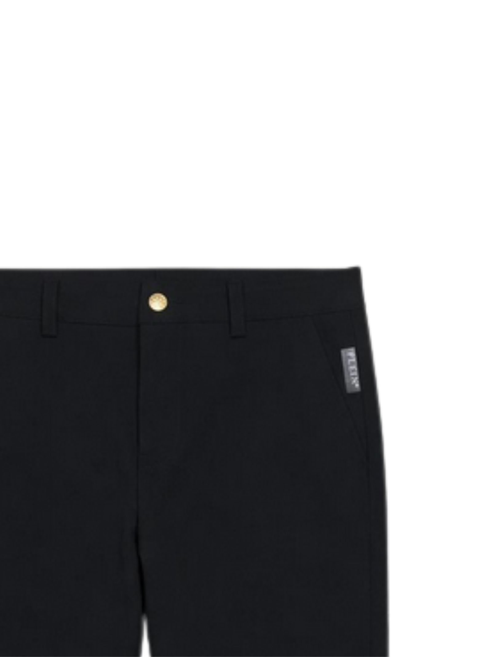 Philipp Plein Kids pantalone di colore nero, modello classico, vita regolare, bottone oro, ricamo logo, tglio dritto, vestibilità regolare. Composizione: 76% poliestere 21% viscosa 3% elastan. Made in Italy
