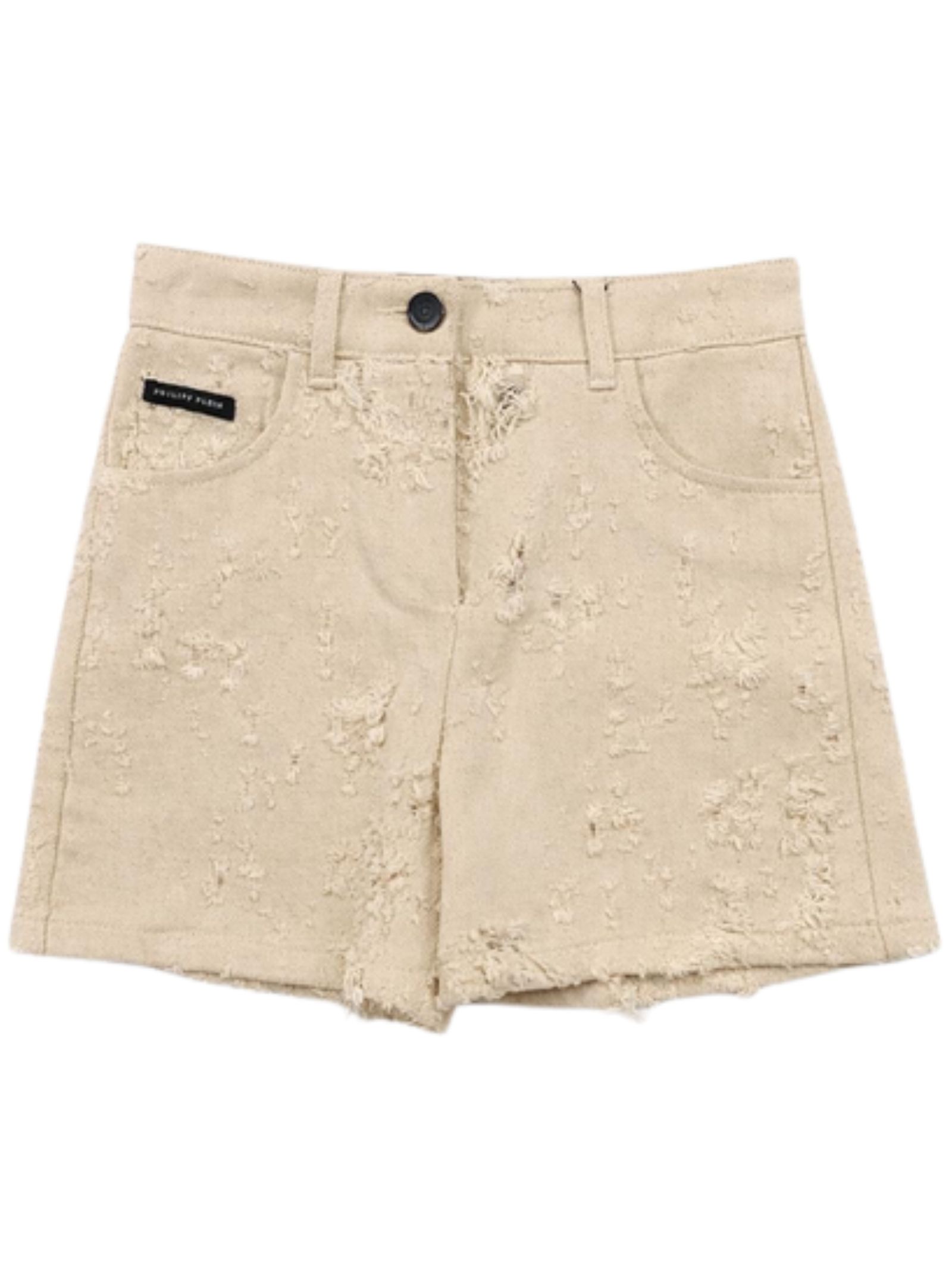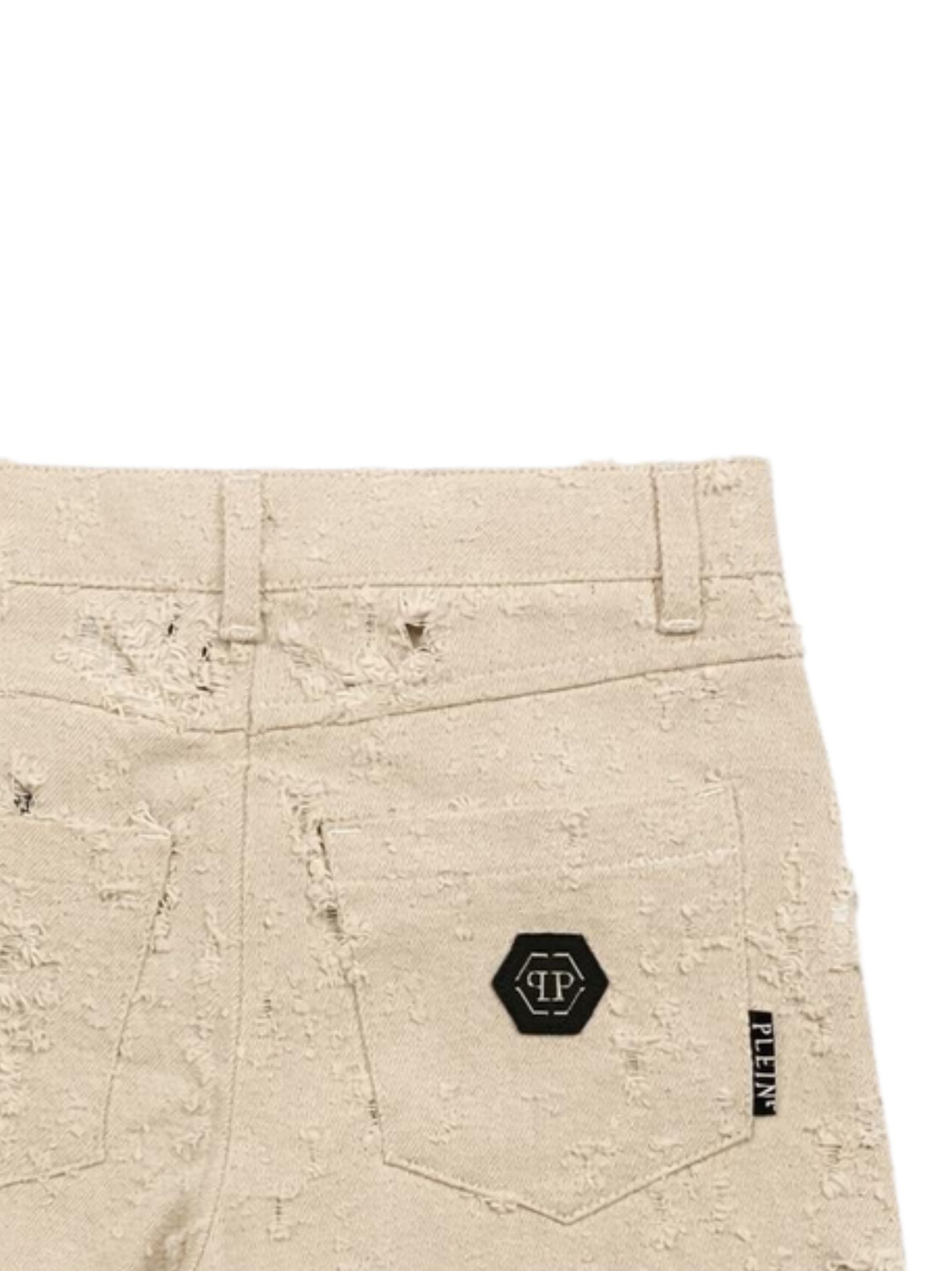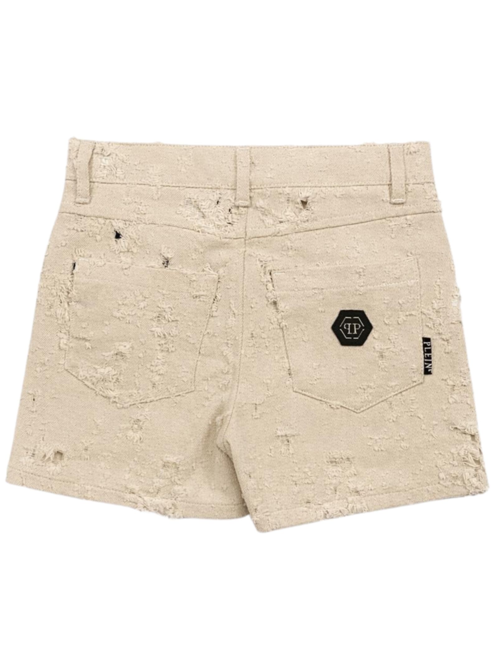 Philipp Plein Kids shorts in jeans di colore sabbia, morbido tessuto effetto sfranato su tutta la superficie, modello 5 tasche, vita regolare, passanti, patch con logo applicato, vestibilità regolare. Composizione: 100% cotone. Made in Italy