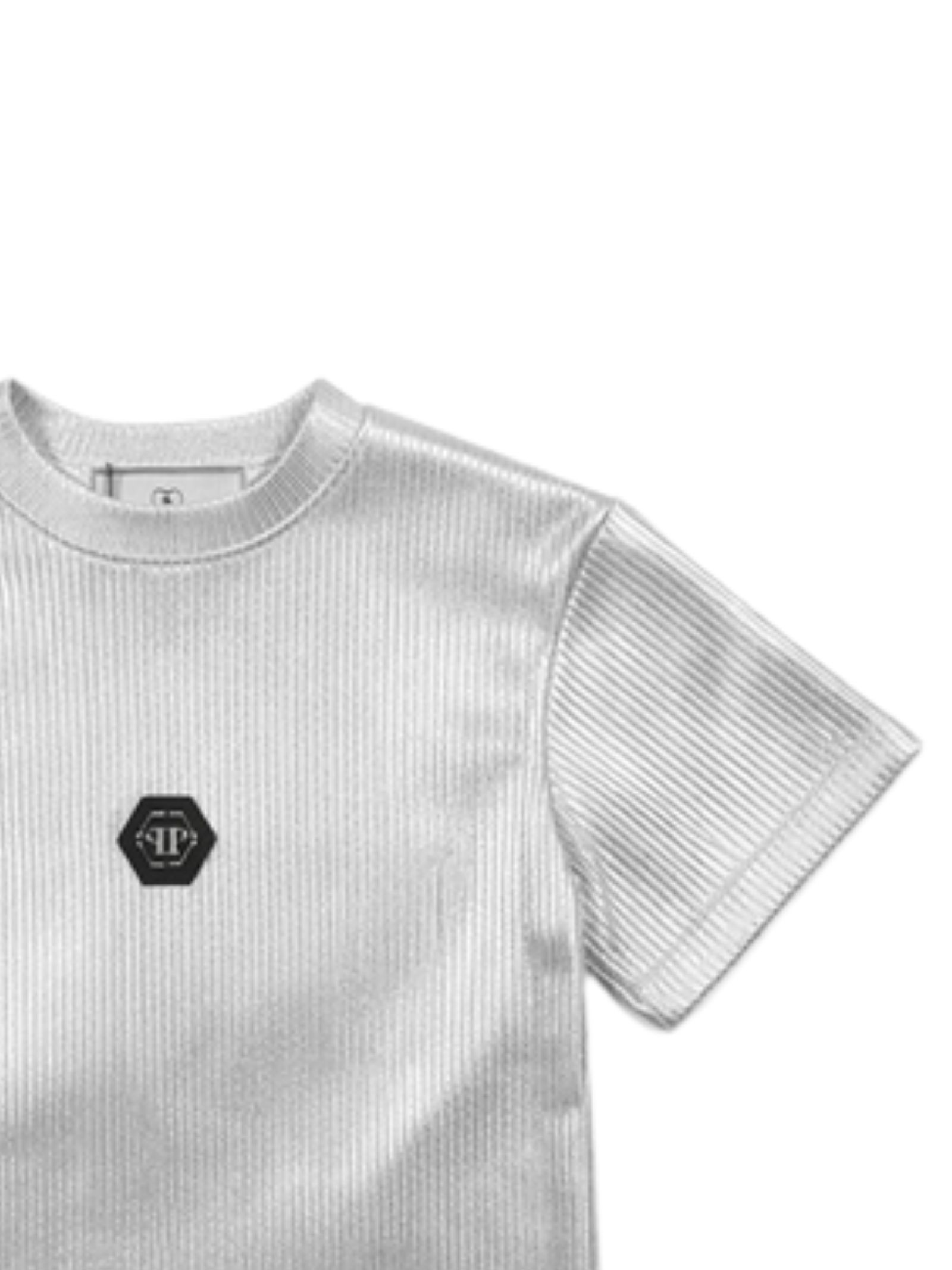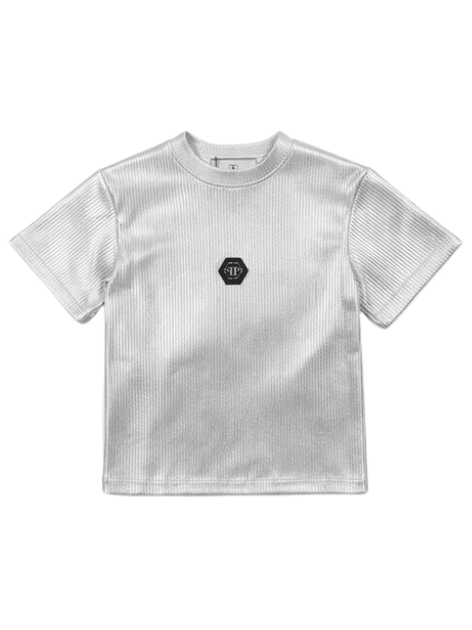 Philipp Plein Kids t-shirt di colore argento, tessuto a costine, modello cropped, girocollo, mezza manica, patch con logo applicato, vestibilità aderente. Composizione: 100% cotone