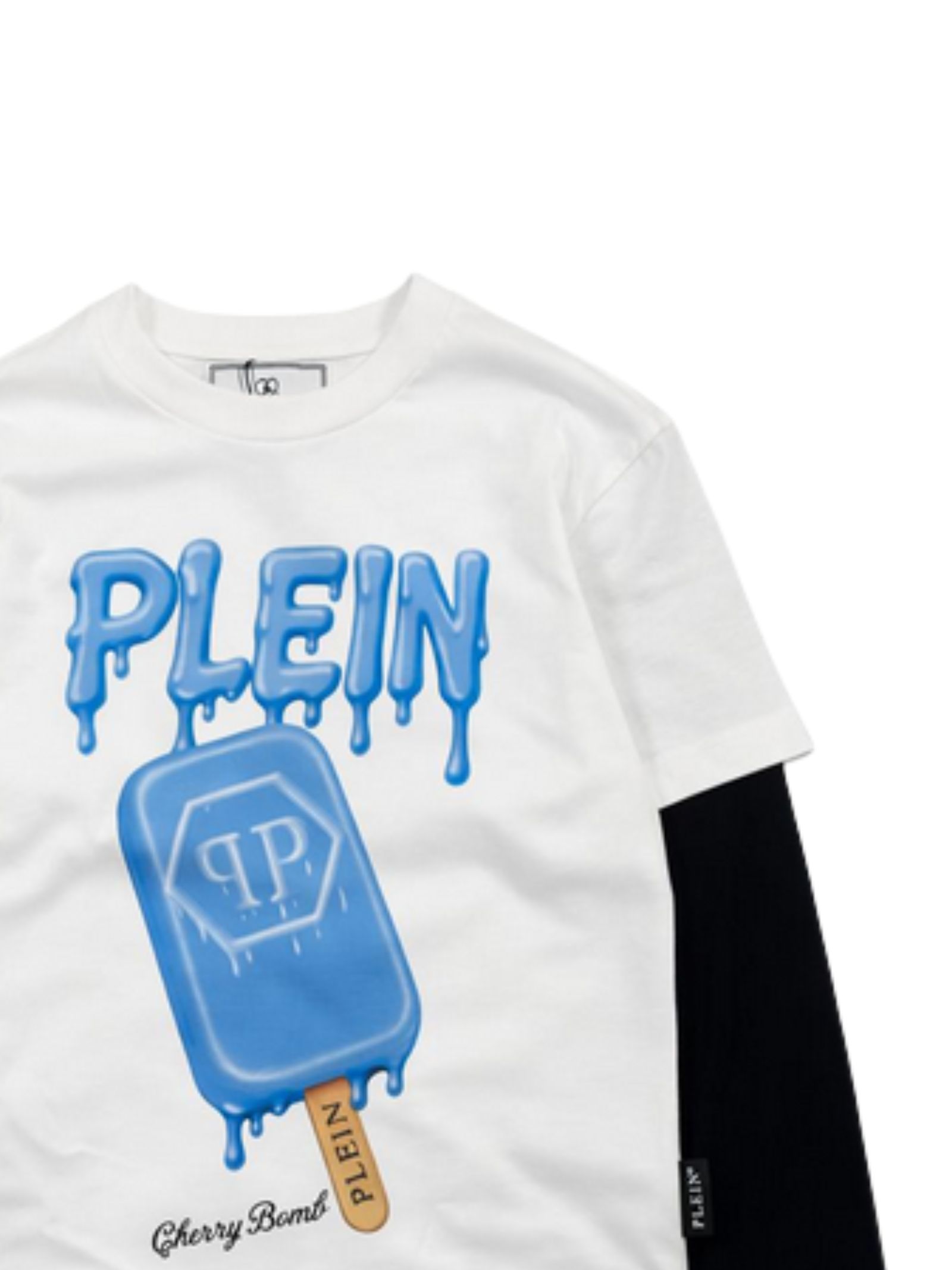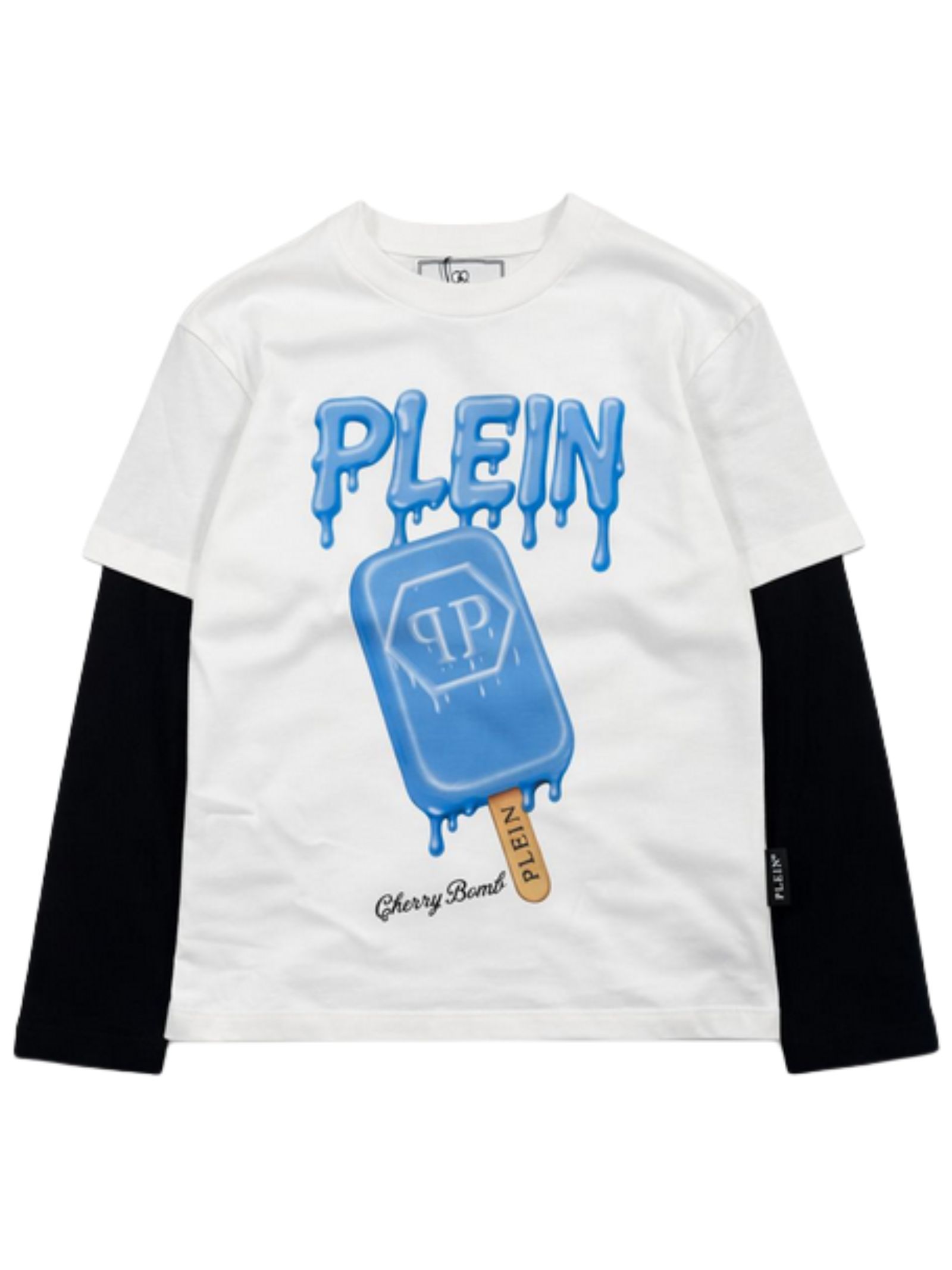 Philipp Plein Kids t-shirt di colore bianco, modello girocollo, manica lunga a contrasto nero, stampa a contrasto azzurro con logo, orlo dritto, vestibilità regolare. Composizione: 100% cotone. Made in Italy