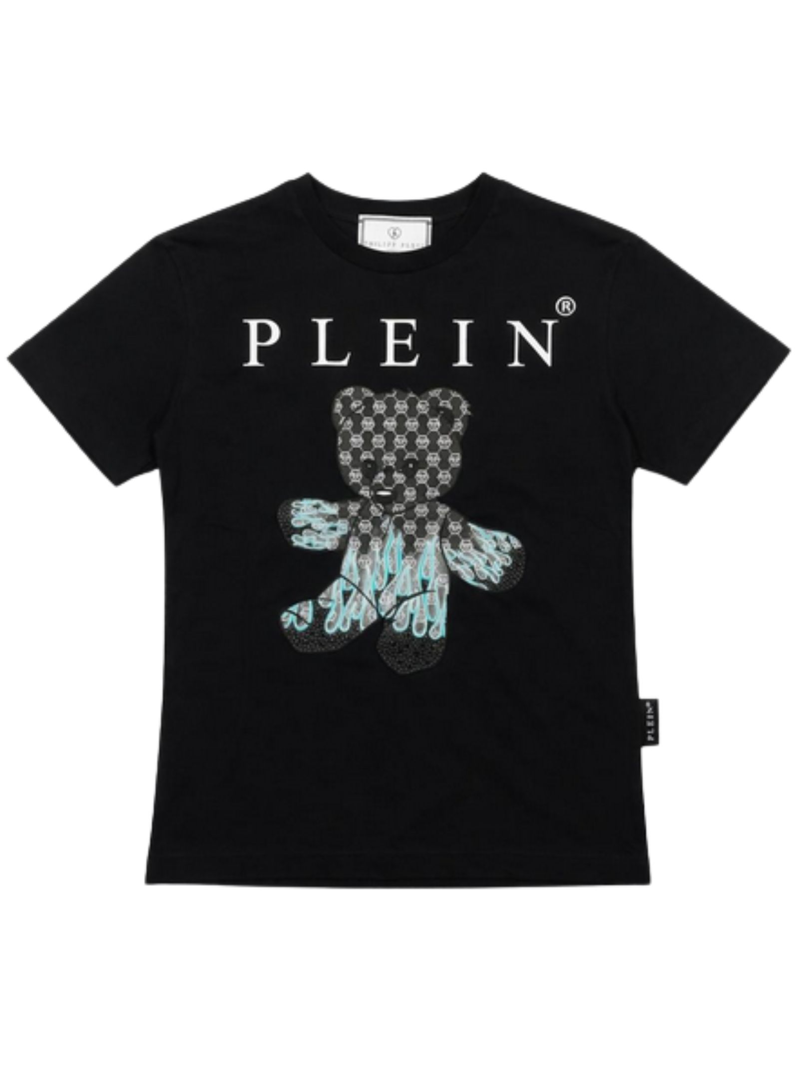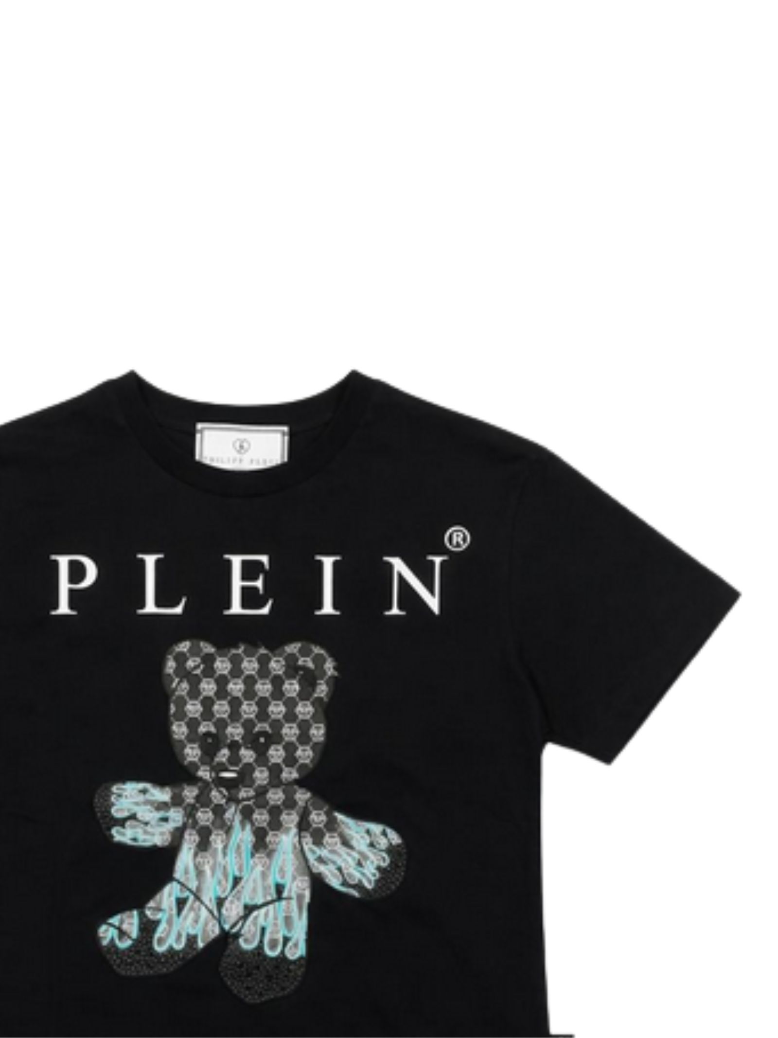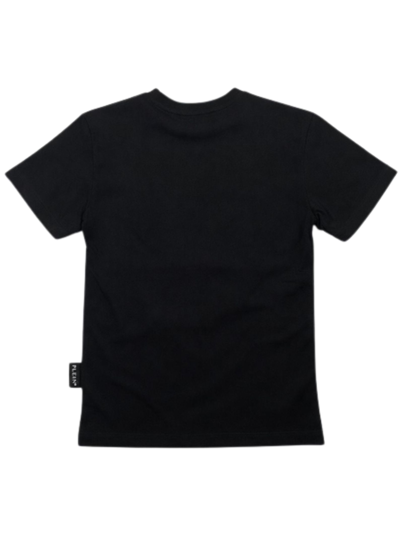 Philipp Plein Kids t-shirt di colore nero, modello girocollo, mezza manica, stampa a contrasto con logo, orlo dritto, vestibilità regolare. Composizione: 100% cotone. Made in Italy