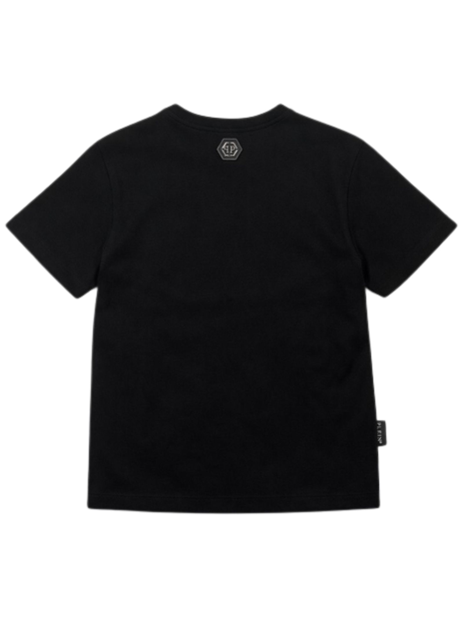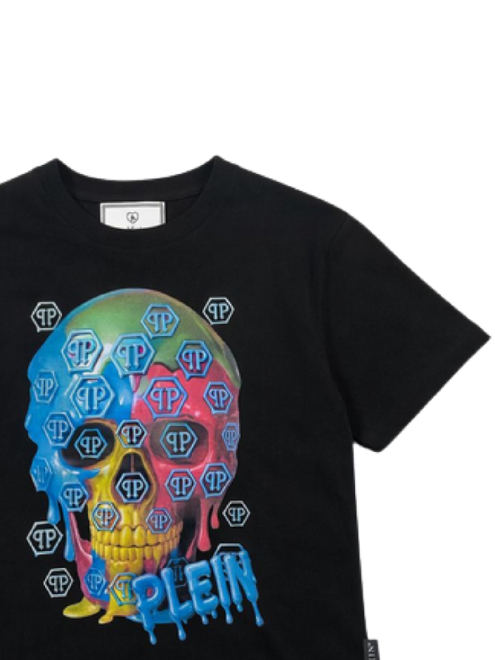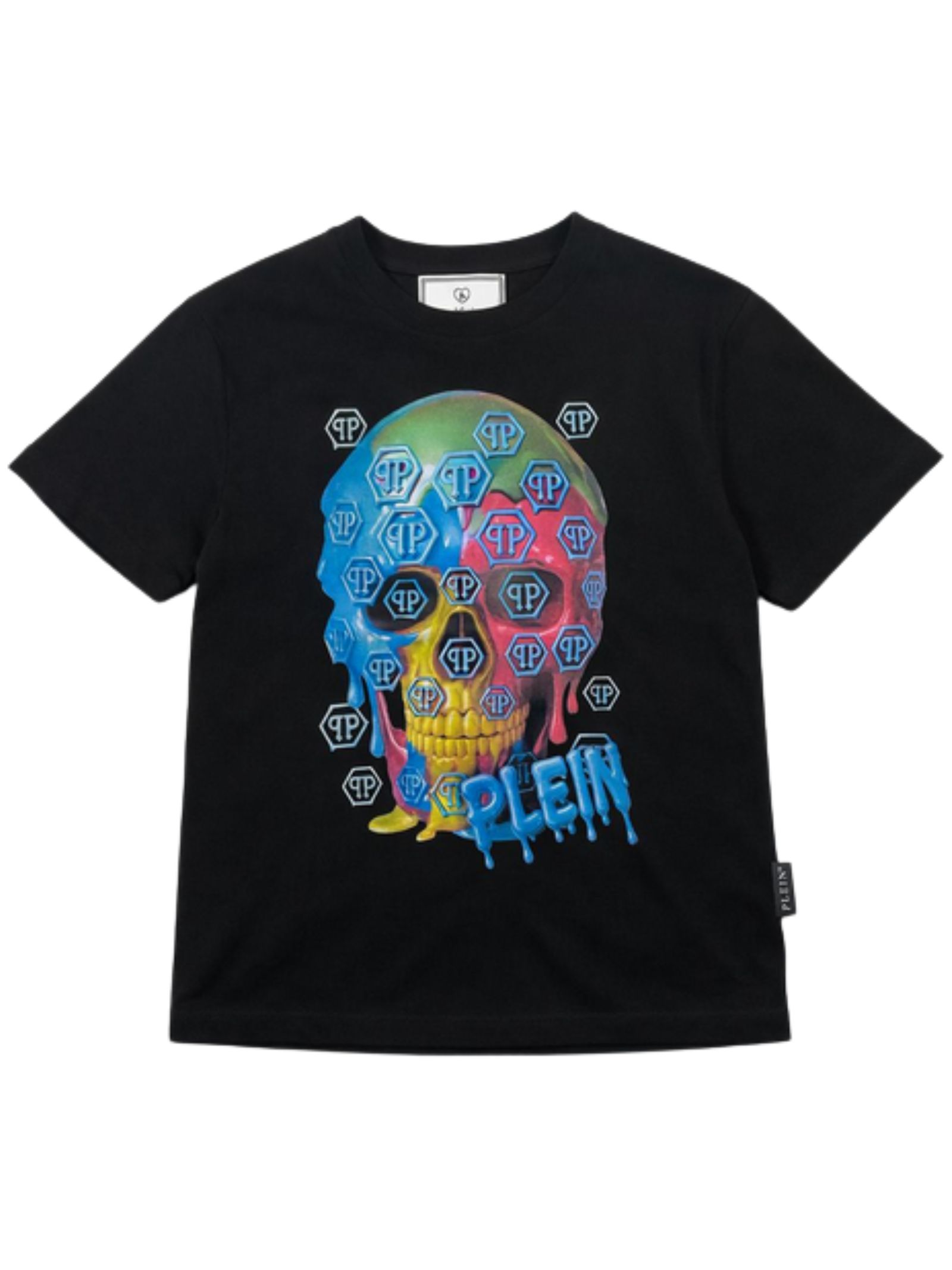 Philipp Plein Kids t-shirt di colore nero, modello girocollo, mezza manica, stampa a contrasto multicolor con logo, orlo dritto, vestibilità regolare. Composizione: 100% cotone. Made in Italy
