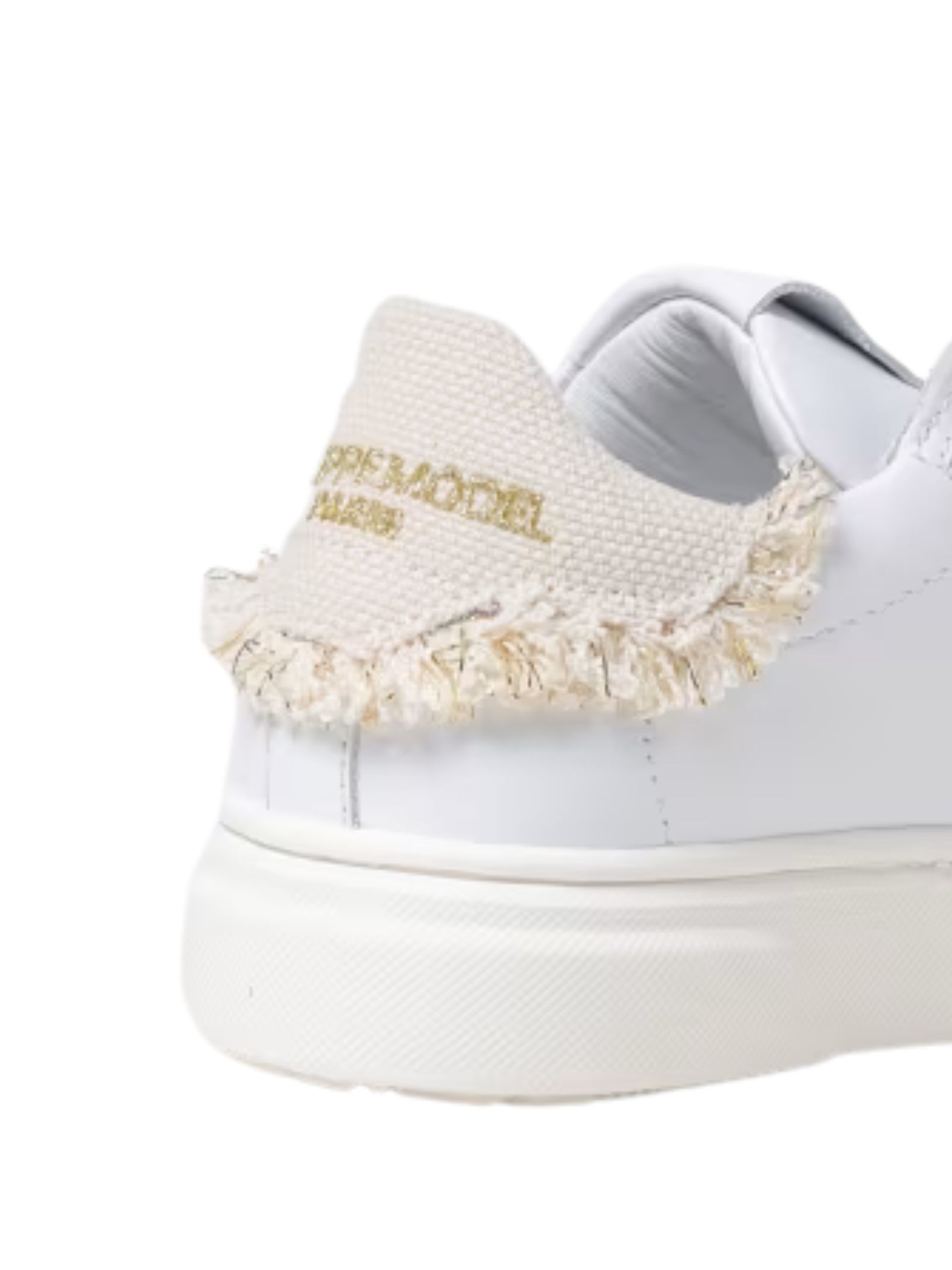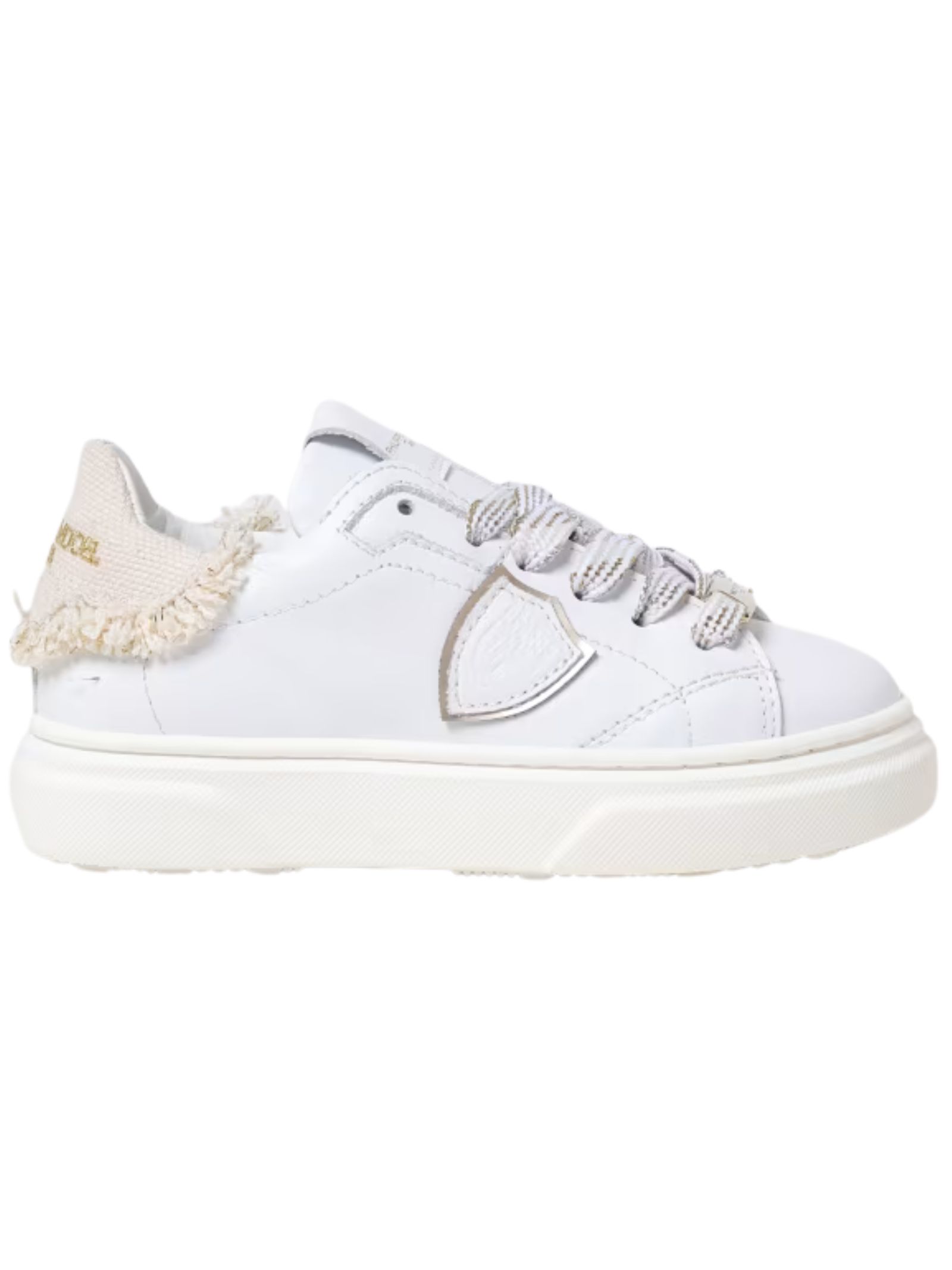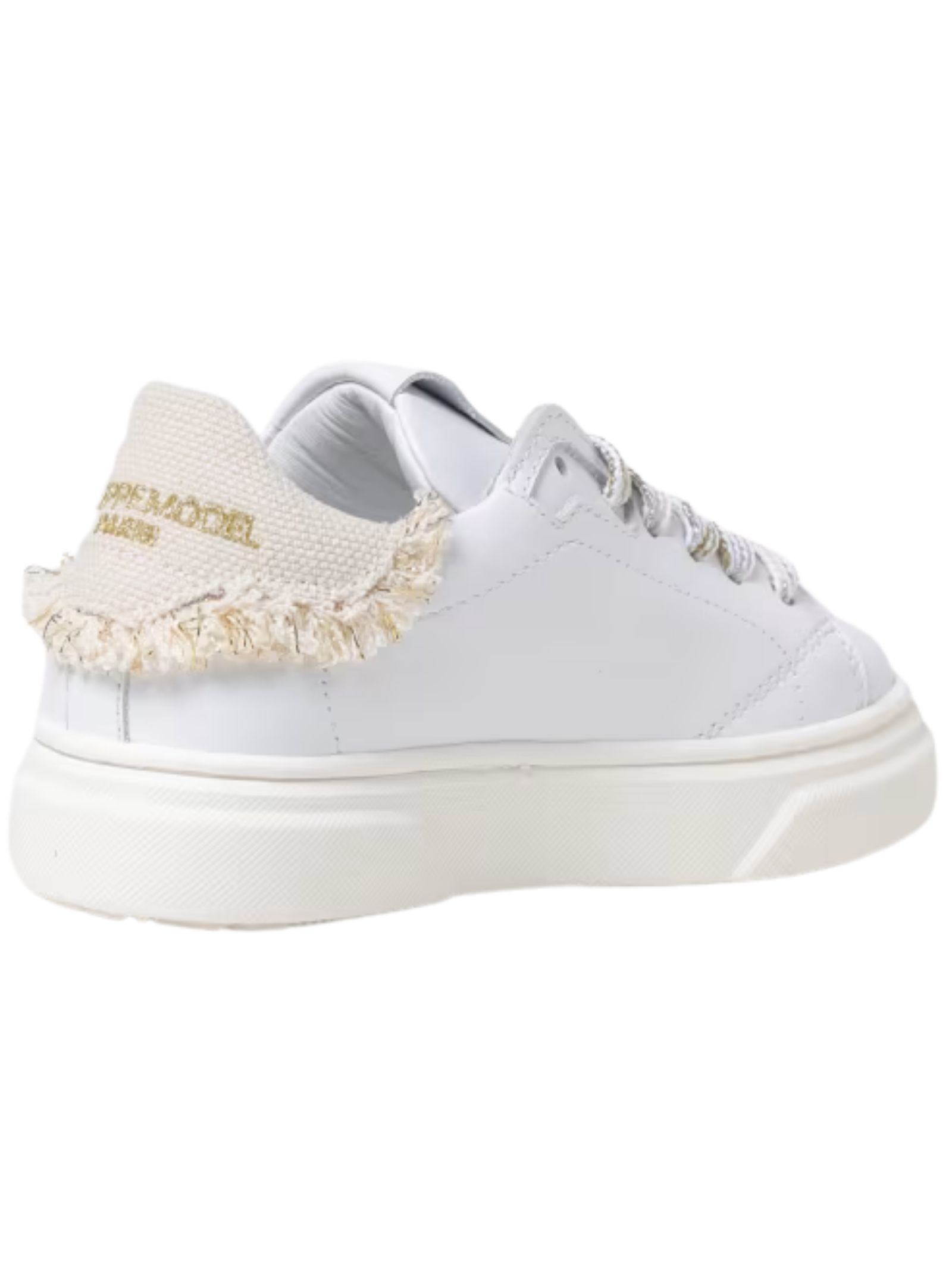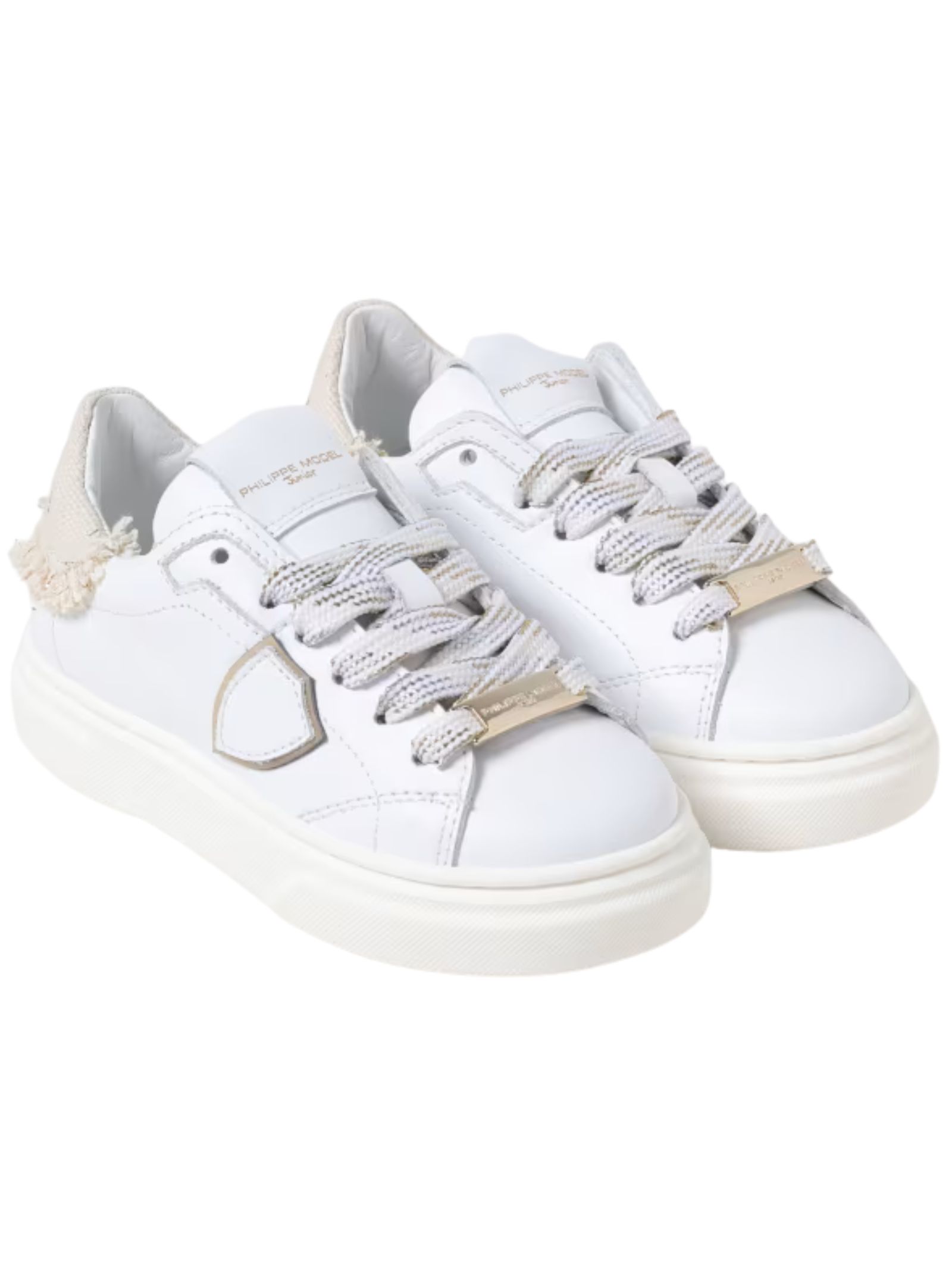 Philippe Model Kids sneakers di colore bianco/oro, realizzate in pelle liscia con inserto a contrasto sfrangiato sul retro, modello low-top caratterizzato da una suola platform in gomma, chiusura frontale con lacci con dettaglio laminato oro/argento, applicazione laterale scudetto caratteristico del marchio. Made in Italy