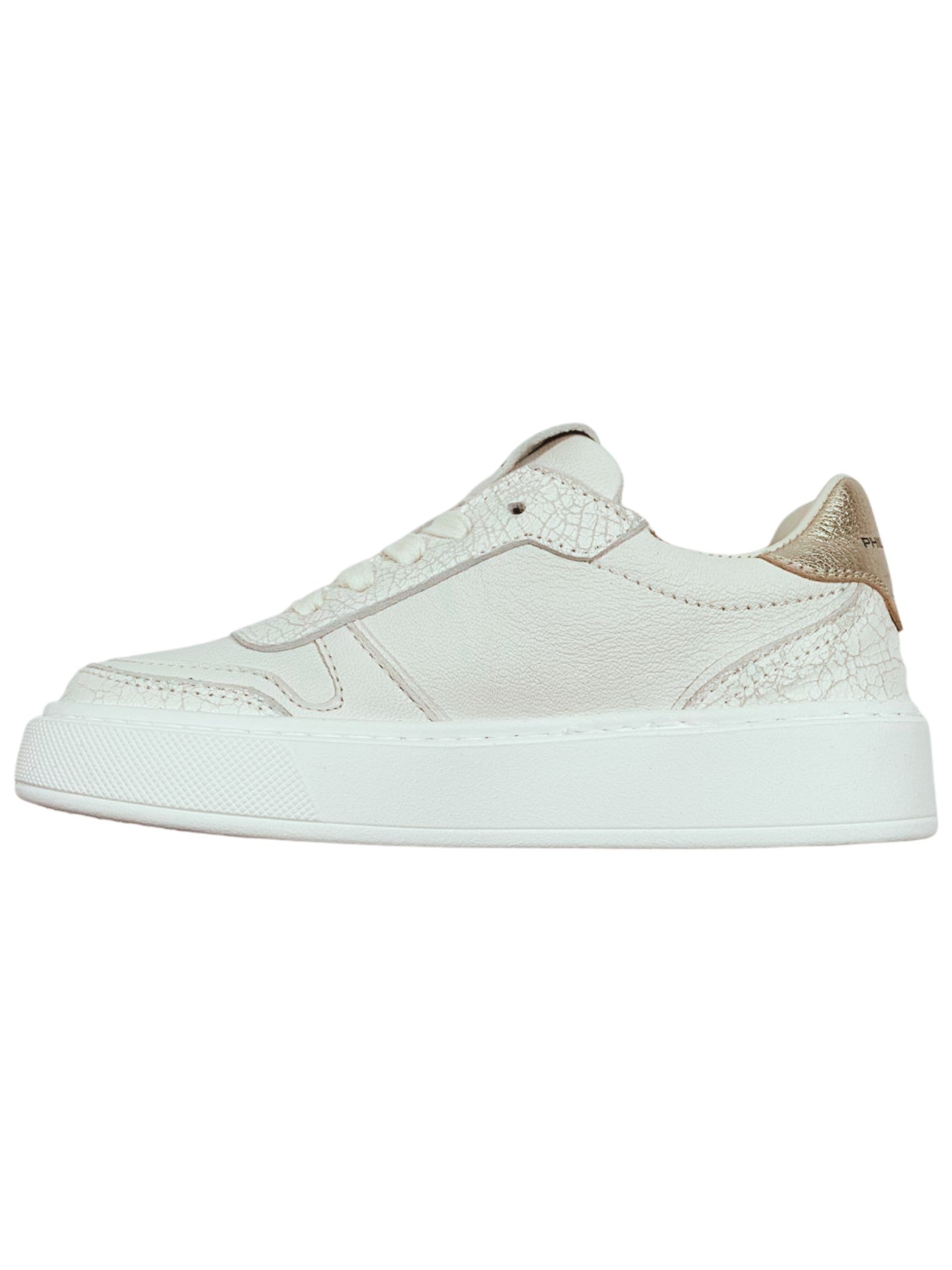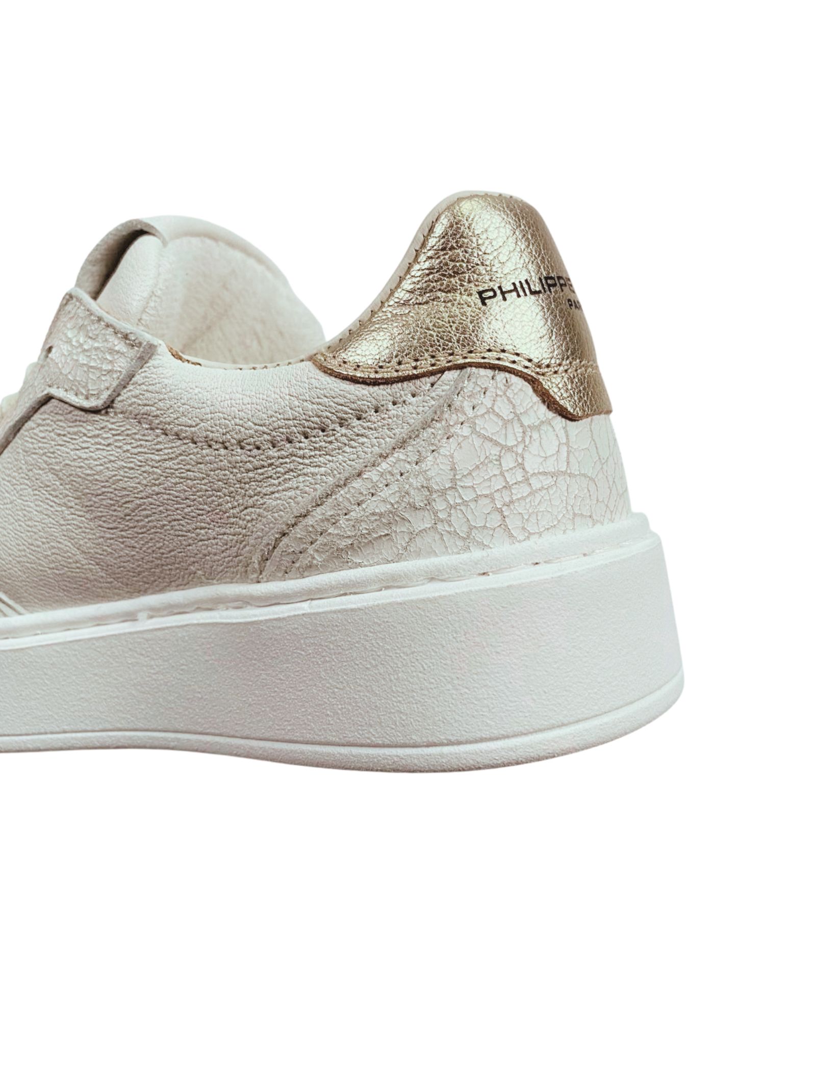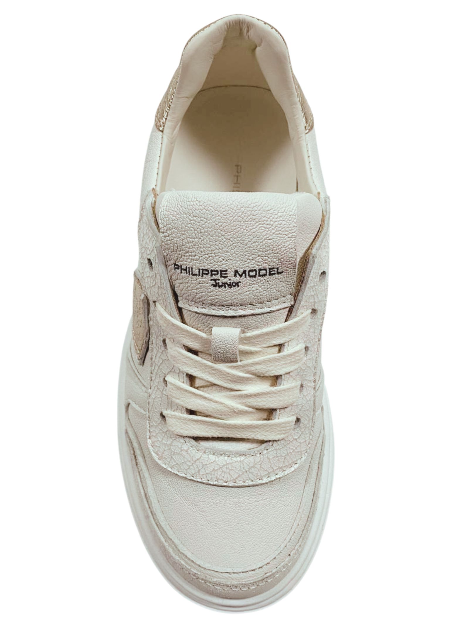 Philippe Model Kids sneakers di colore bianco/oro, realizzate in pelle liscia con inserto logato sul retro, modello low-top caratterizzato da una suola in gomma, chiusura frontale con lacci, insenature in tessuto martellato, applicazione laterale scudetto caratteristico del marchio. Made in Italy