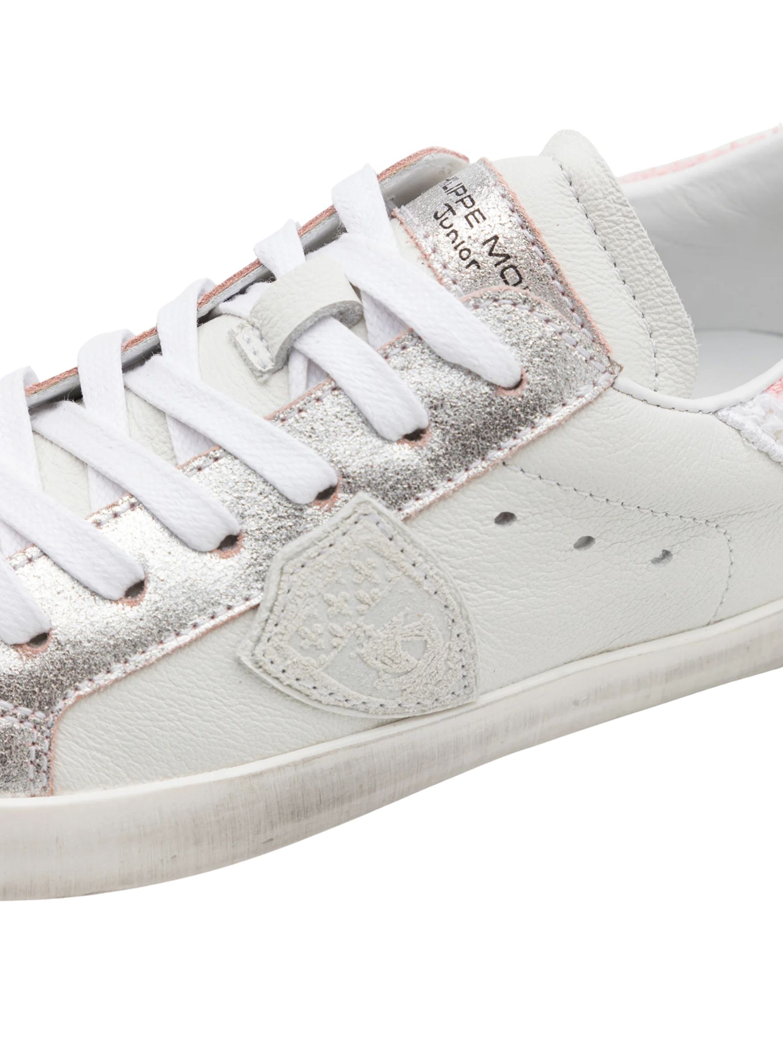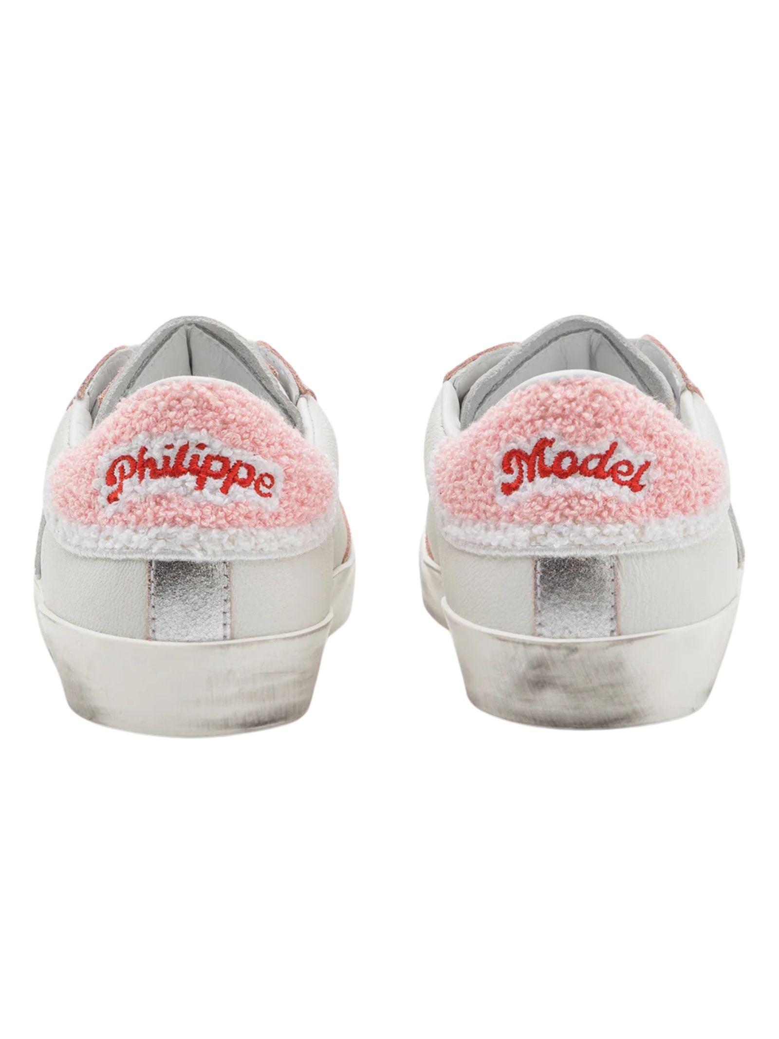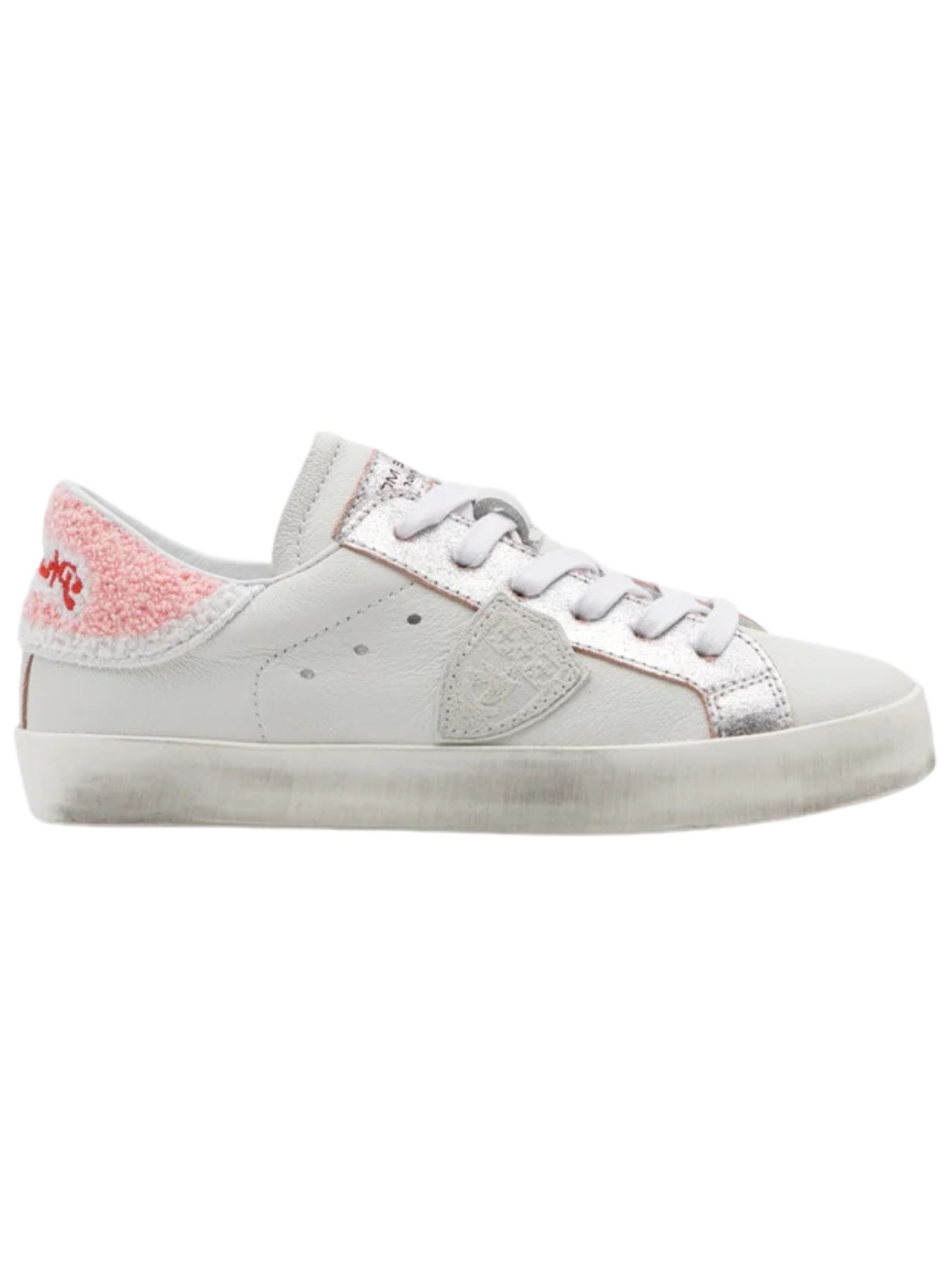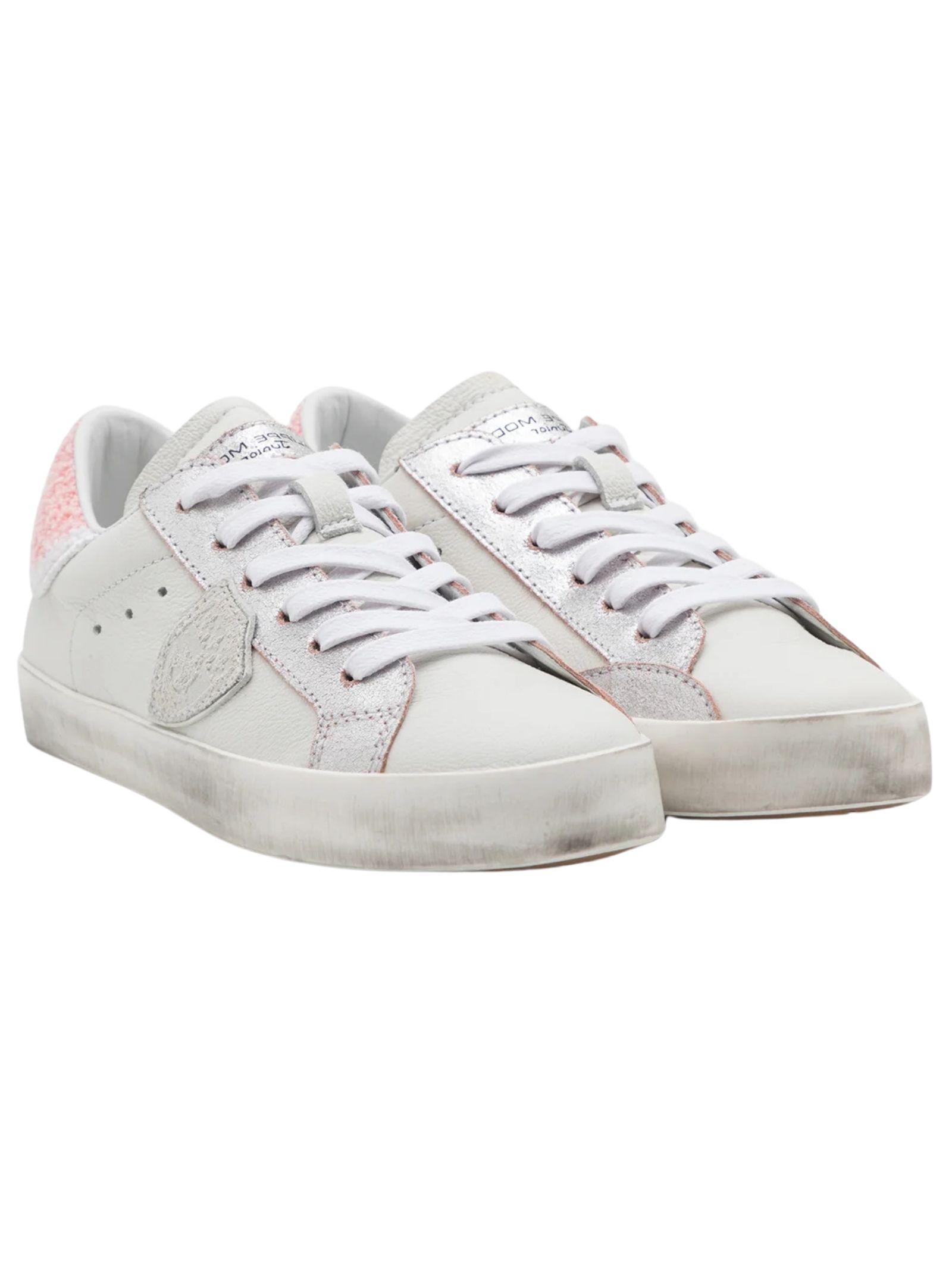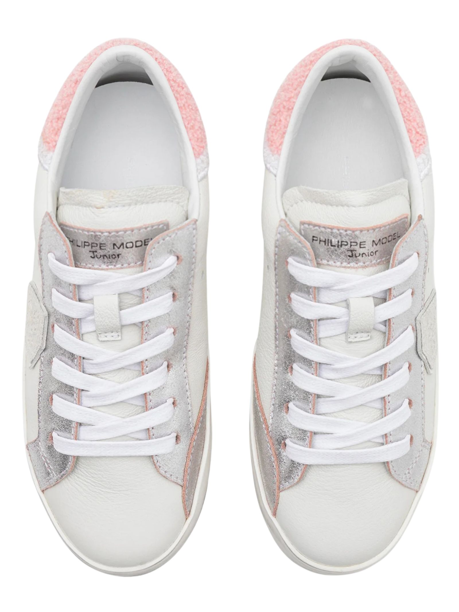 Philippe Model Kids sneakers di colore bianco/rosa, realizzate in pelle liscia con inserto sul retro effetto pelliccia con logo ricamato, insenature in argento, modello low-top caratterizzato da suola in gomma effetto consumato, punta tonda, chiusura frontale con lacci, applicazione laterale scudetto caratteristico del marchio. Esterno: pelle di vitello 100%. Made in Italy