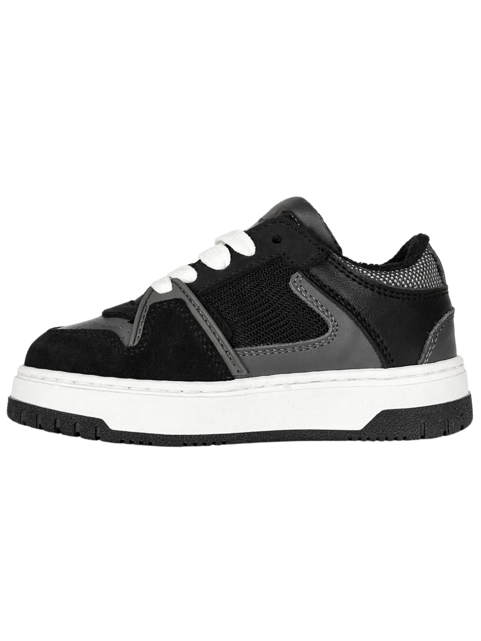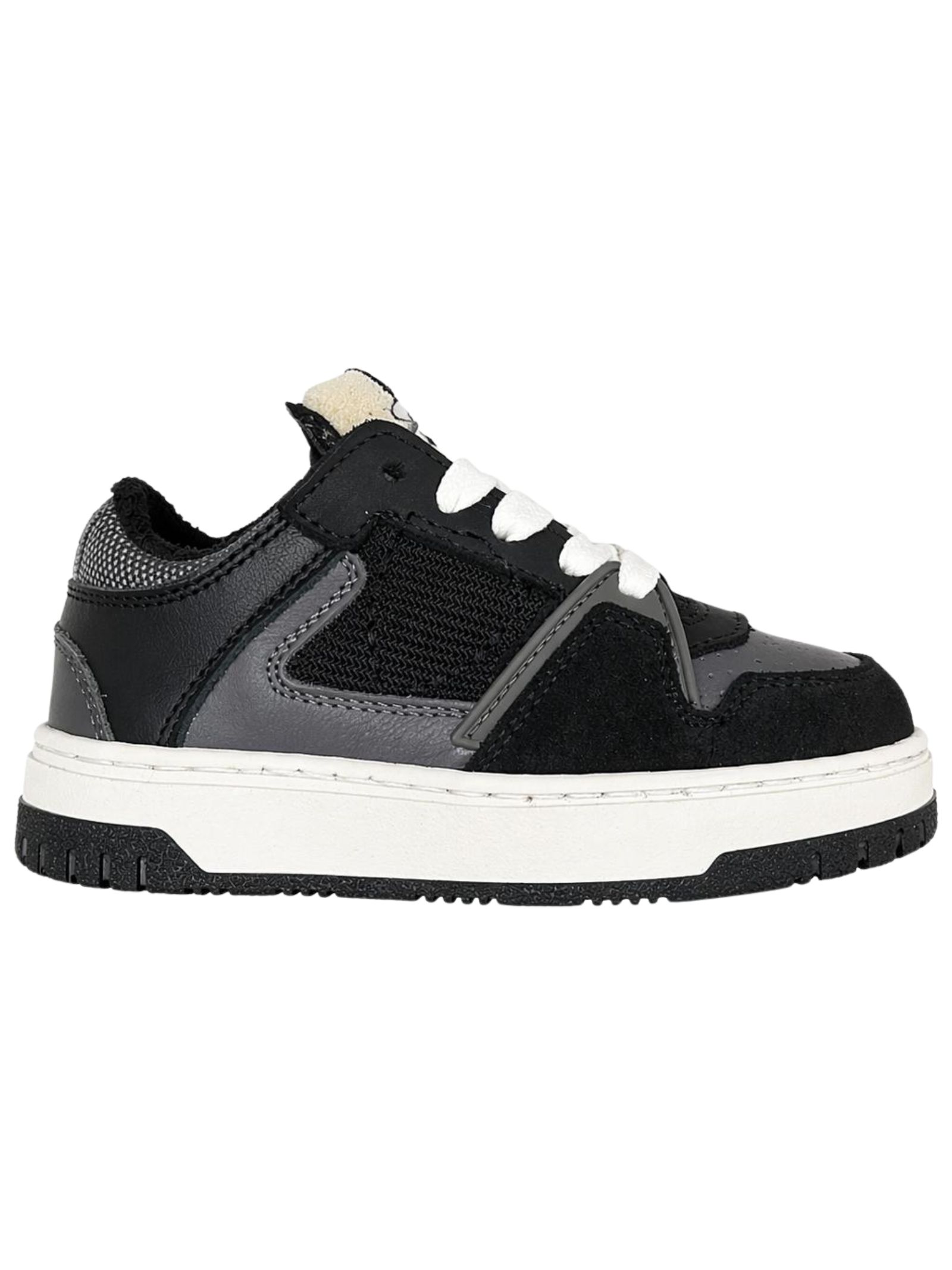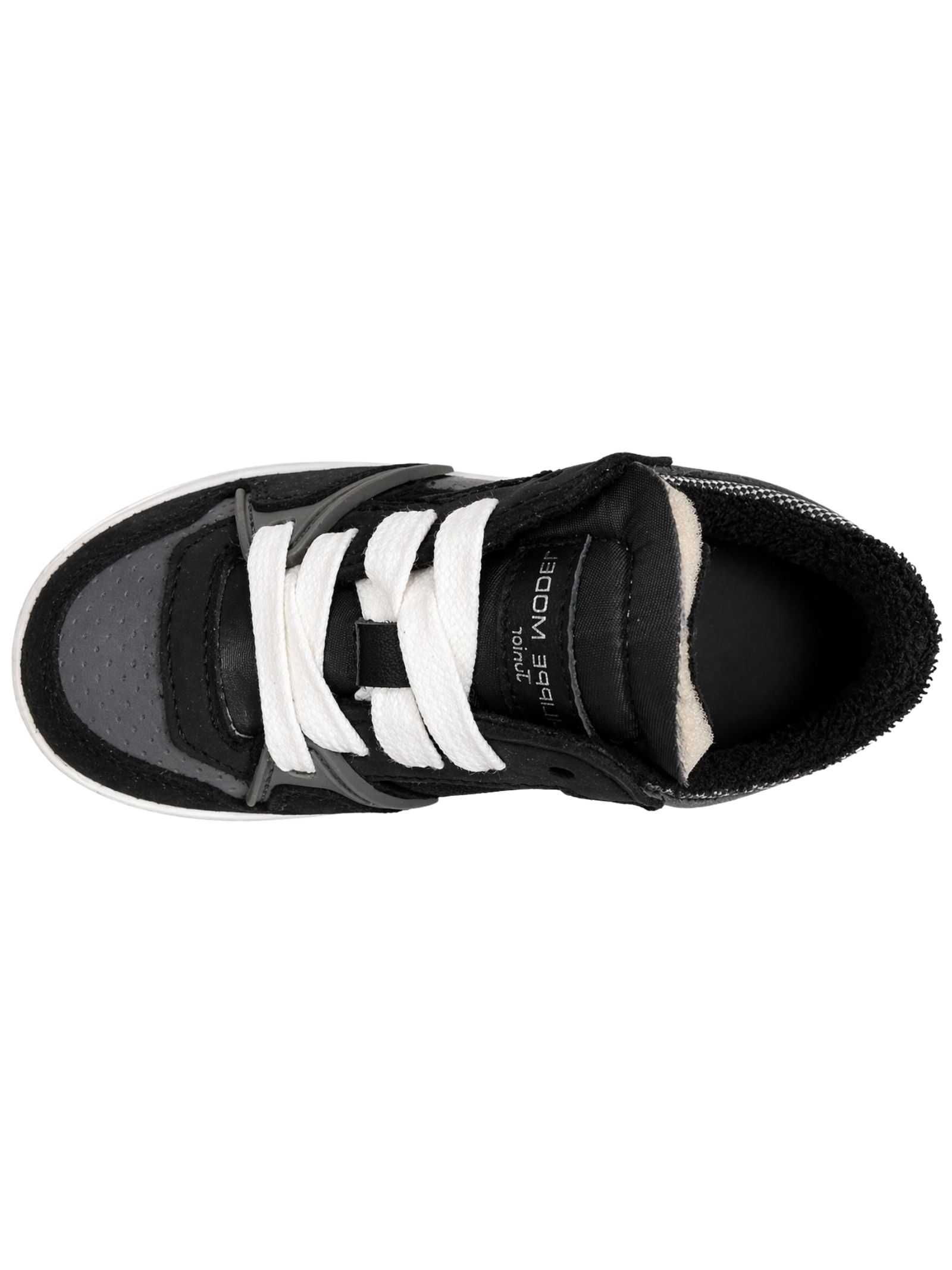 Philippe Model Junior scarpe di colore nero/grigio realizzate in camoscio e nylon, stile sportivo, stringata, punta tonda, logo stampato sulla linguetta anteriore, caviglia imbottita, low-top, interni in pelle liscia e spugna, suola in gomma banca. Made in Italy