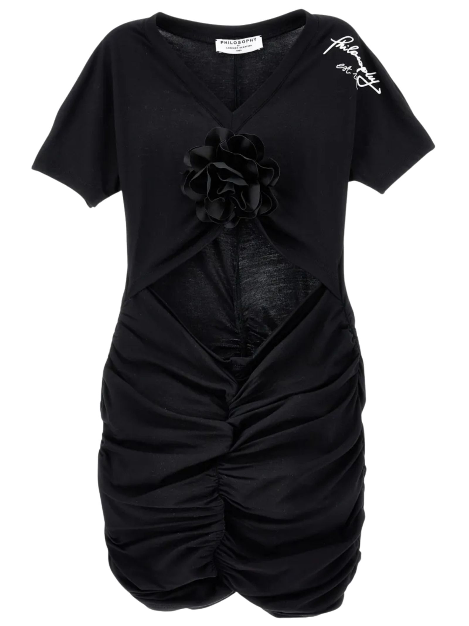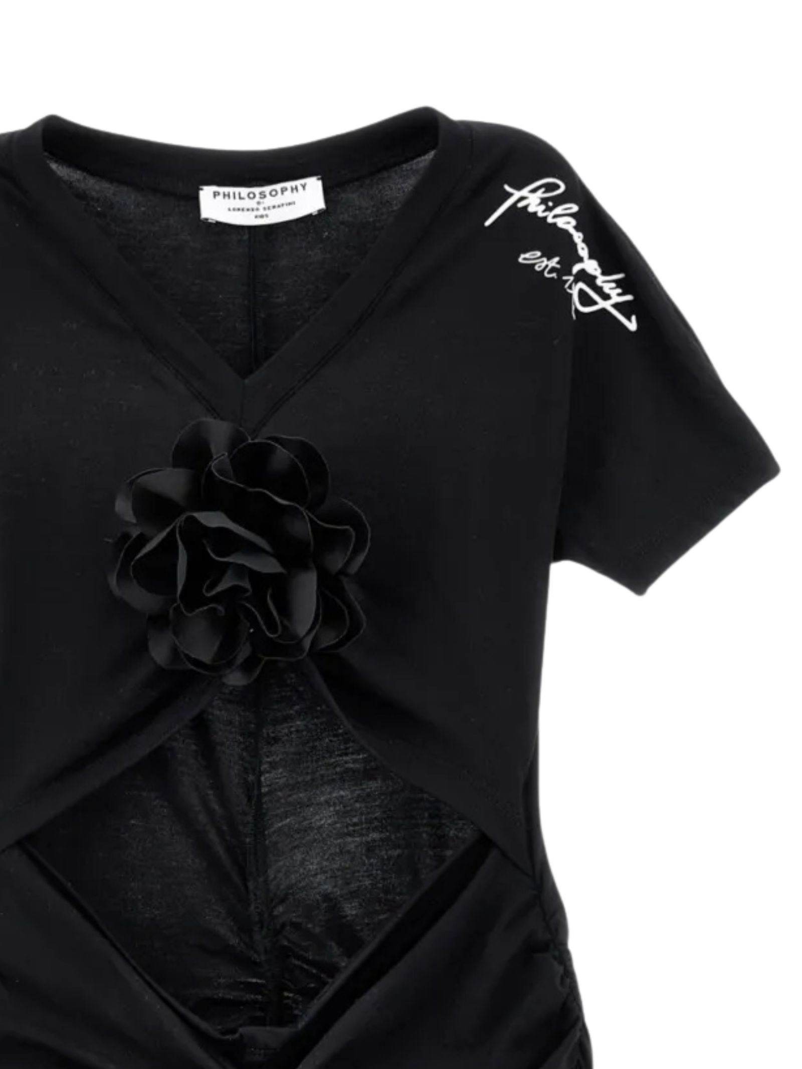 Philosophy Kids abito di colore nero, design slip-on, scollo a V, mezza manica, dettaglio scollato, applicazione fiore, design arricciato, stampa logo, modello aderente. Composizione: 100% poliestere. Made in Italy