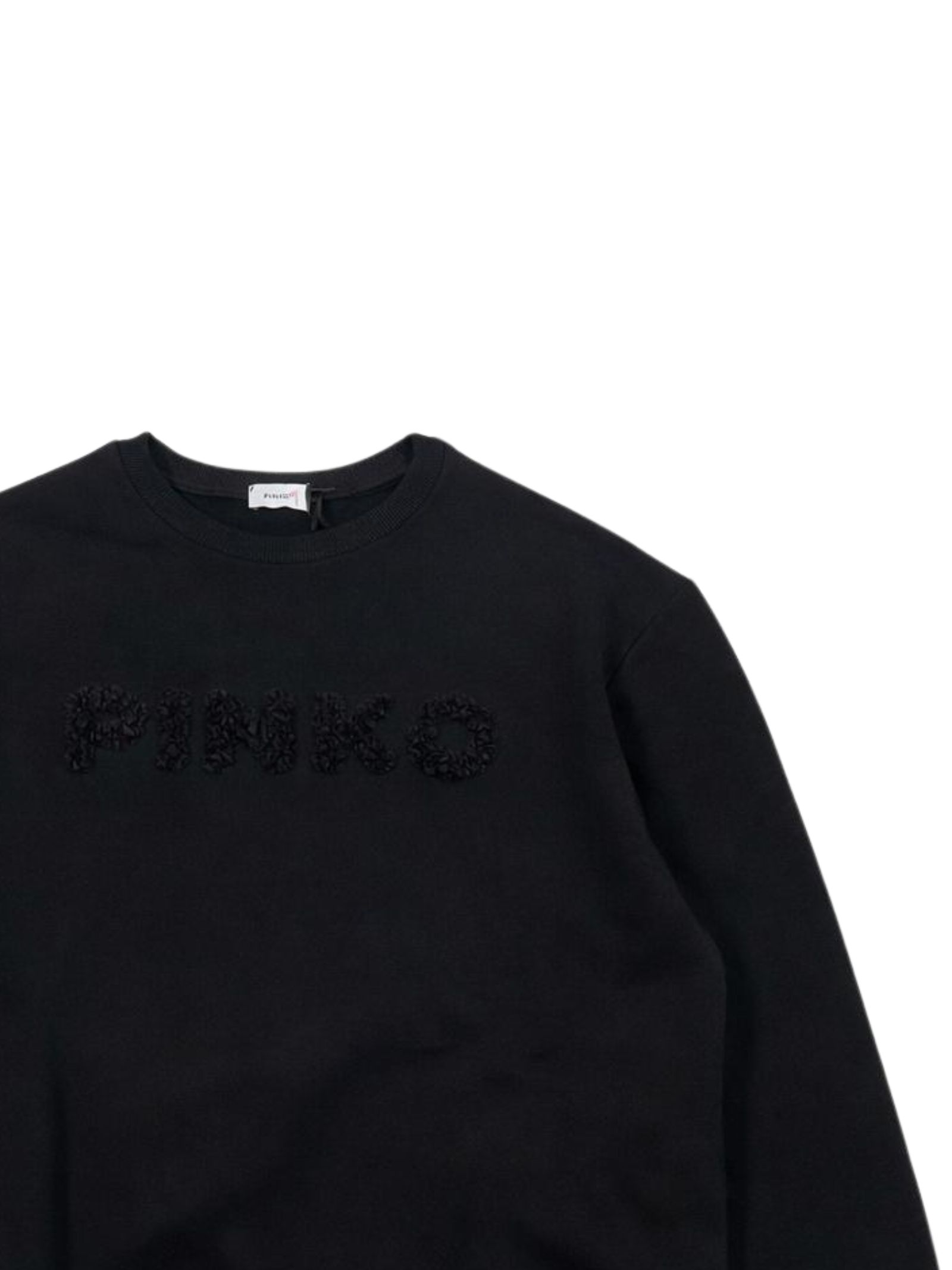 Pinko Kids felpa di colore nero, logo centrale in rilievo, modello girocollo, maniche lunghe, orli a costine, vestibilità ampia. Composizione: 65% Cotone 35% poliestere. Made in Italy