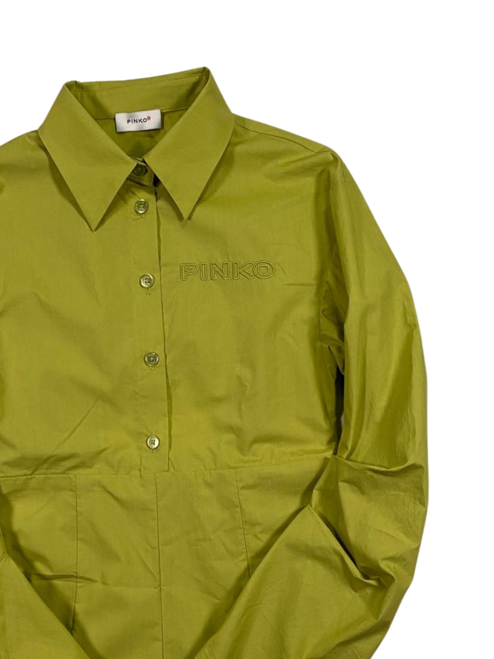 Pinko Kids tuta intera di colore verde, modello con schiena scoperta, design a pantaloncino, maniche lunghe con dettaglio arricciatura, ricamo logo sul petto, vestibilità regolare. Composizione: 100% cotone